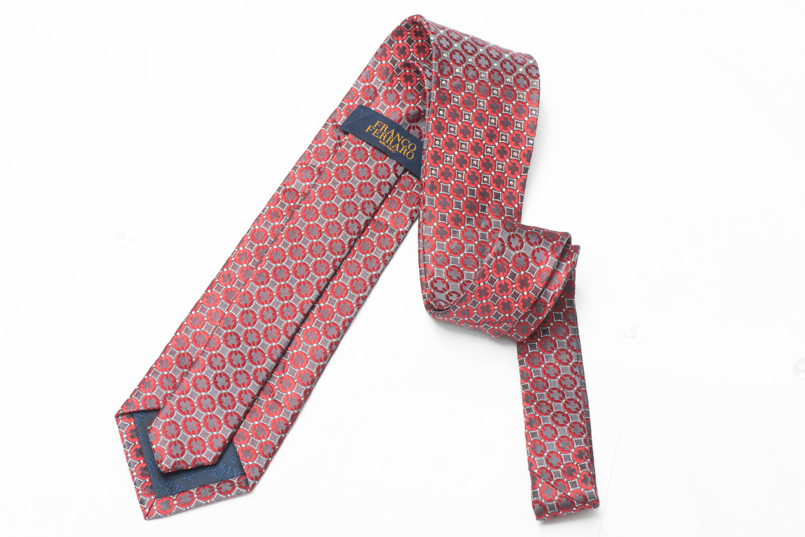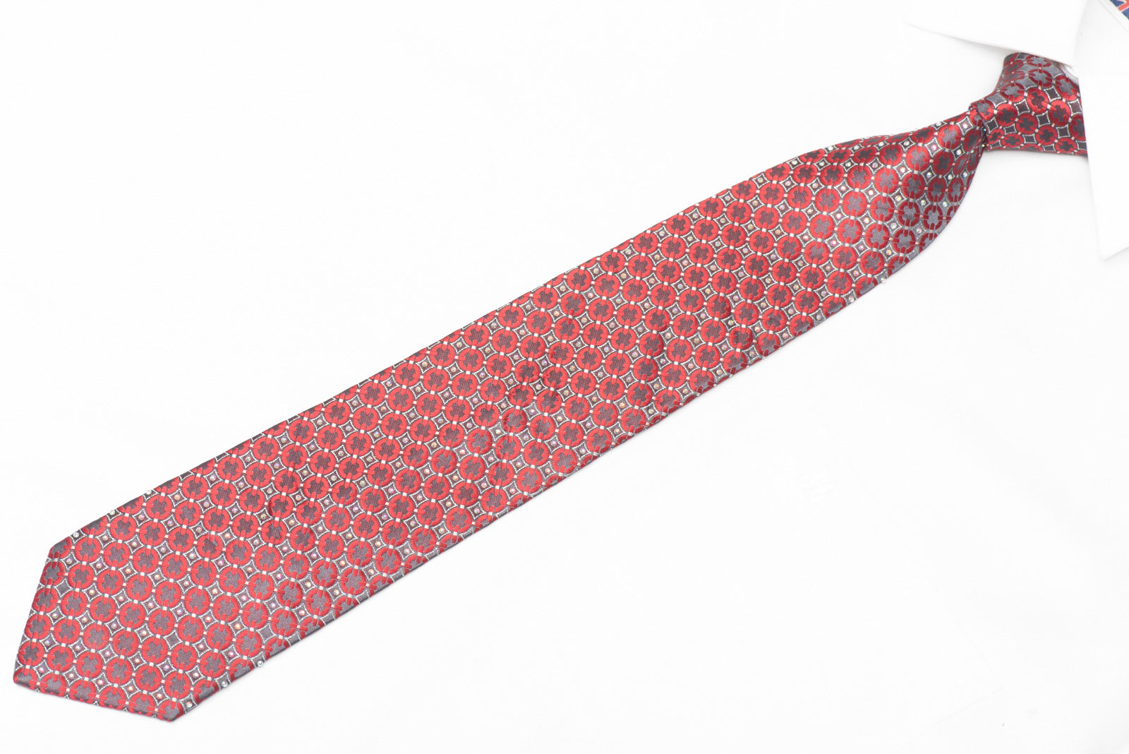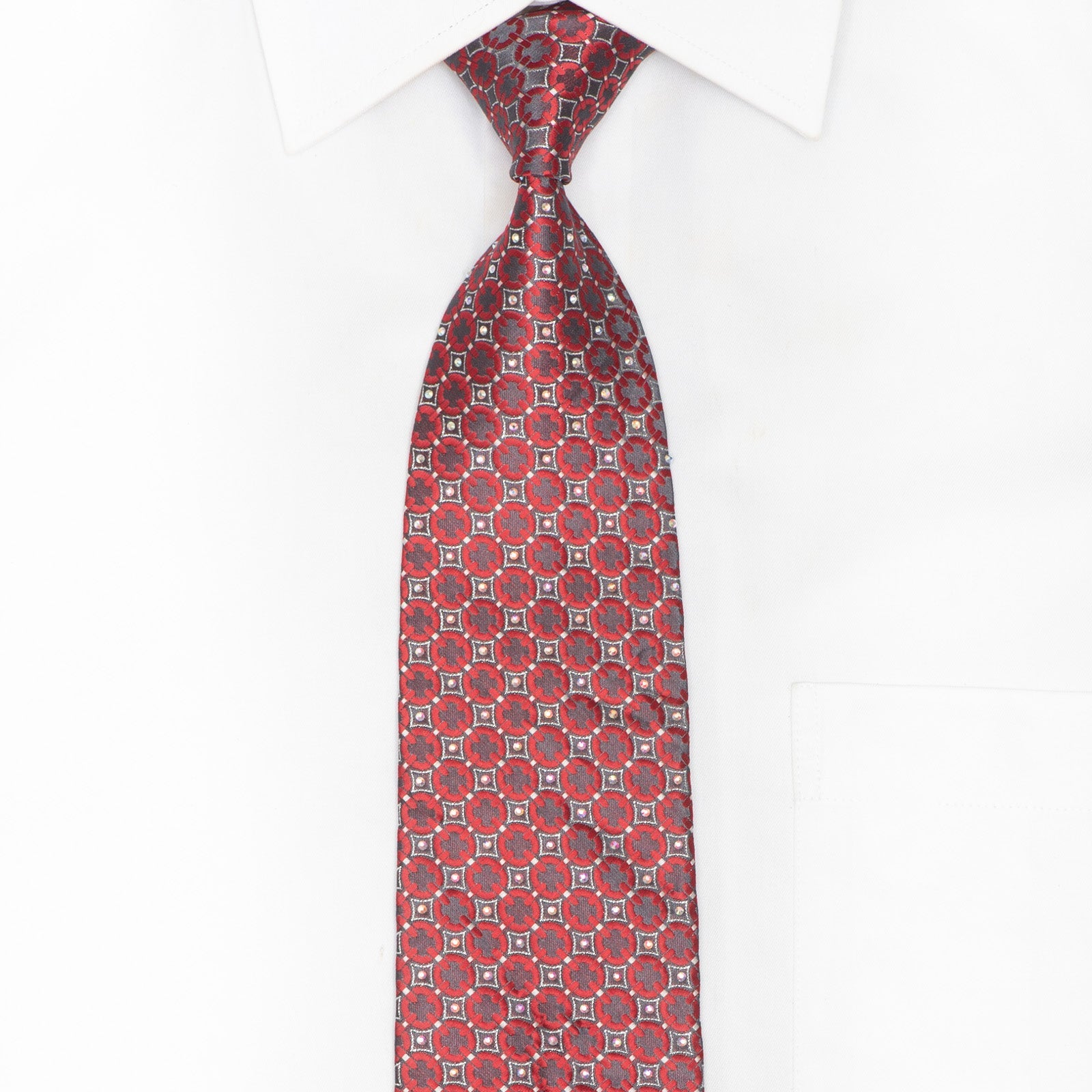 Material - Seda Design - Geométrico Cor - Borgonha, Prata Comprimento - Clássico (48 pol.-60 pol.)(145 cm-153 cm) Largura - Clássico (3 1/4 pol.) (8,5 cm) Recursos especiais - Strass, brilhos prateados Fornecedor - Franco Ferraro