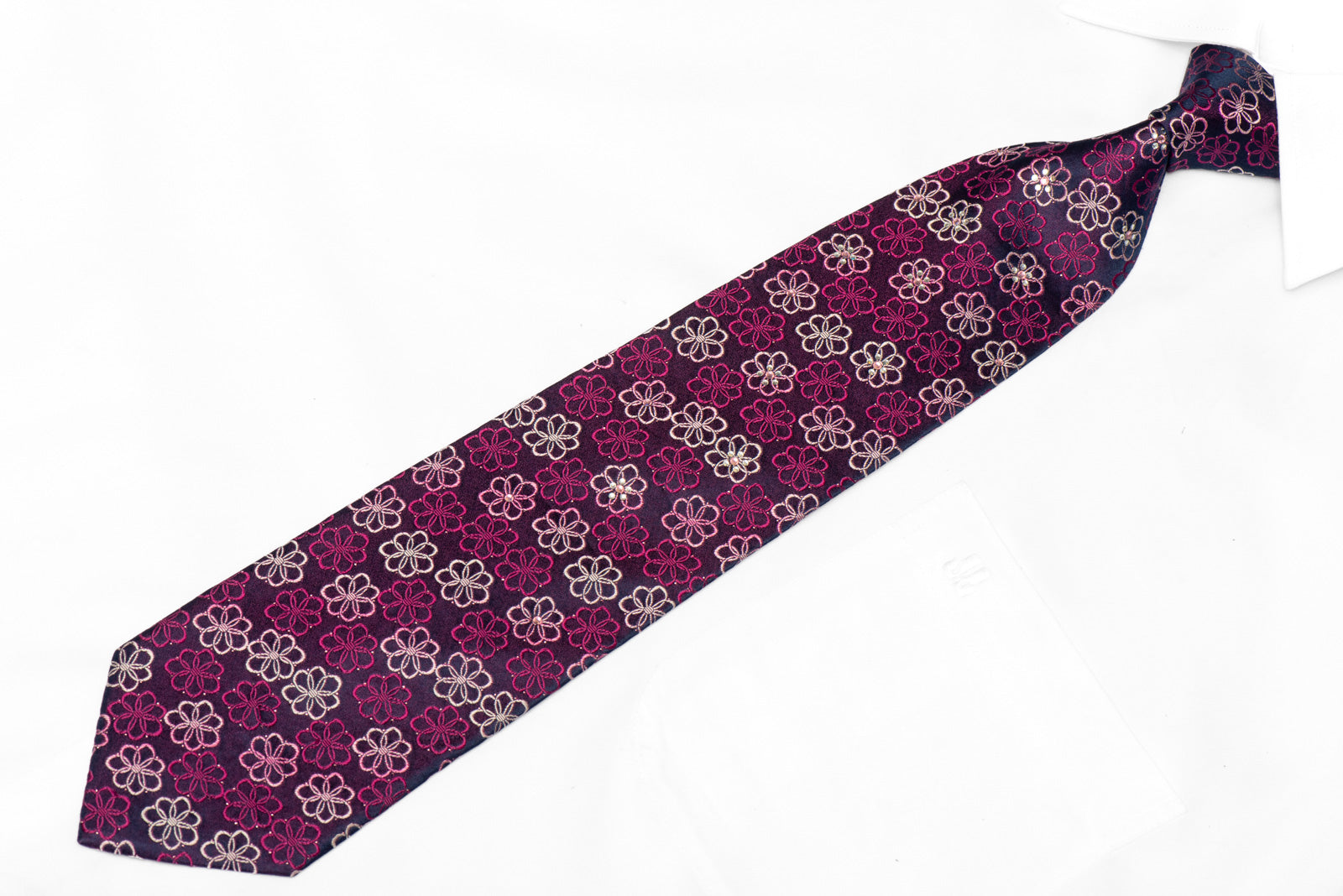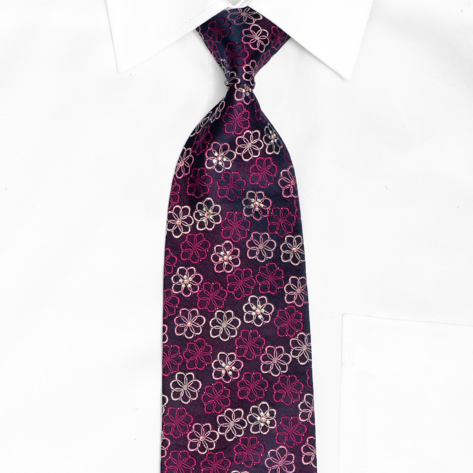Looking to take your outfit to the next level? Add a touch of elegance with our Purple Pink Floral On Navy Blue Rhinestone Necktie With Purple Sparkles. Elevate your style and make a statement with this stunning accessory.