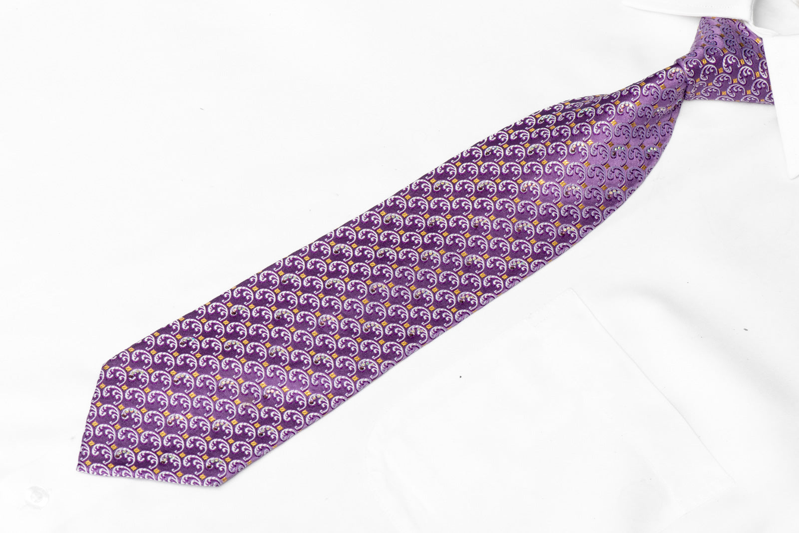 This necktie features delicate gold squares and filigree patterns on a mauve silk base, adorned with shimmering rhinestones and subtle gold sparkles for an elegant touch.
