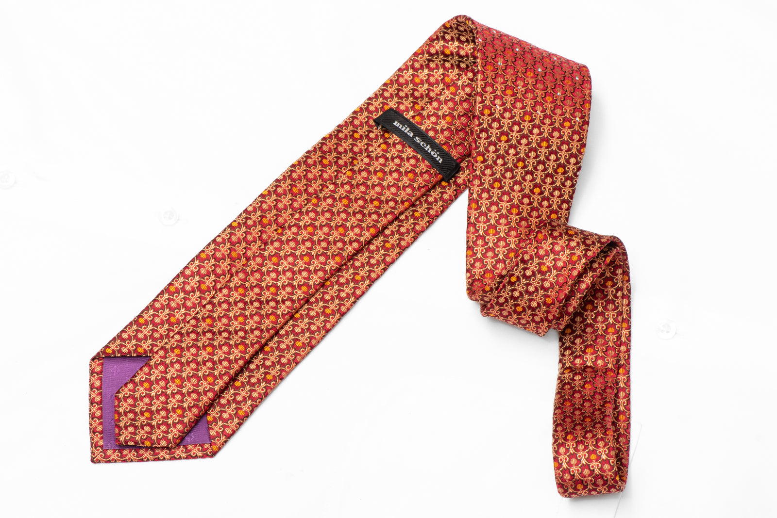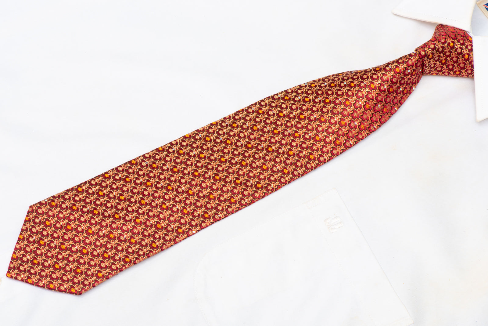 Add a touch of luxury and sophistication with our Gold Cartouche On Burgundy Rhinestone Silk Necktie. Made with high-quality silk and adorned with sparkling gold accents, this tie is perfect for formal events or adding a touch of elegance to any outfit. Elevate your style with this timeless and unique accessory.