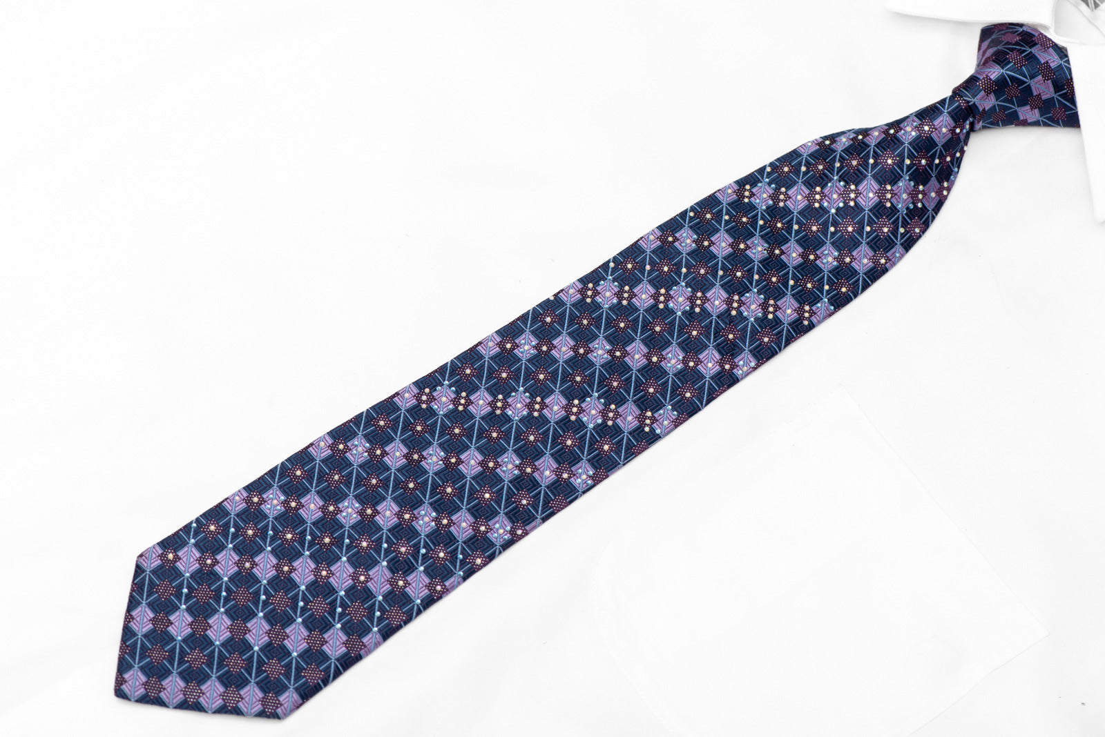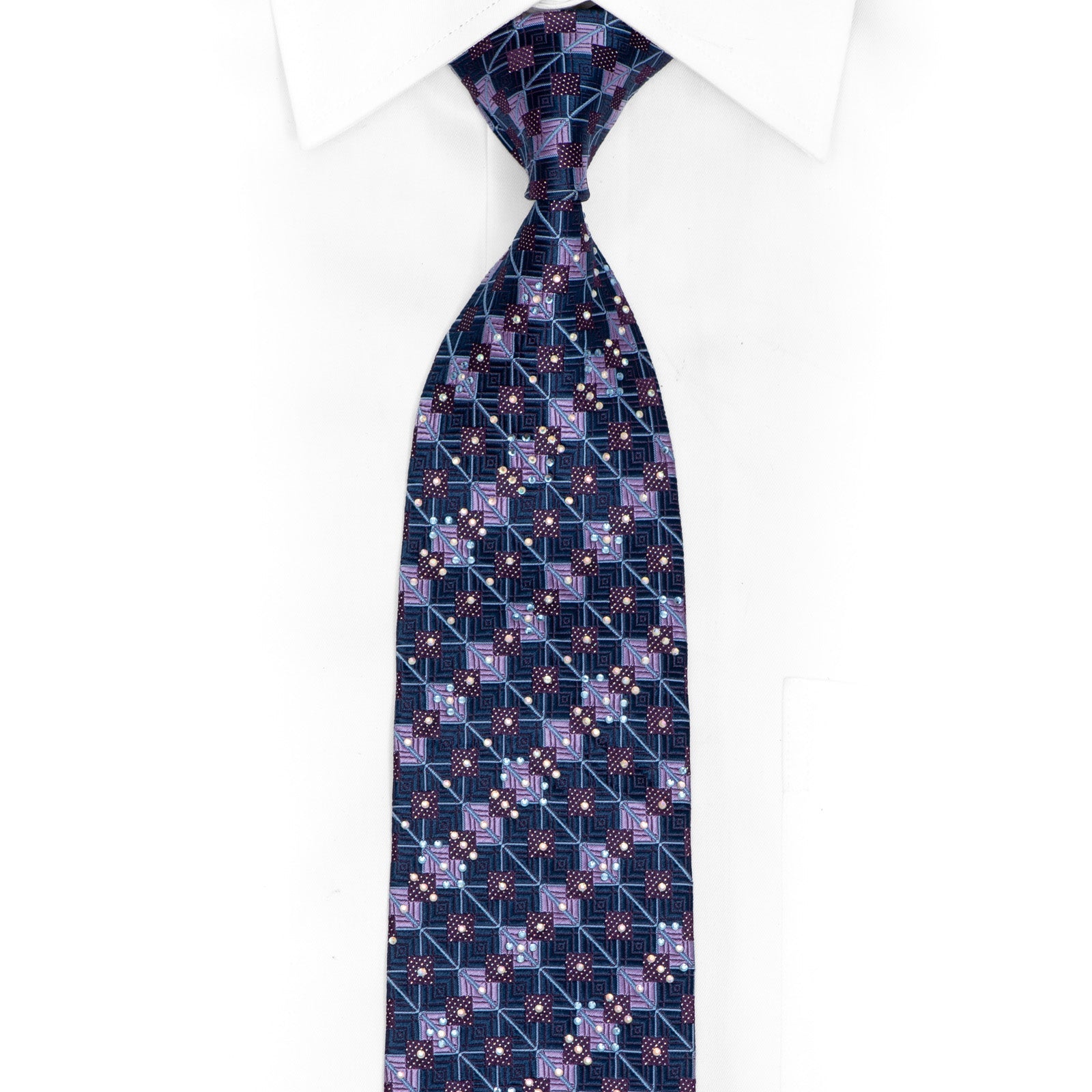 This tie features a navy blue background adorned with a mauve blue checkered trellis pattern, enhanced by sparkling silver rhinestones for a refined and stylish touch.