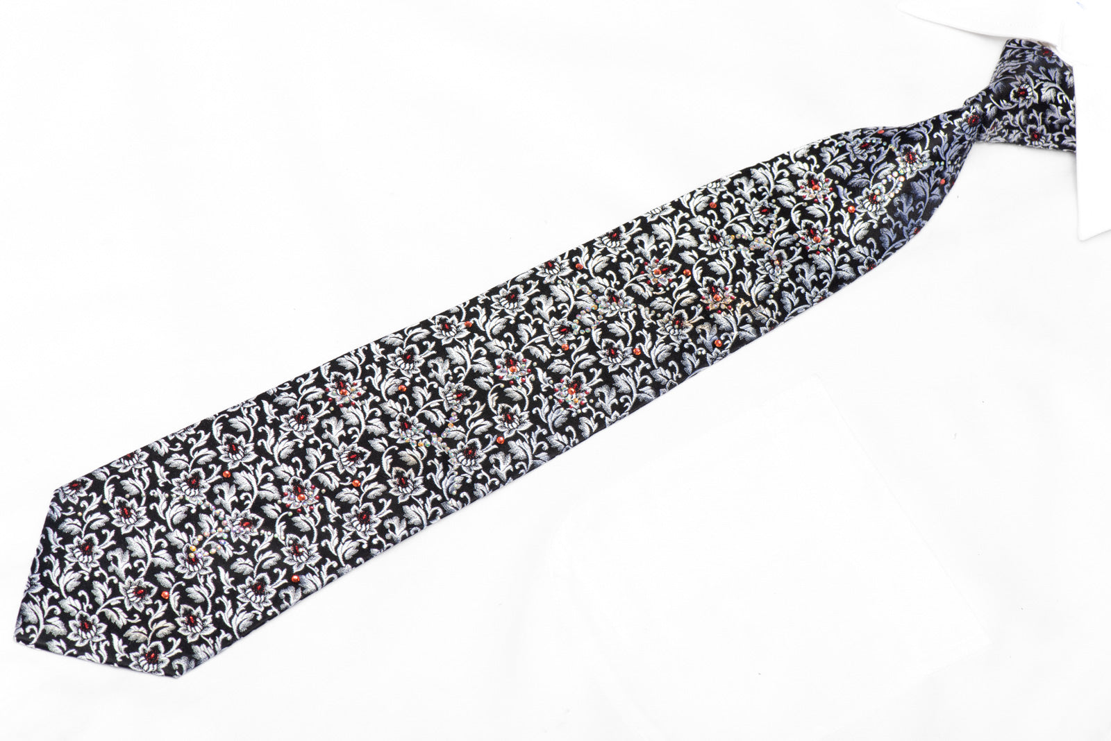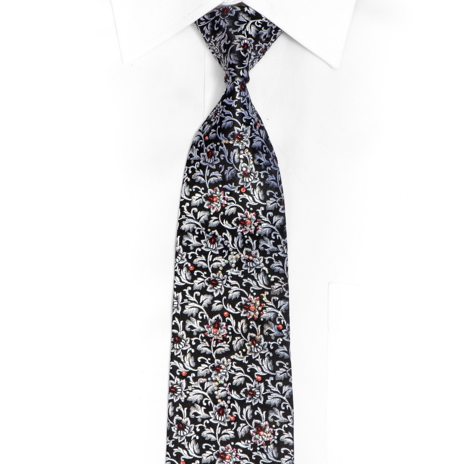 This Silver Floral On Black Rhinestone Silk Tie With Red Sparkles will add a touch of elegance to your outfit.