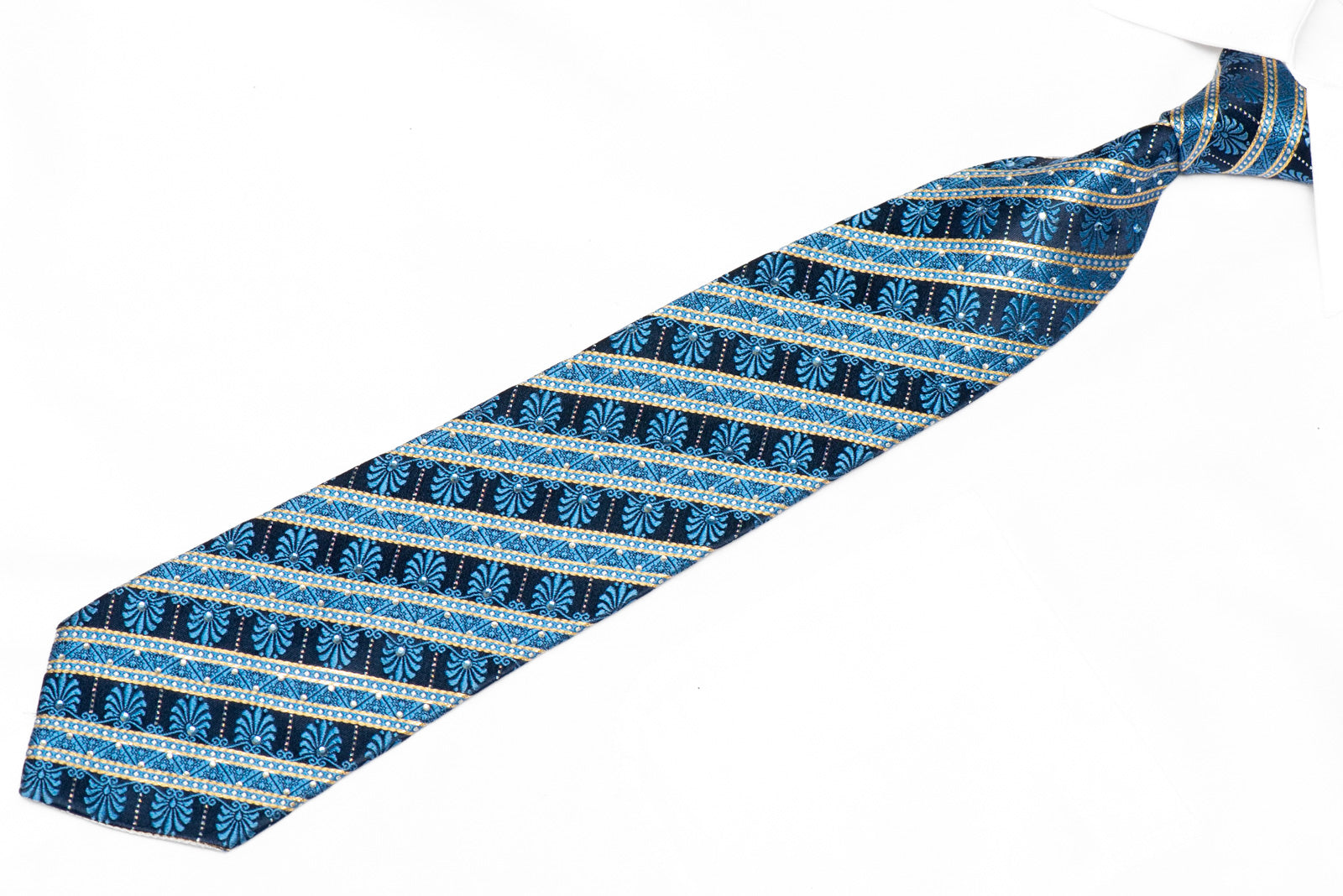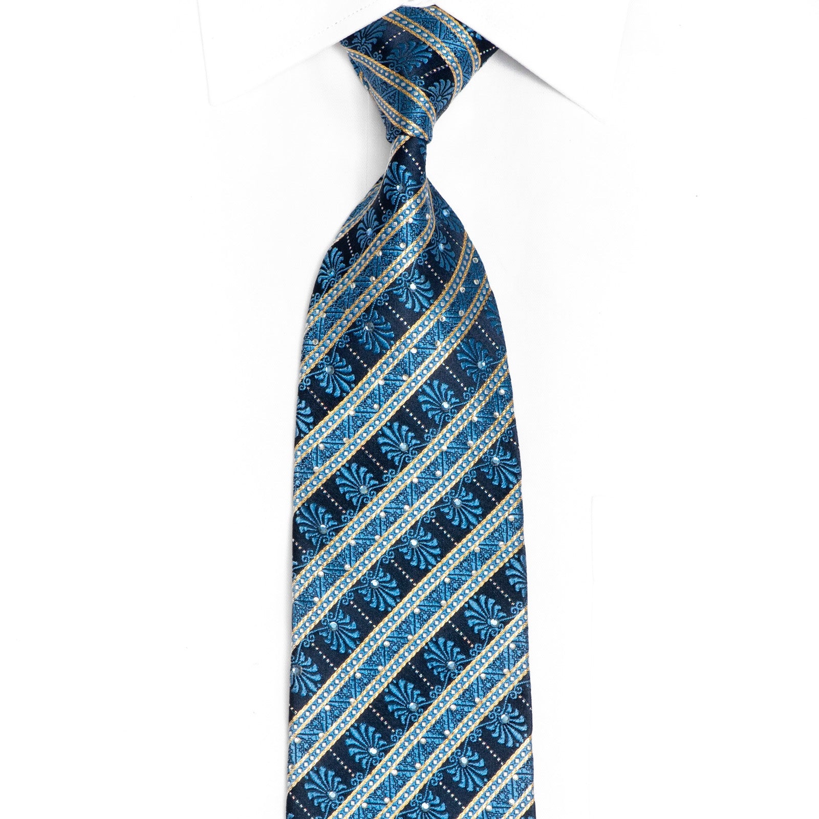 Looking for something sophisticated and stylish to add to your wardrobe? This Striped Anthemion On Blue Rhinestone Silk Tie With Gold Sparkles is the perfect addition.