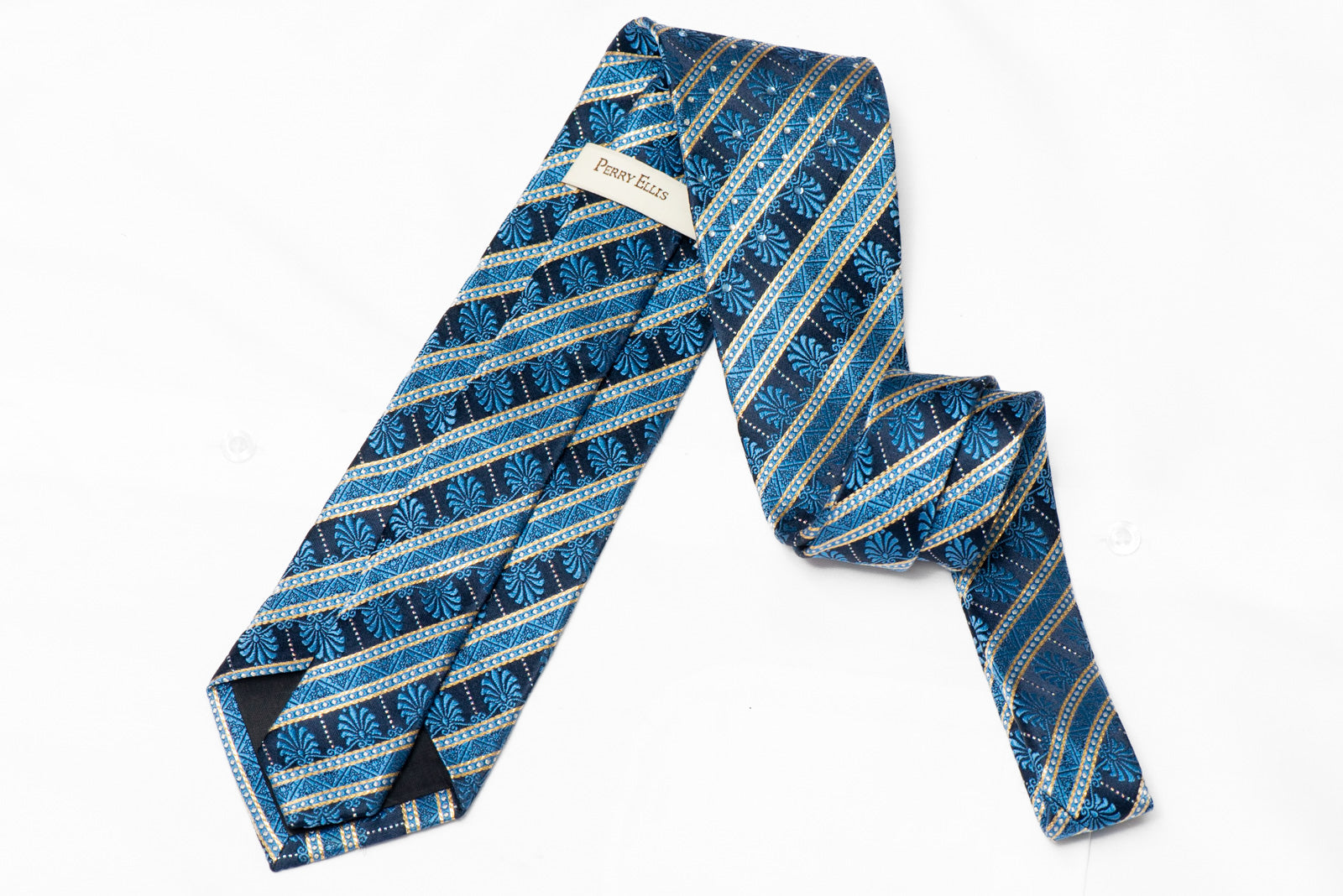 Material - Silk Design - Striped Cor - Blue, Gold Comprimento - Classic (48 in.-60 in.)(145cm-153 cm) Largura - Classic (3 1/4 in.-3 3/4 in.)(8 cm-9.5 cm) Recursos especiais - Rhinestones, Silver Sparkles Fornecedor - Perry Ellis