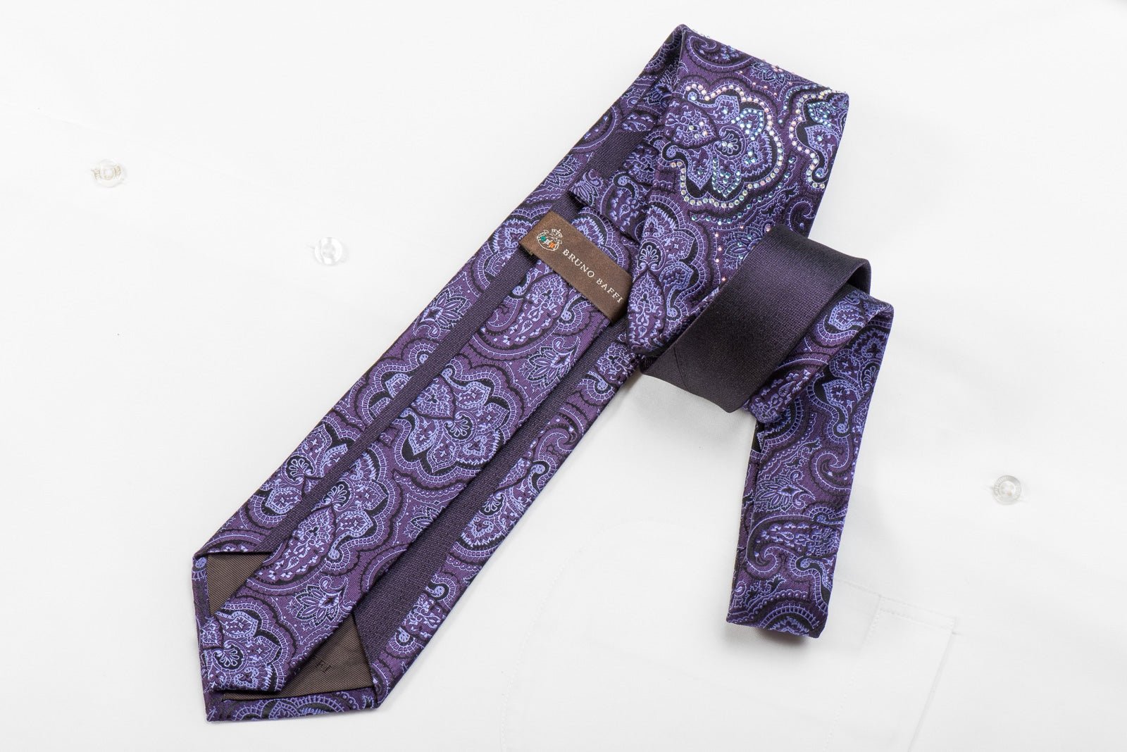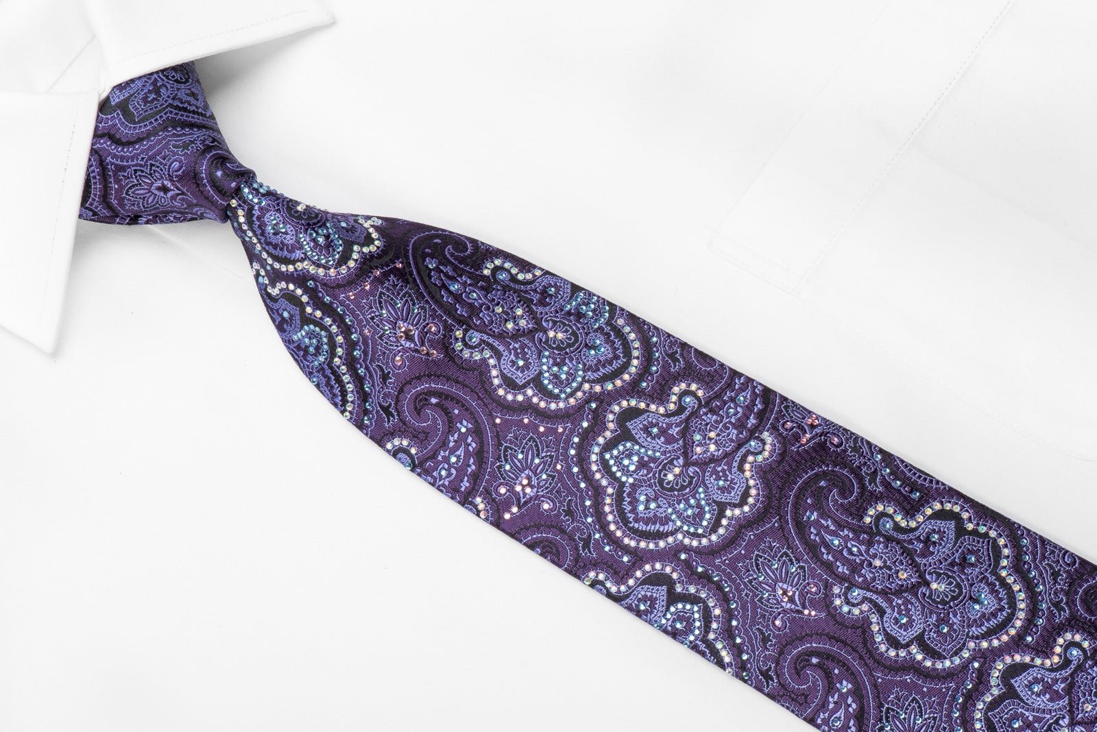 Gravata de cristal masculina bonita perfeita para todas as ocasiões feita à mão da seda de melhor qualidade e projetada pelo top de marca Bruno Baffi. Apresentando um elegante design de Anthemion Paisley em roxo, brilhando com branco claro, azul e cristal AB Rhinestones.