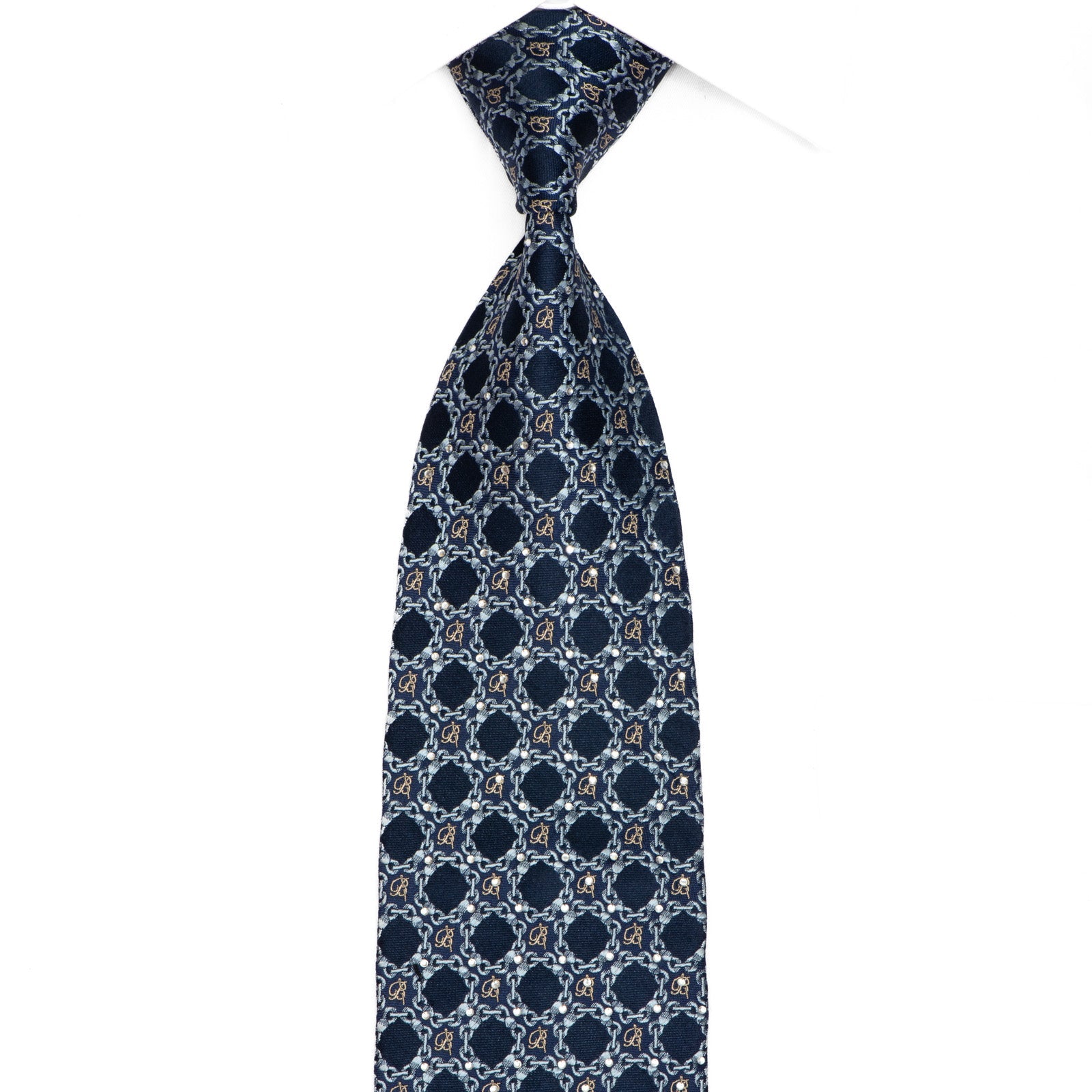 This stunning necktie features a blue silk base adorned with interlocking chains and sparkling rhinestones for a luxurious touch.