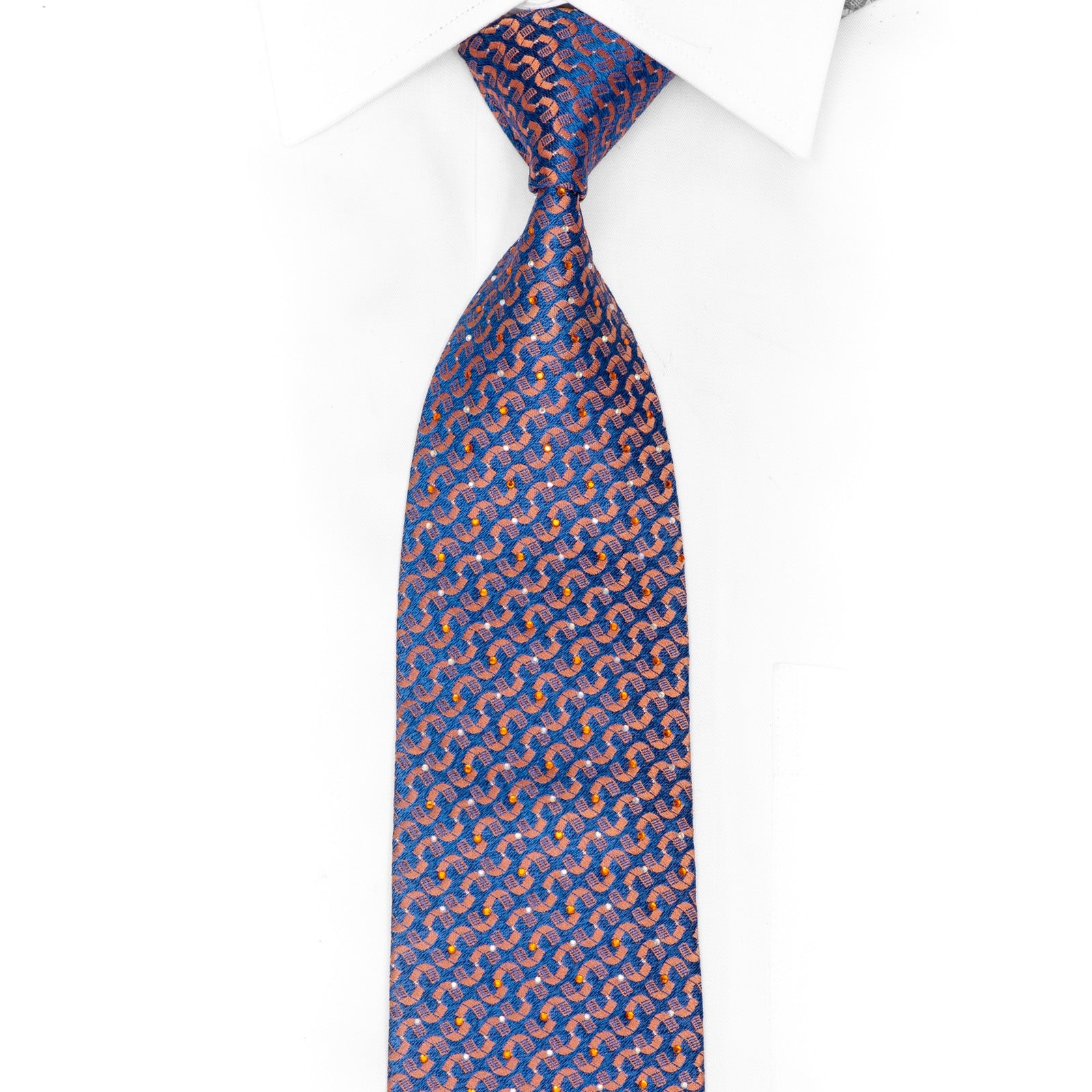 Elevate your style with this vibrant tie featuring an orange geometric pattern set against a deep blue background, adorned with shimmering silver rhinestones for a dazzling finish.