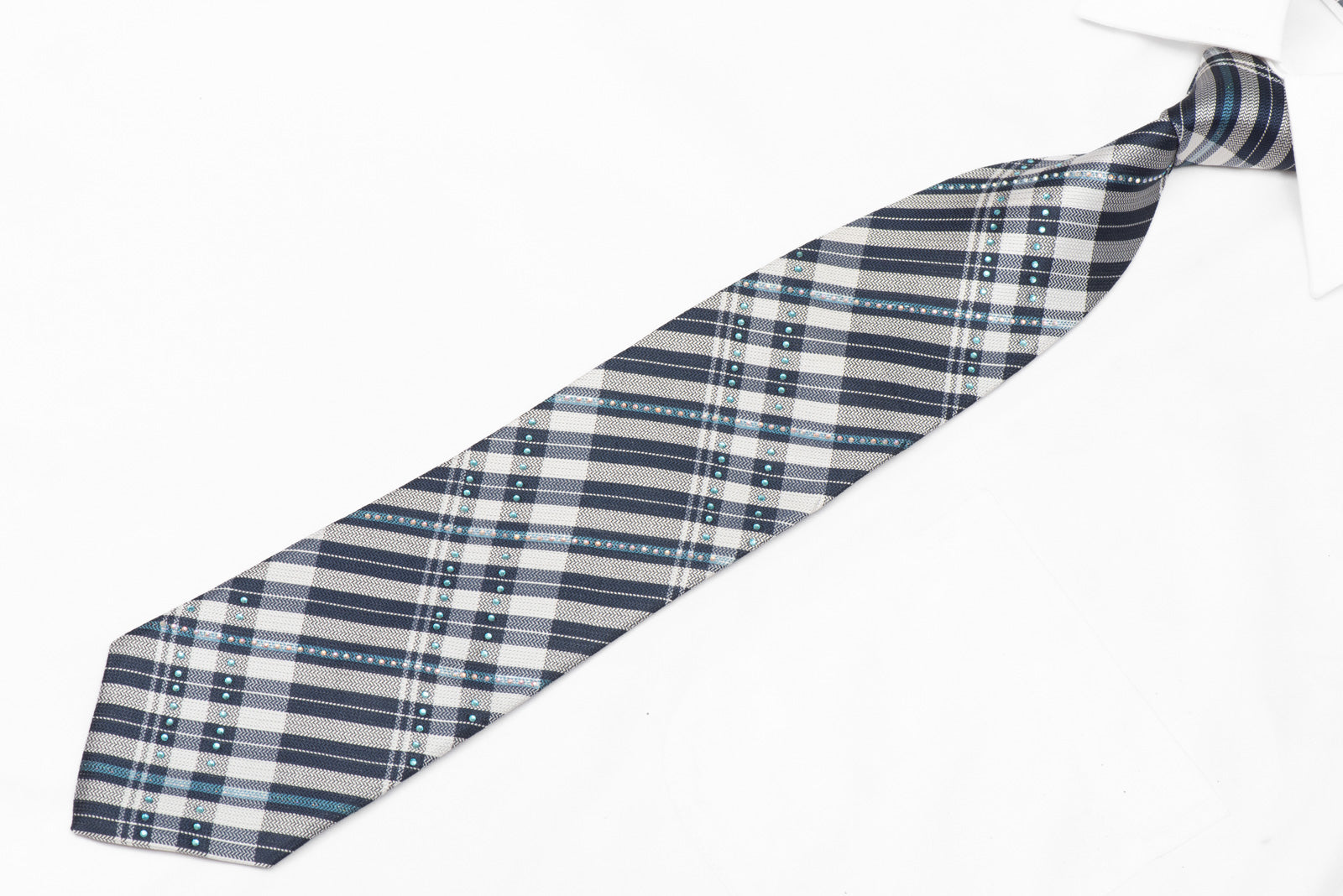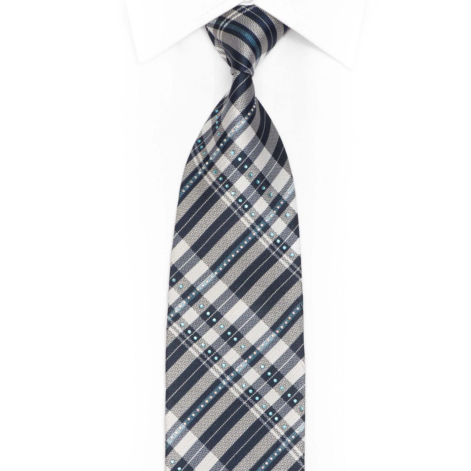 Looking for a stylish necktie that will add a touch of sparkle to your outfit? Check out our Silver Blue Plaid Rhinestone Silk Necktie! It's the perfect accessory to elevate any look with its silver sparkles.