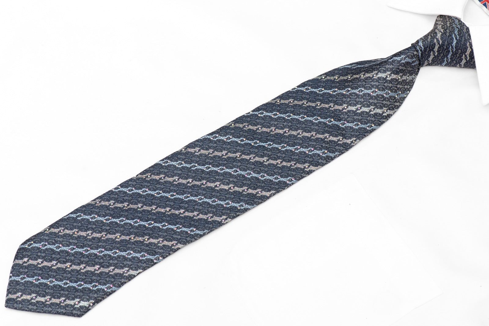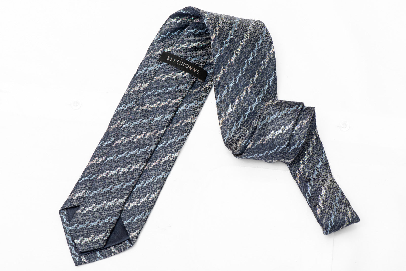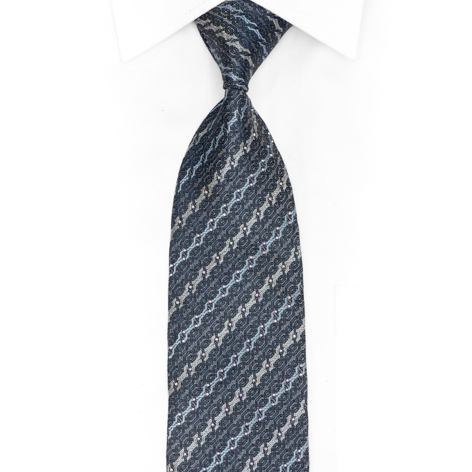 This sophisticated silk tie features an elegant blue geometric striped design on a silver, adorned with silver that add a refined sparkle.