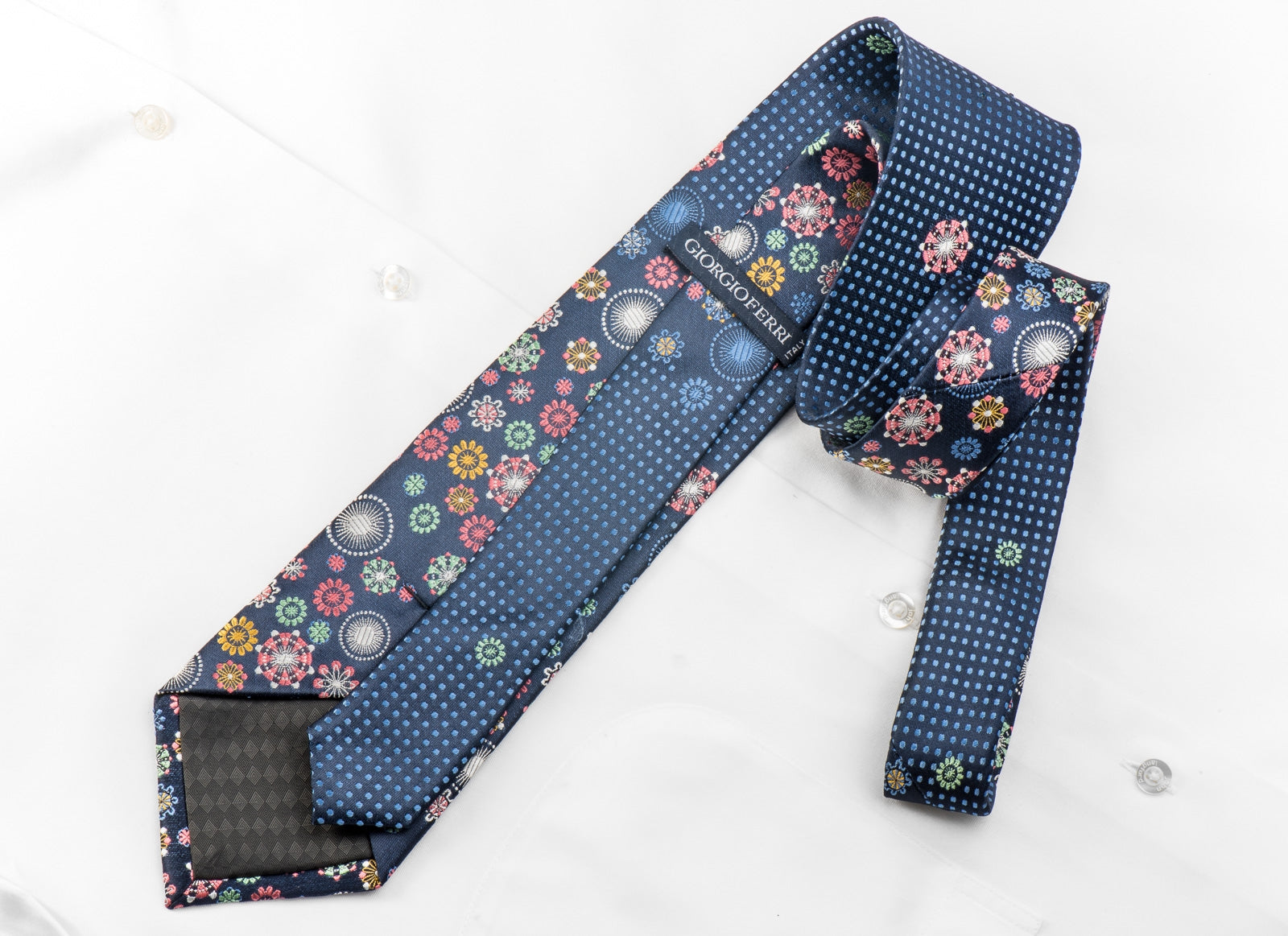 Gravata masculina bonita feita à mão da seda de melhor qualidade e projetada pelo top de marca Giorgio Ferri. Apresentando um maravilhoso design floral geométrico em azul escuro, brilhando com rhinestones de cristal azul e claro.