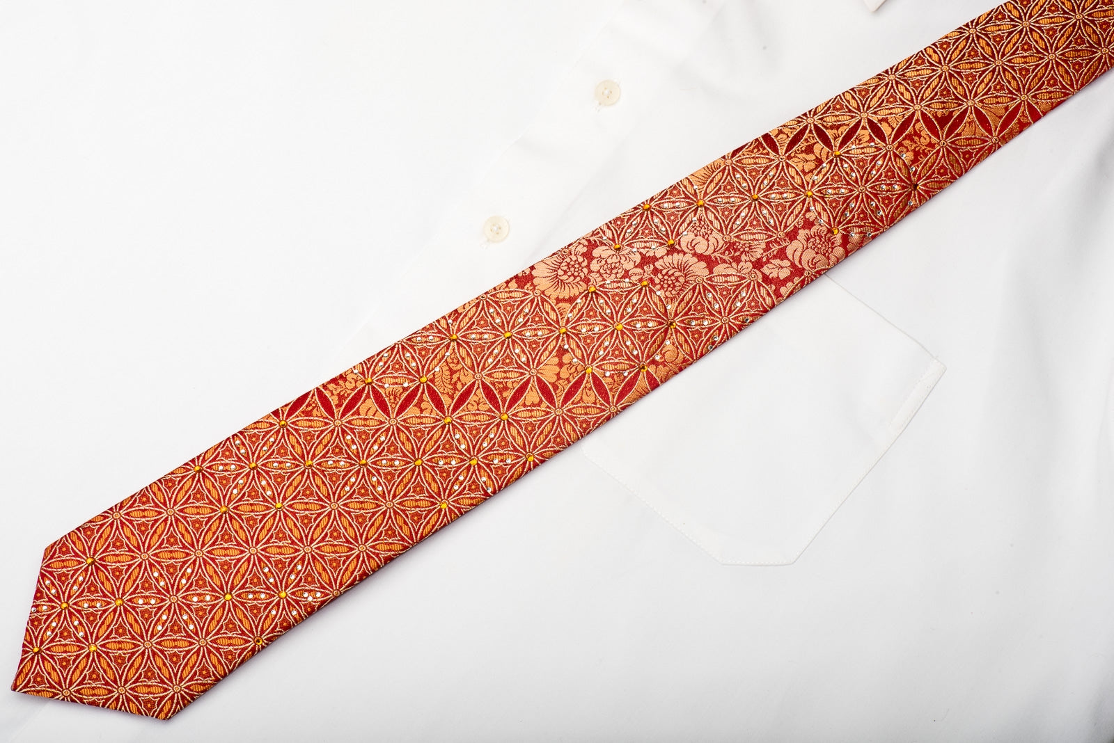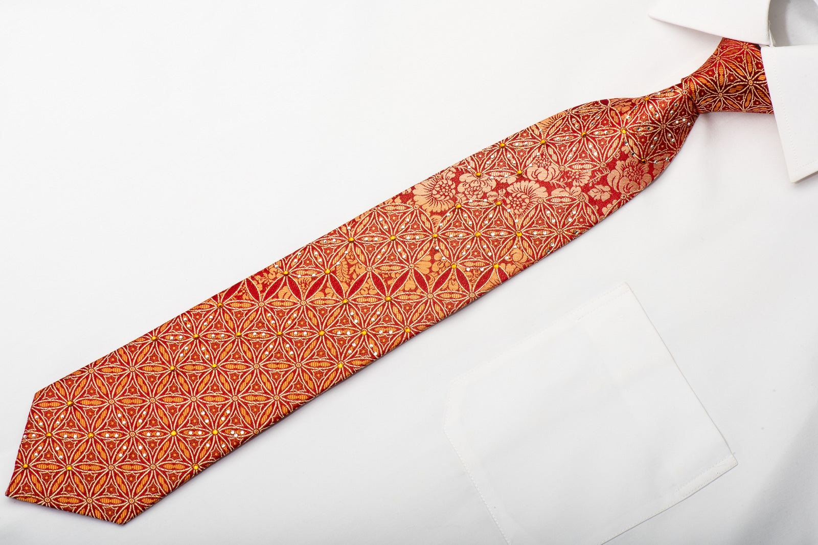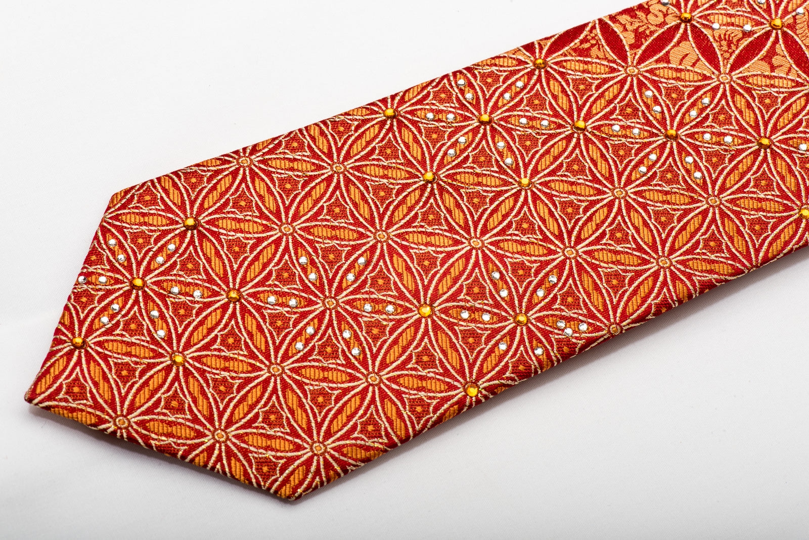 Gravata de seda masculina bonita feita à mão da seda de melhor qualidade e projetada pela marca remizio. Apresentando um maravilhoso design floral dourado em seda vermelha tecida, brilhando com claras strass de cristal branco e laranja, com brilhos prateados.