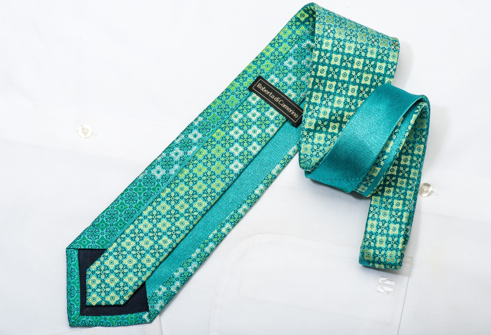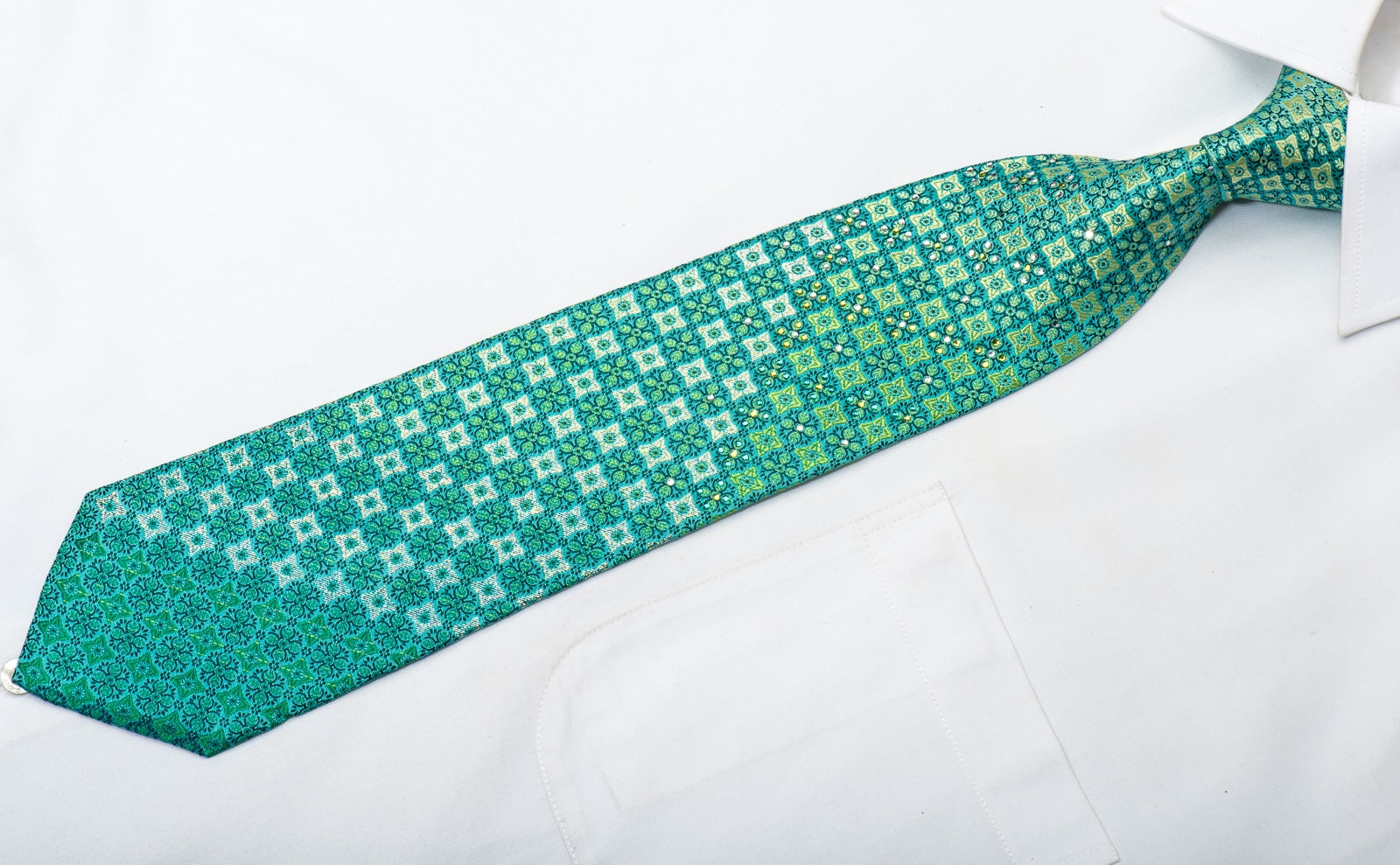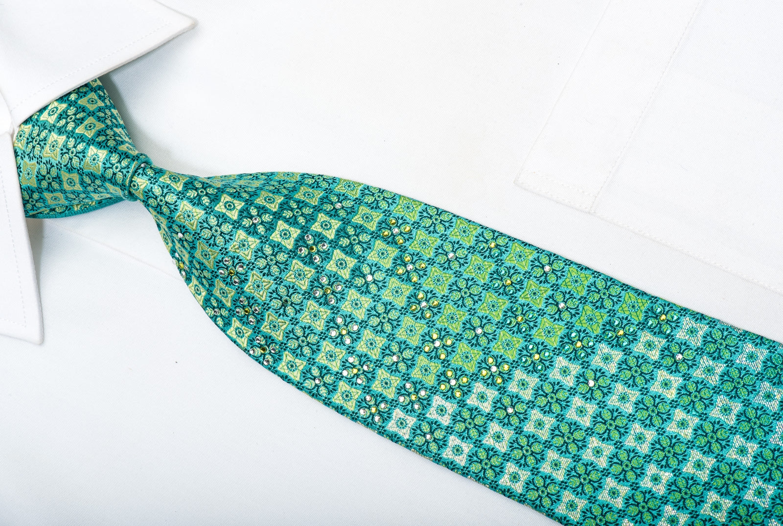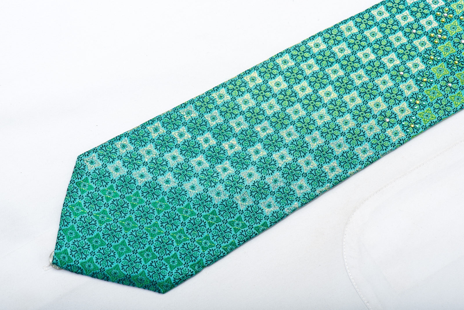 Gravata rhinestone masculina bonita feita à mão da seda de melhor qualidade e projetada pela marca roberta di Camerino. Apresentando um design cartouche maravilhoso em turquesa, teal, espumante com rhinestones de cristal branco e verde com brilhos prateados.