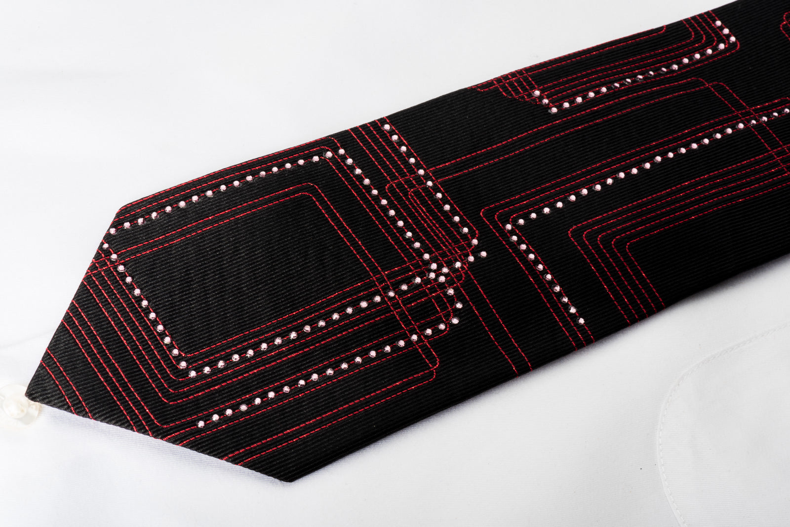 Material - Seda Design - Geométrico Cor - Preto, Vermelho Comprimento - Clássico (57 pol.-60 pol.)(145 cm-153 cm) Largura - Clássico (3 1/4 pol.-3 3/4 pol.)(8 cm-9,5 cm) Recursos especiais - Strass roxos, brilhos vermelhos Fornecedor - San-Dee