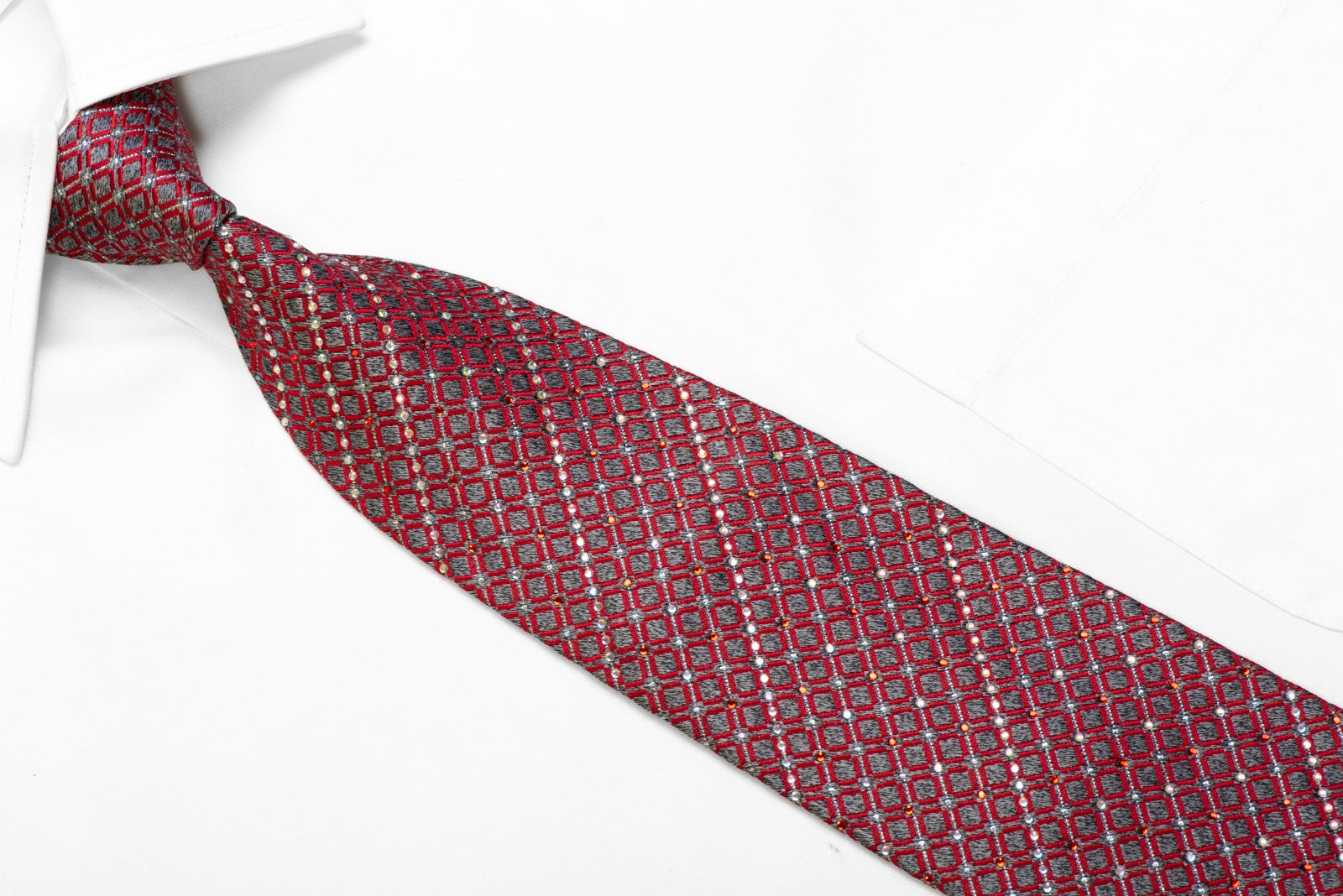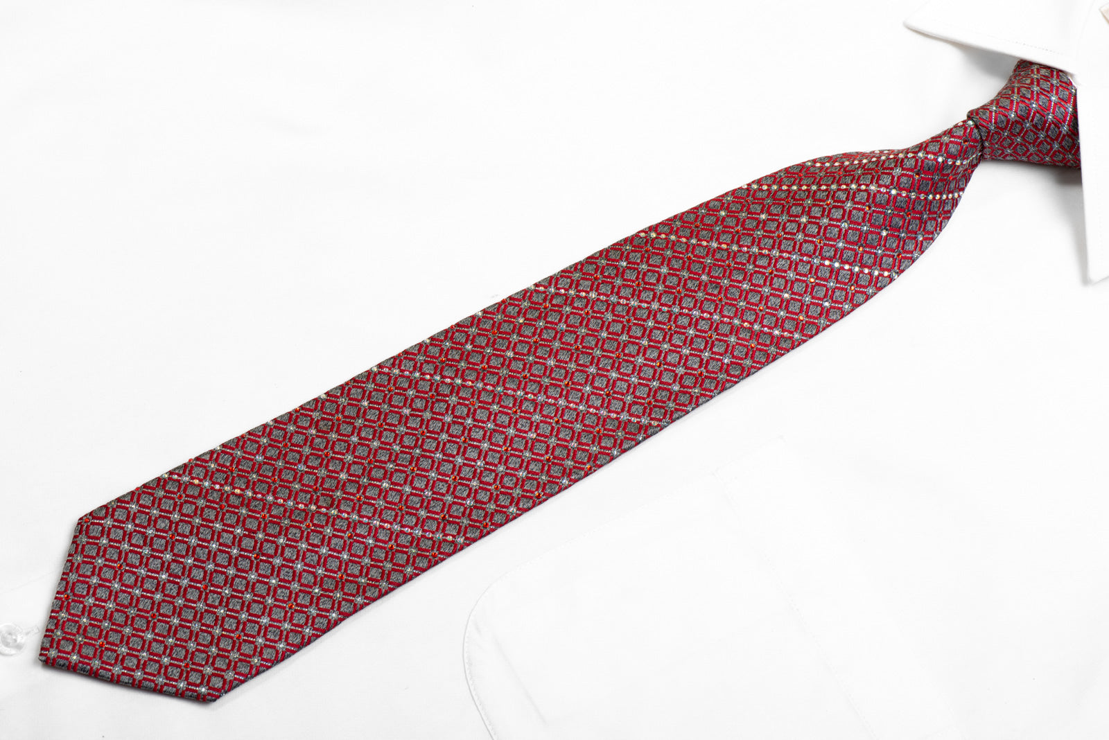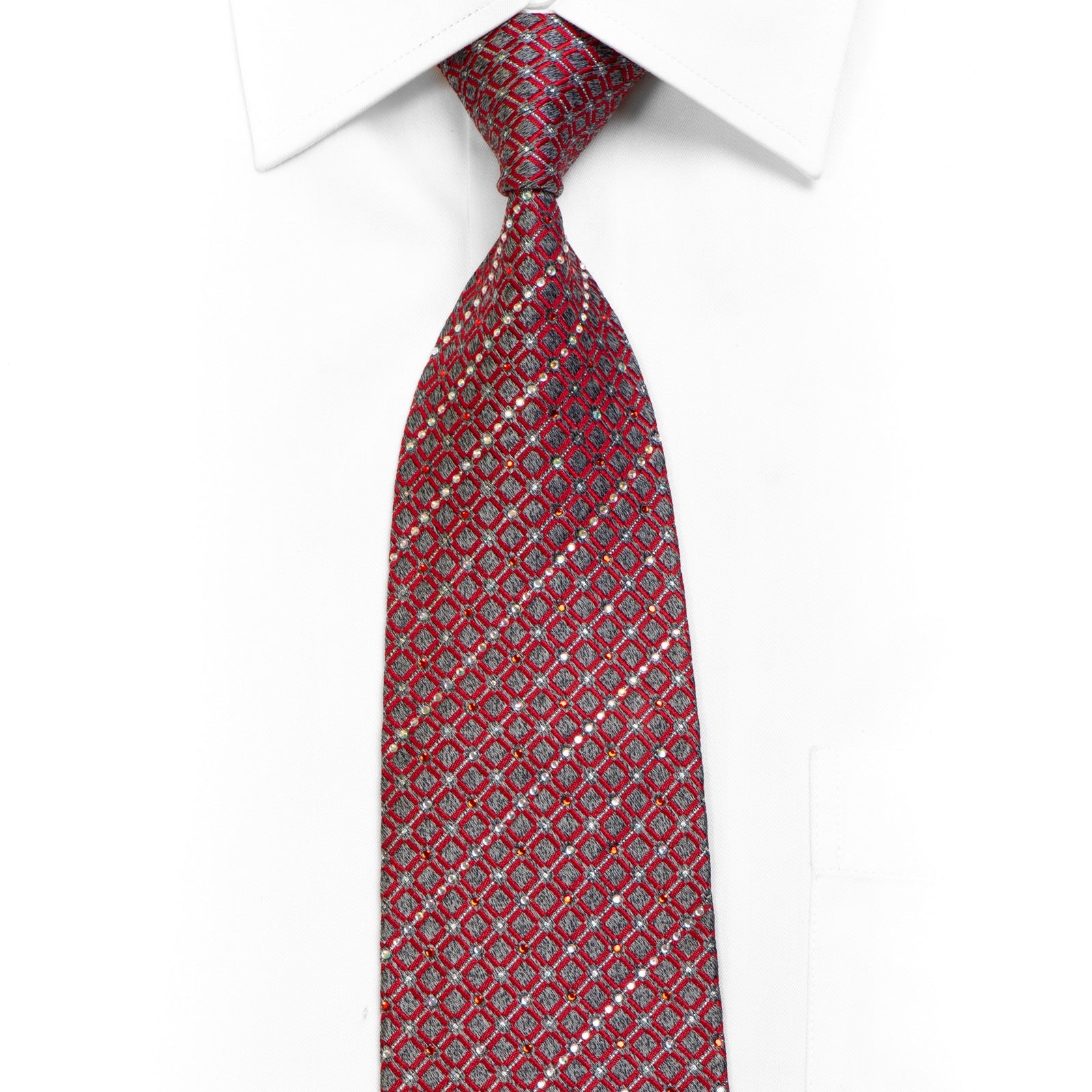 Red Geometric On Silver Silk Tie With Rhinestones & Sparkles