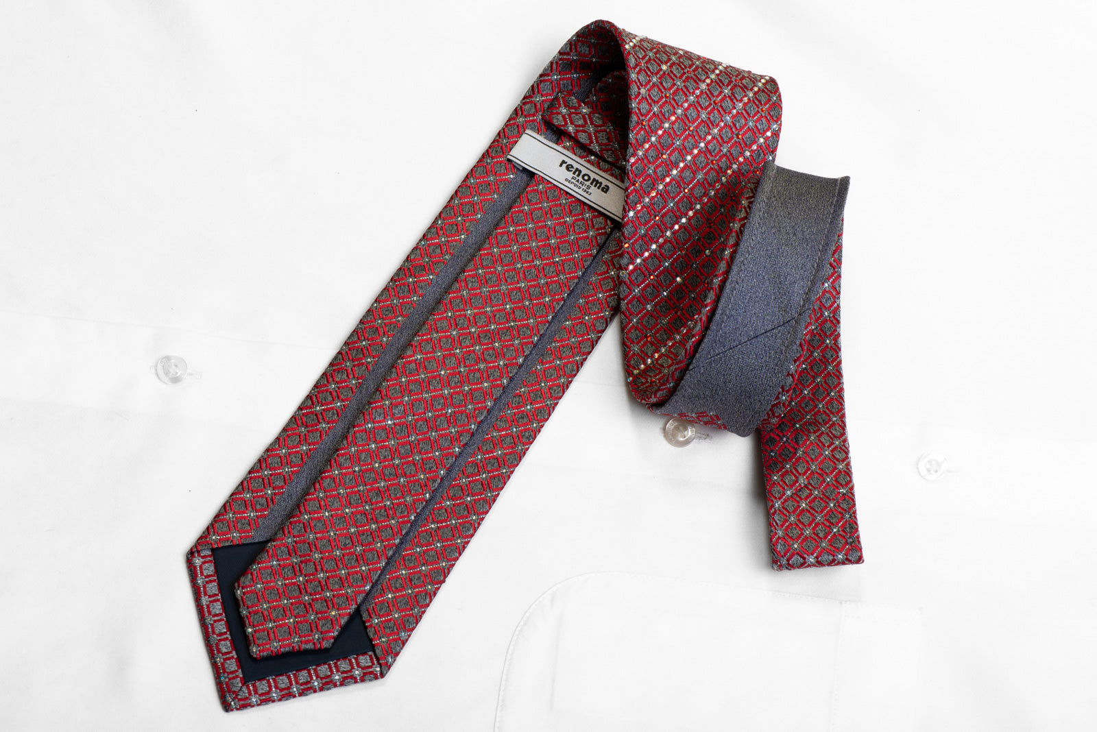 Stylish silk tie designed by top brand name Renoma. Presenting an elegant woven red Geometric design on silver. Sparkling with clear red and Crystal AB Rhinestones with metallic silver sparkles.