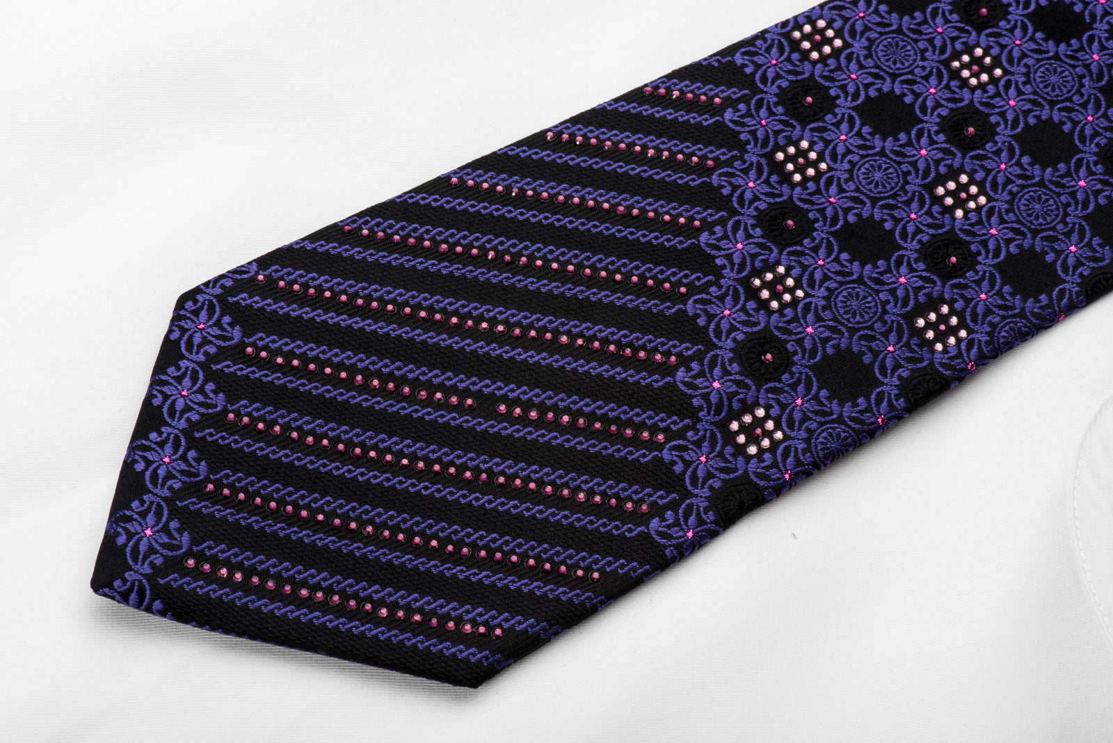 This handmade silk necktie is perfect for every occasion. It's made with the finest quality silk, featuring a beautiful purple Cartouche pattern over black, with purple Rhinestones and sparkles adding a touch of sparkle.