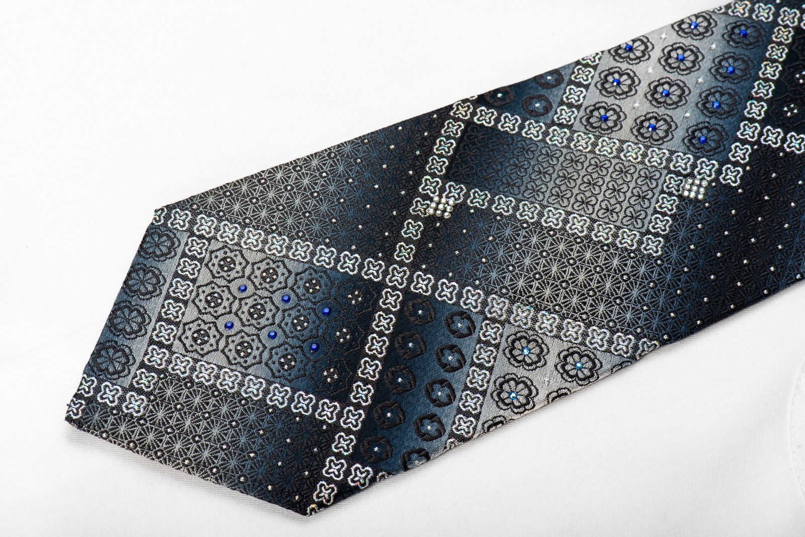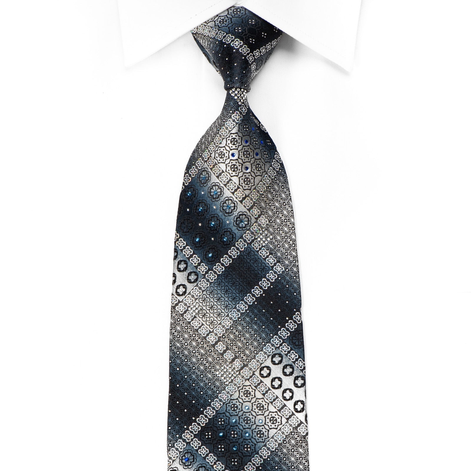 This handsome men's necktie features a woven Geometric Cartouche design of black, navy, and silver, plus dazzling rhinestones and silver sparkles for the perfect special occasion look.