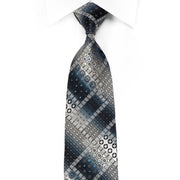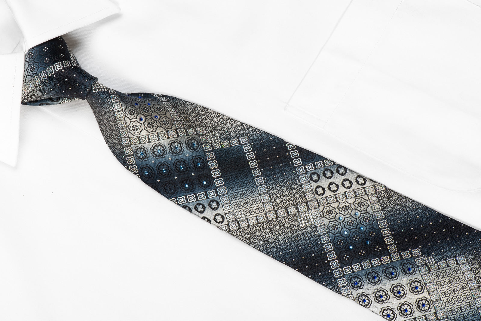 Silver Black Navy Geometric Men's Crystal Silk Necktie With Silver Sparkles