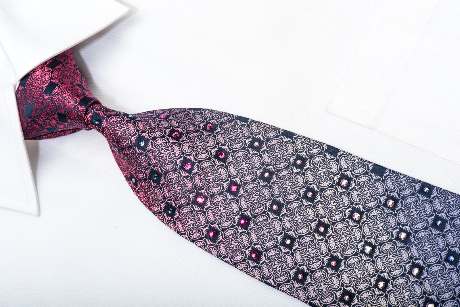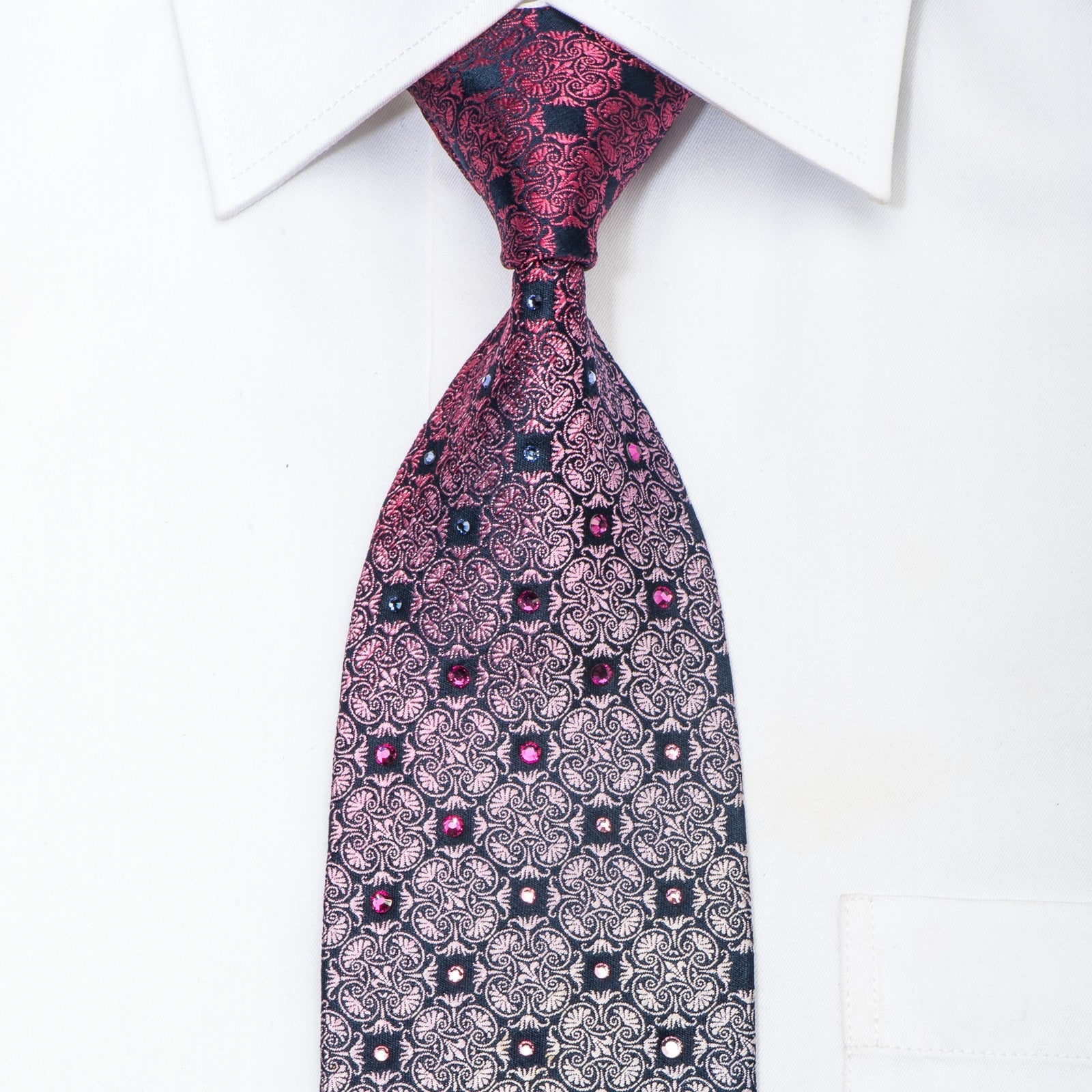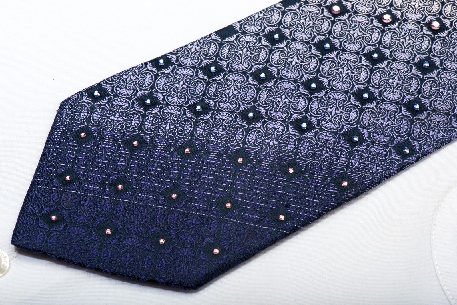 Purple Pink Cartouche On Navy Men's Silk Tie Sparkling With Rhinestones