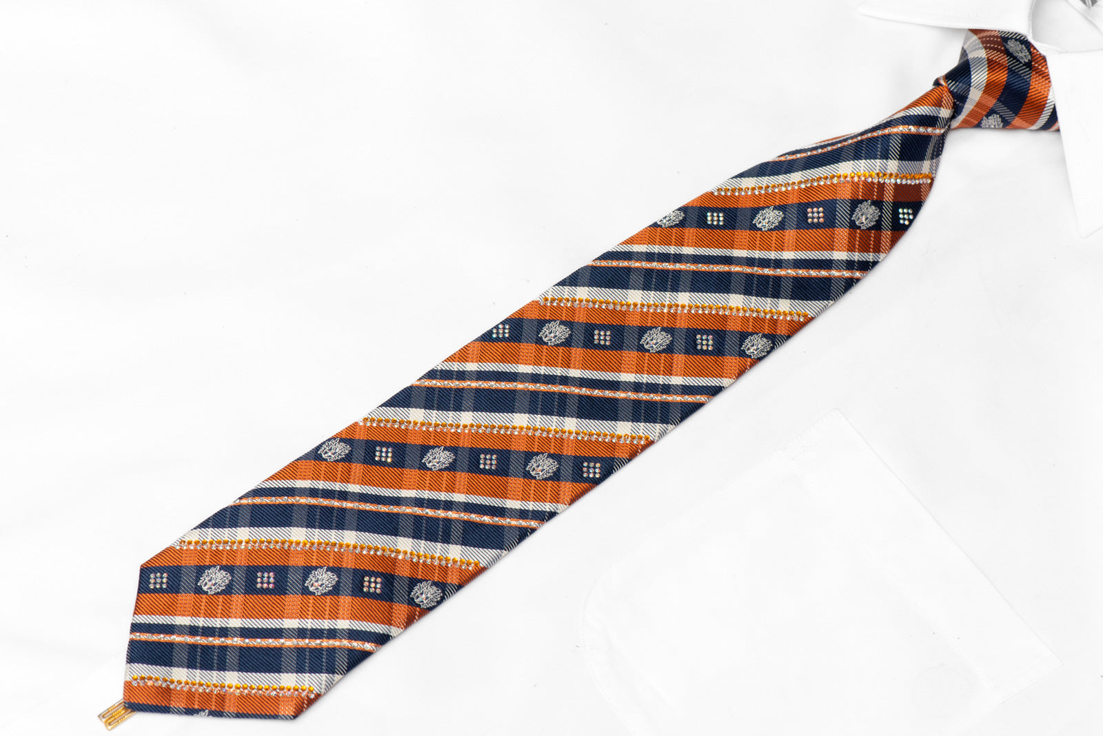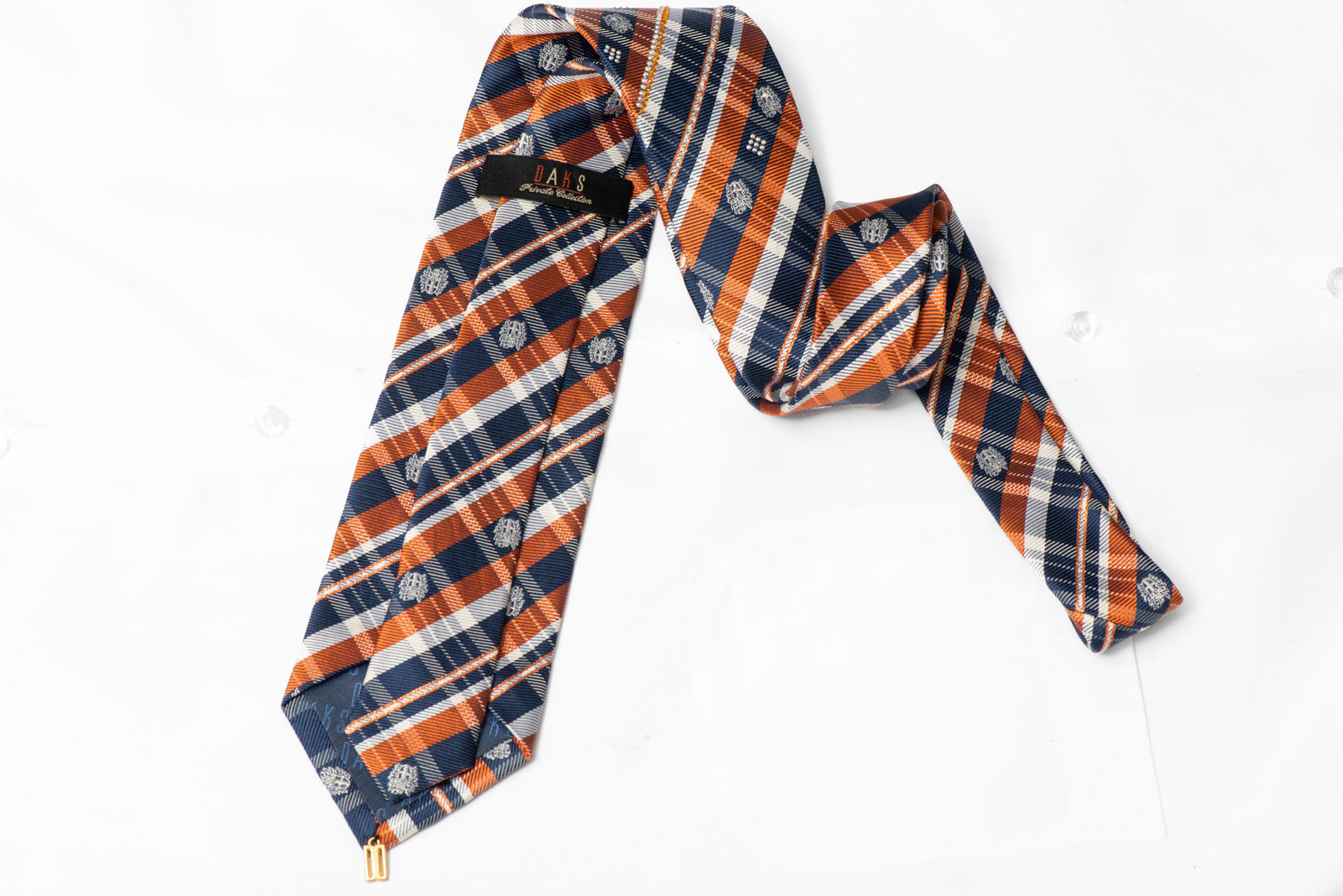 Material - SilkDesign - PlaidColor - Orange, Navy, SilverLength - Classic (48 in.-60 in.)(145cm-153 cm)Width - Classic (3 1/4 in.-3 3/4 in.)(8 cm-9.5 cm)Special Features - Rhinestones, Silver Sparkles