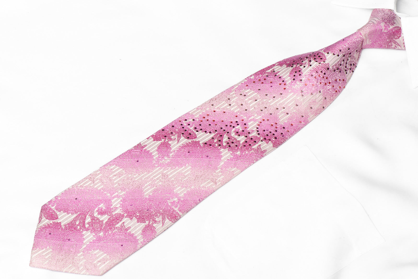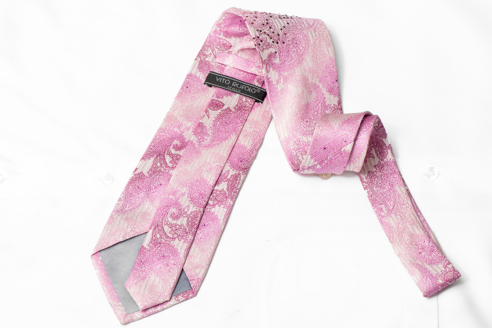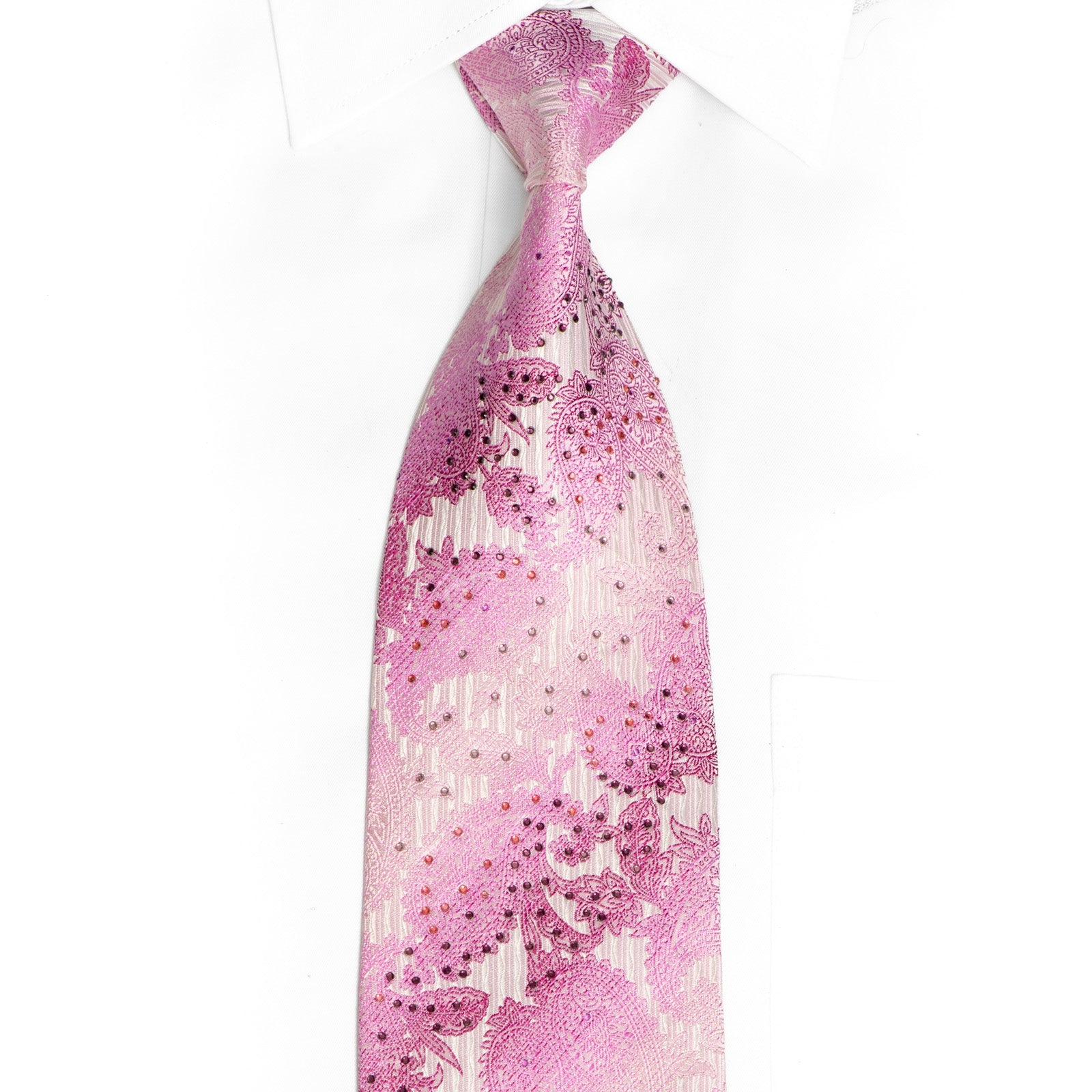 This silk necktie features a pink paisley pattern adorned with sparkling pink rhinestones, adding a touch of elegance and shimmer to your outfit.