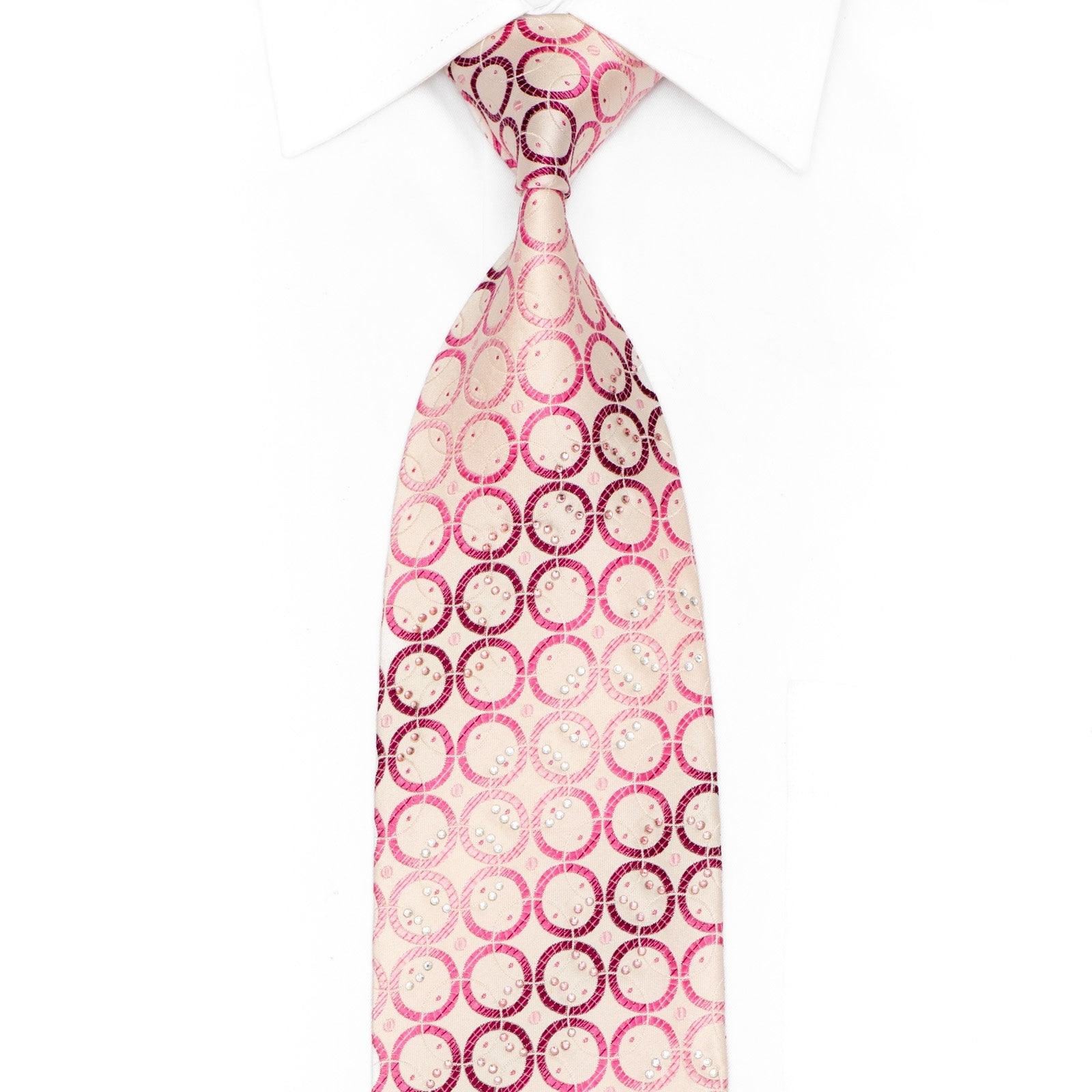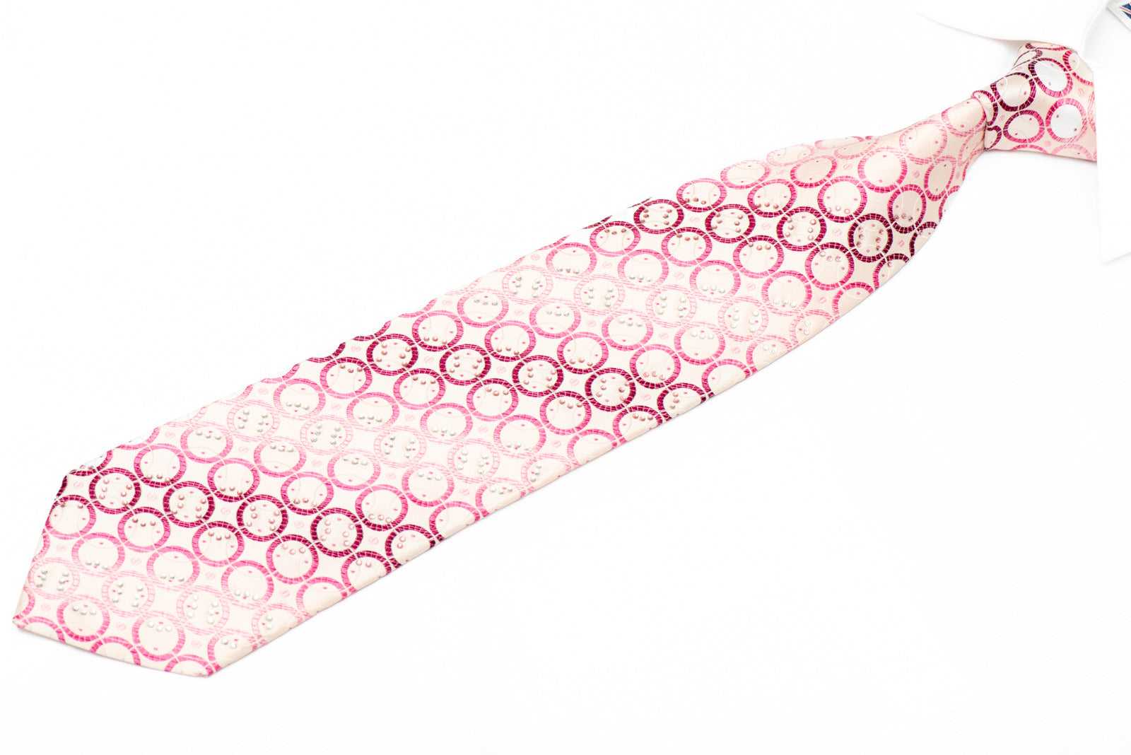 Material - SilkDesign - Geometric CirclesColor - PinkLength - Classic (48 in.-60 in.)(145cm-153 cm)Width - Classic (3 1/4 in.-3 3/4 in.)(8 cm-9.5 cm)Special Features - Rhinestones, Silver Sparkles
