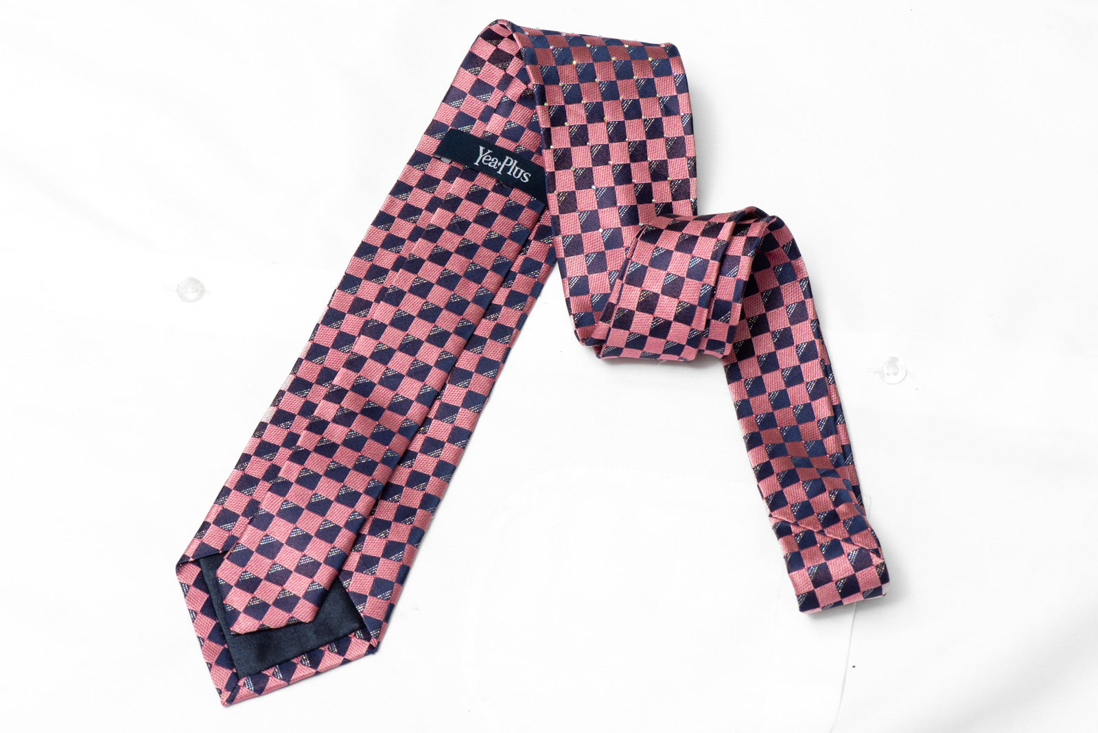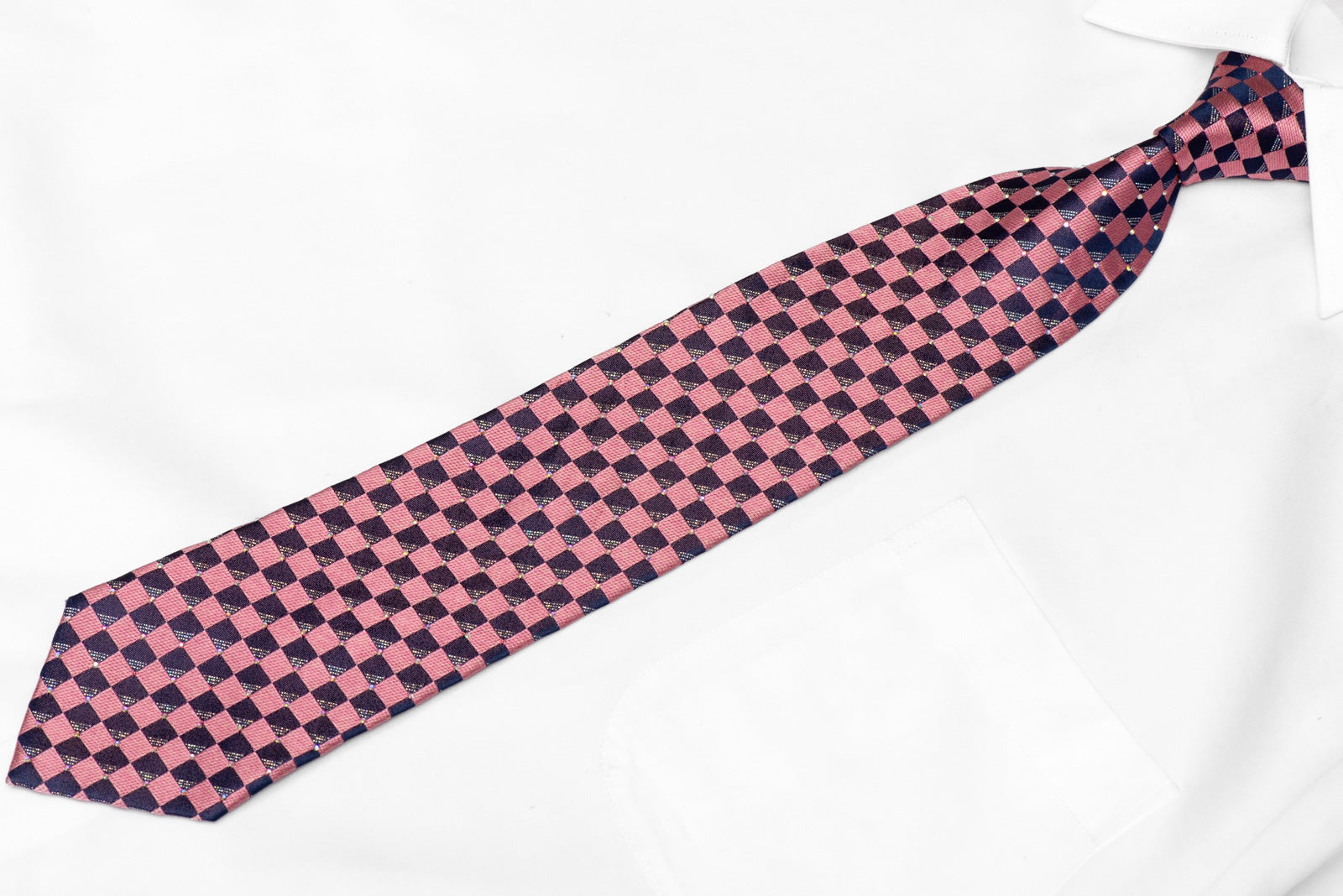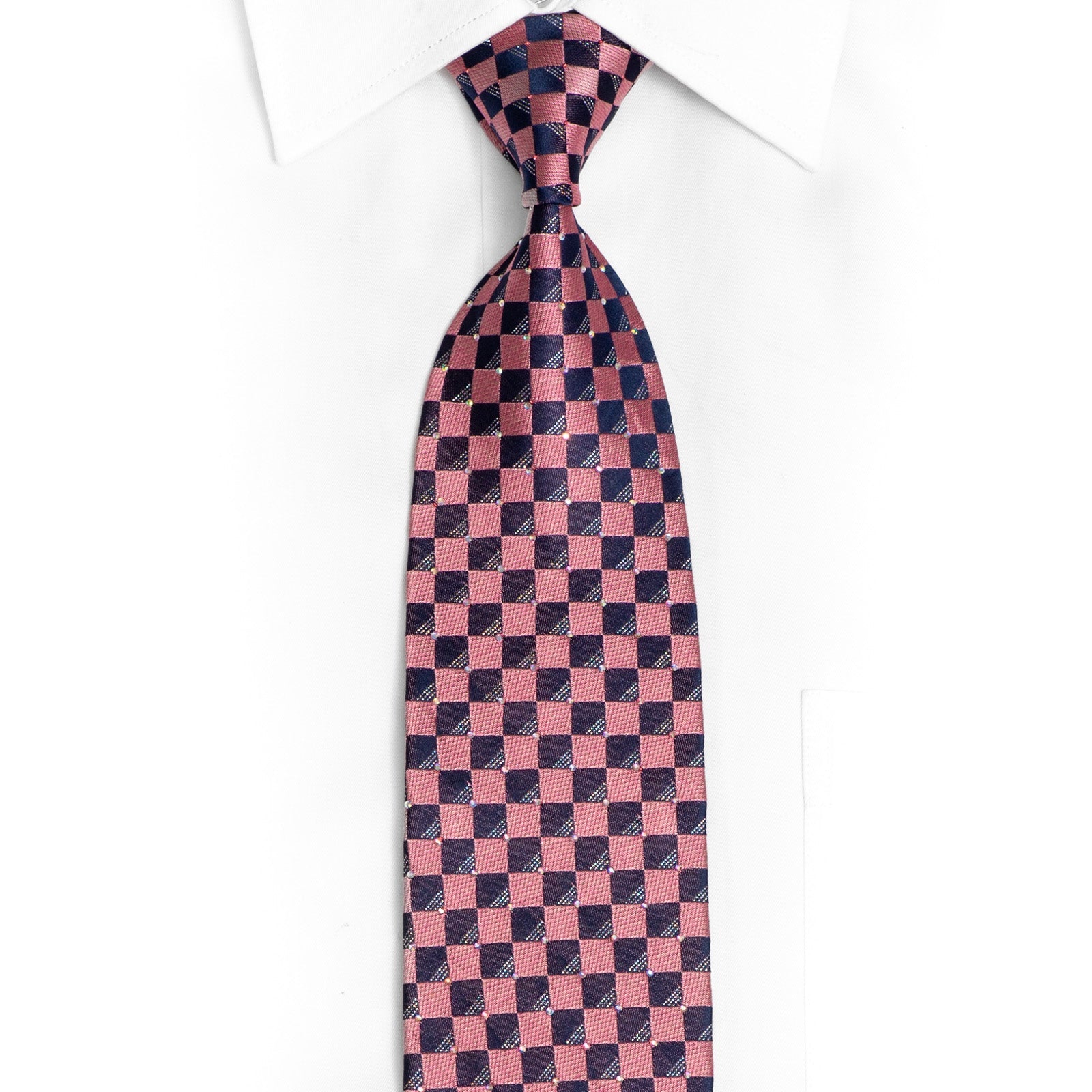 This refined silk necktie showcases a stunning pink and navy checkered pattern, enhanced with tasteful rhinestone accents and shimmering silver sparkles that add a sophisticated touch to your professional or formal ensemble.