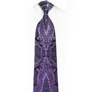Elevate your ensemble with this elegant black tie featuring a refined purple damask pattern accented by sparkling rhinestones.