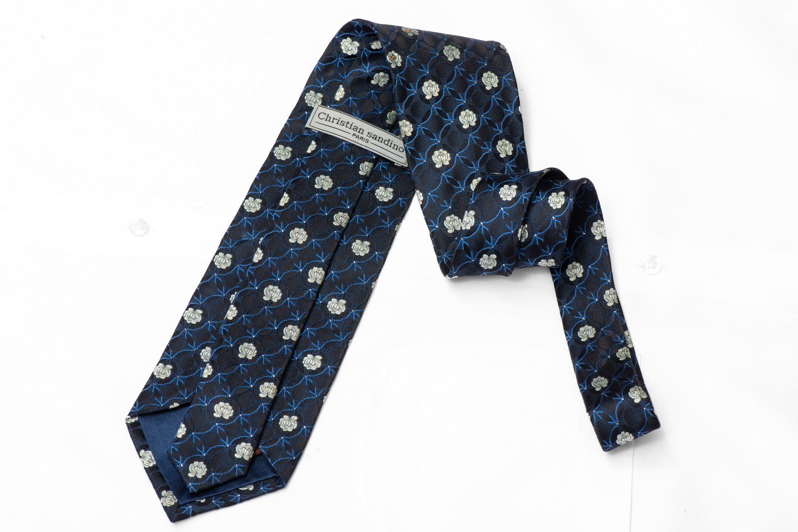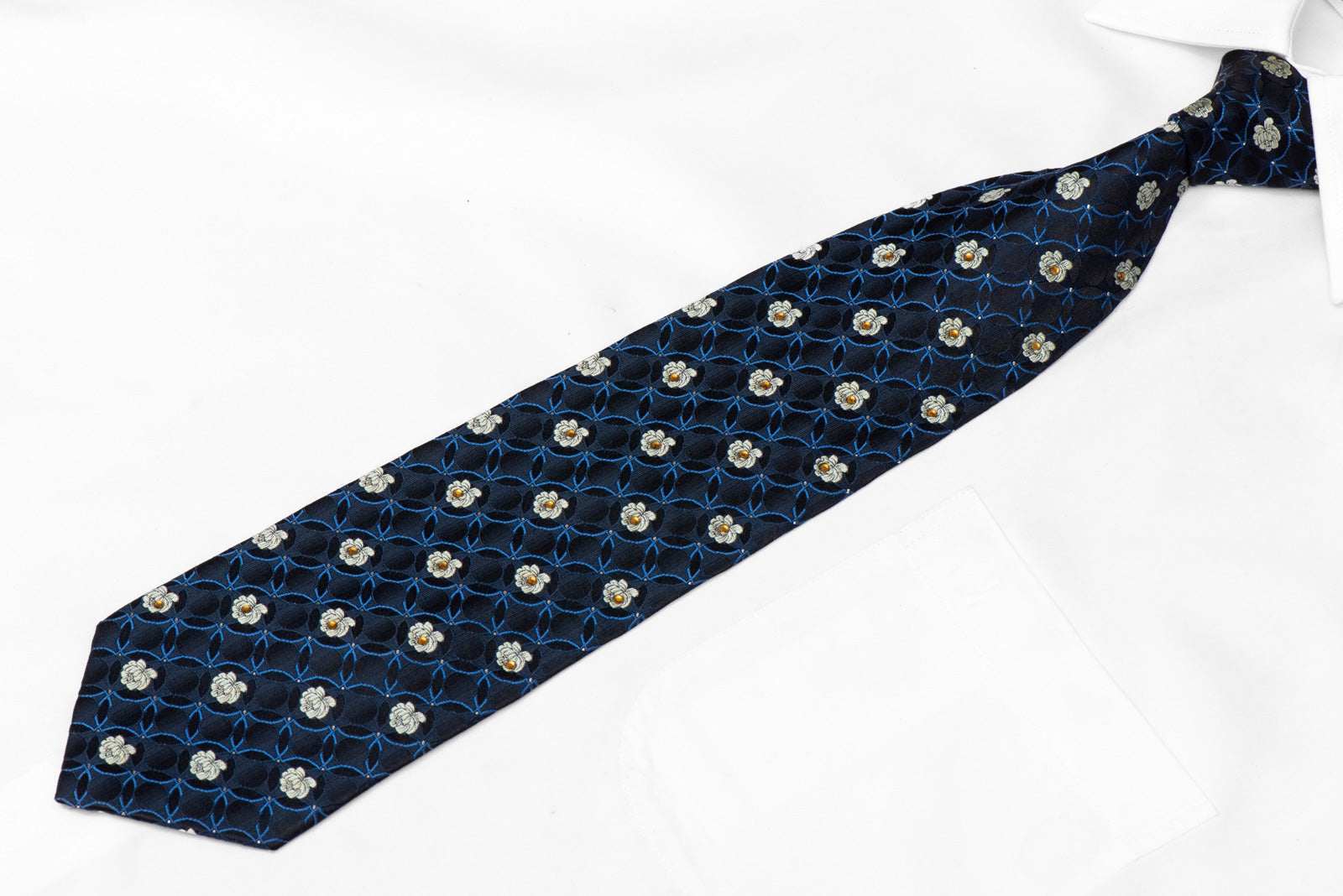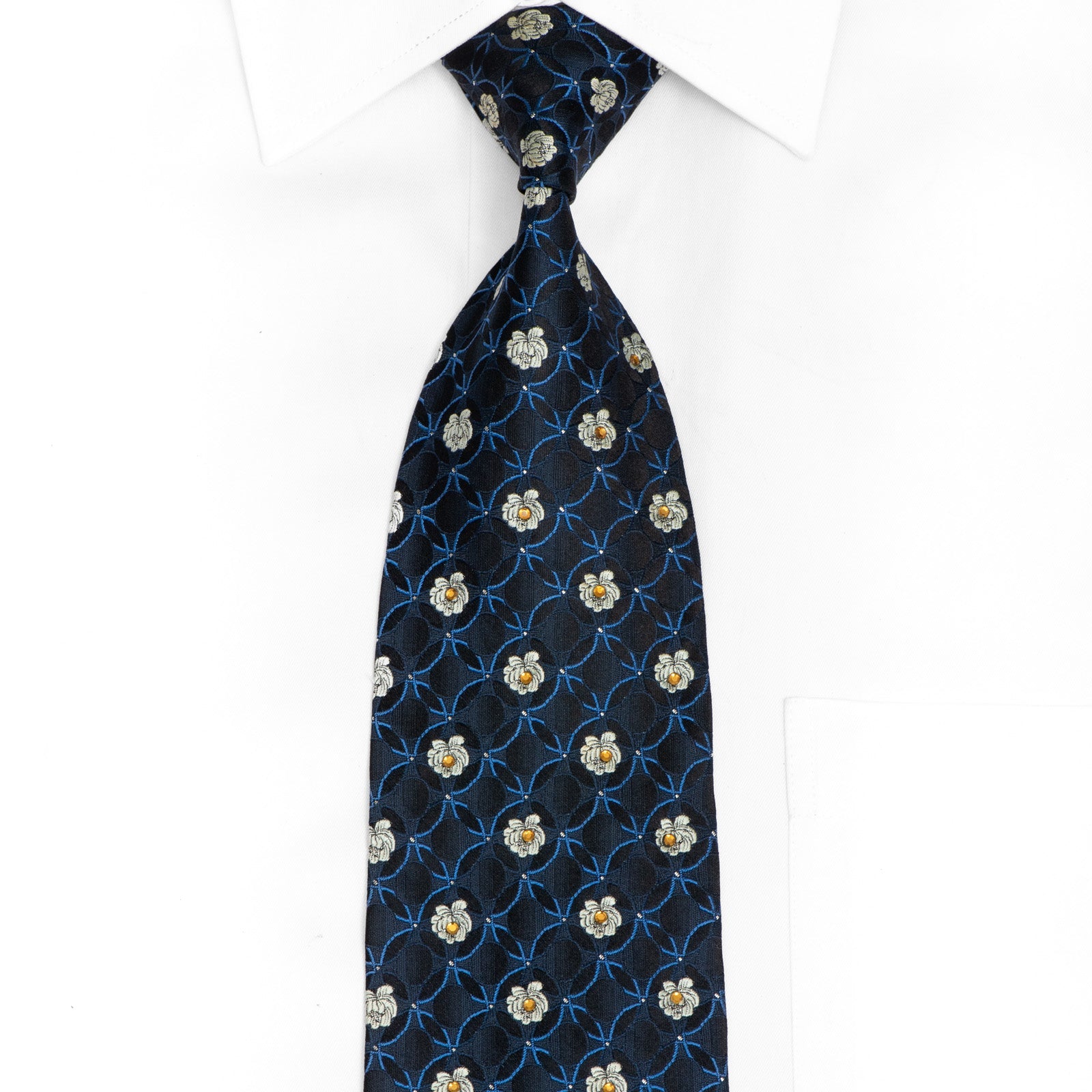 Silver Blue Floral On Black Rhinestone Tie With Silver
