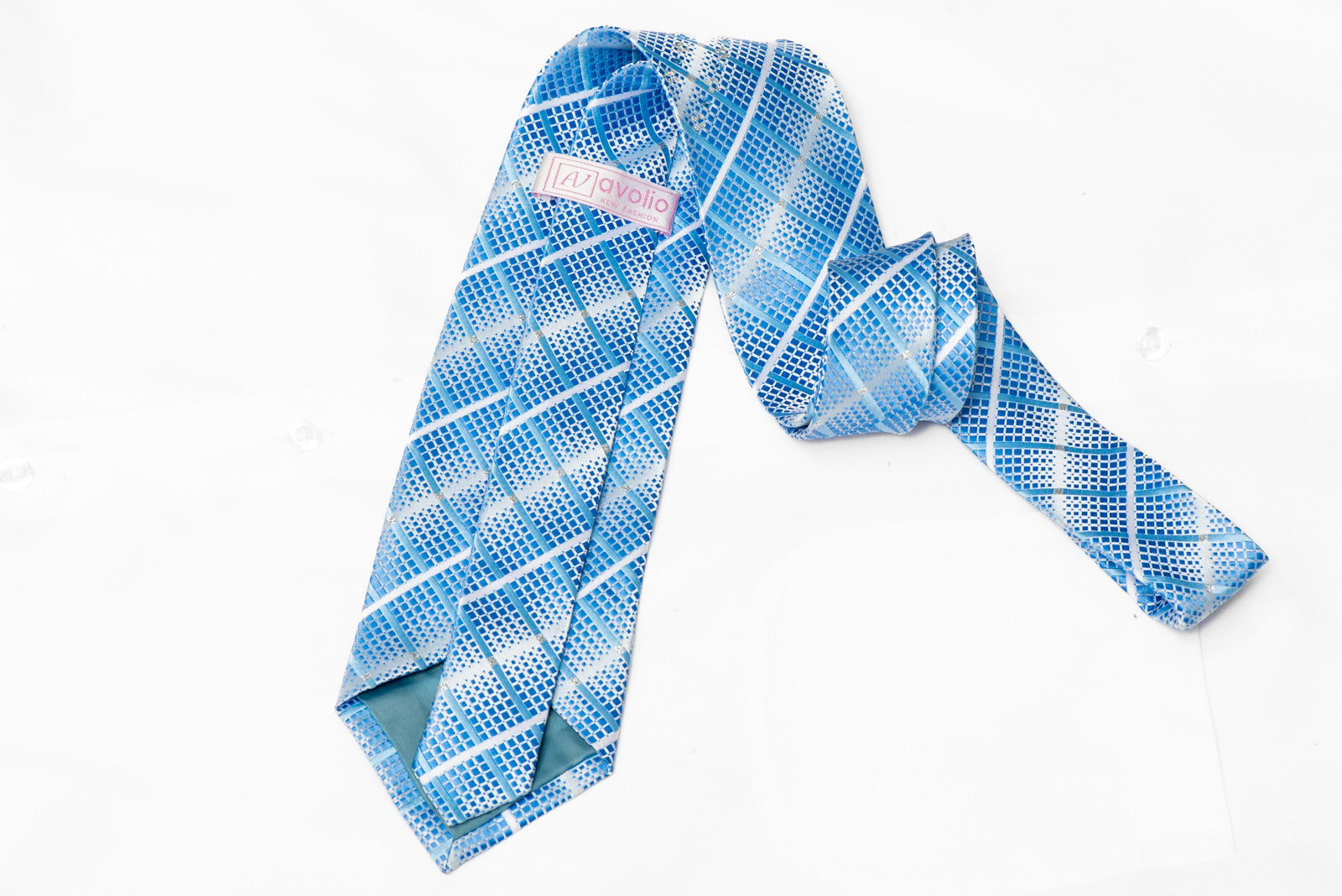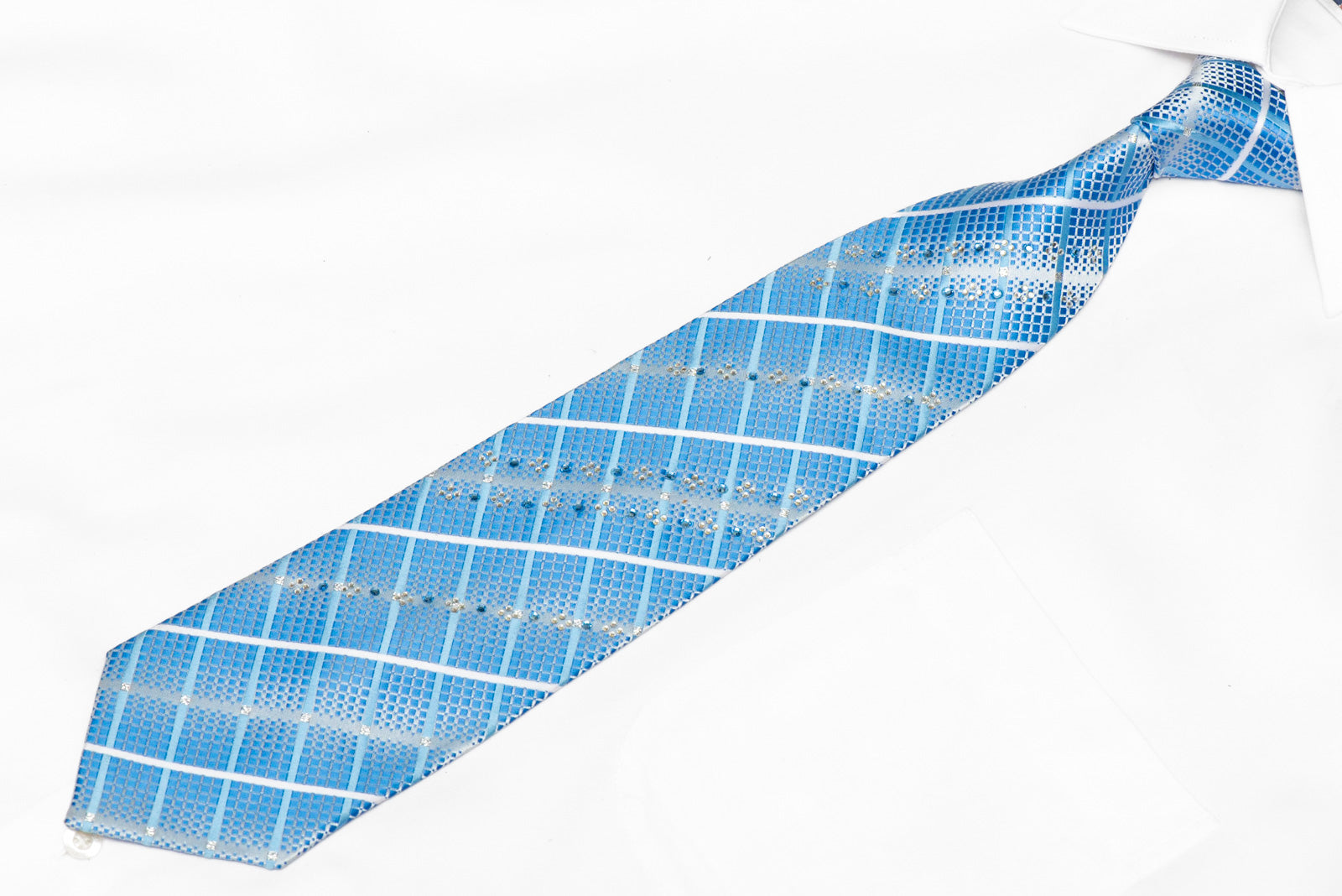 This necktie features blue stripes on a silver microfiber base, adorned with sparkling rhinestones for a touch of elegance. Perfect for adding a refined sparkle to your outfit.