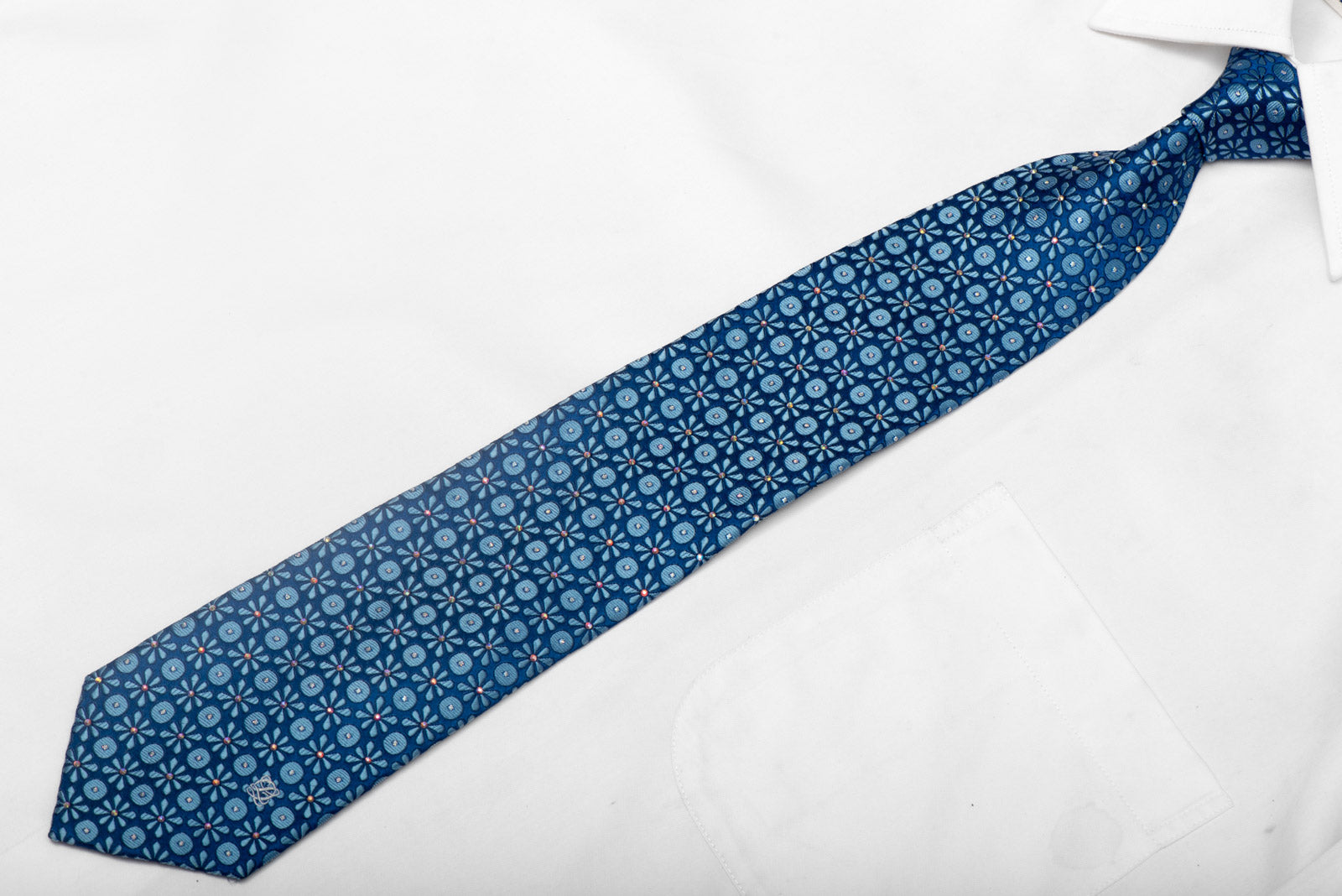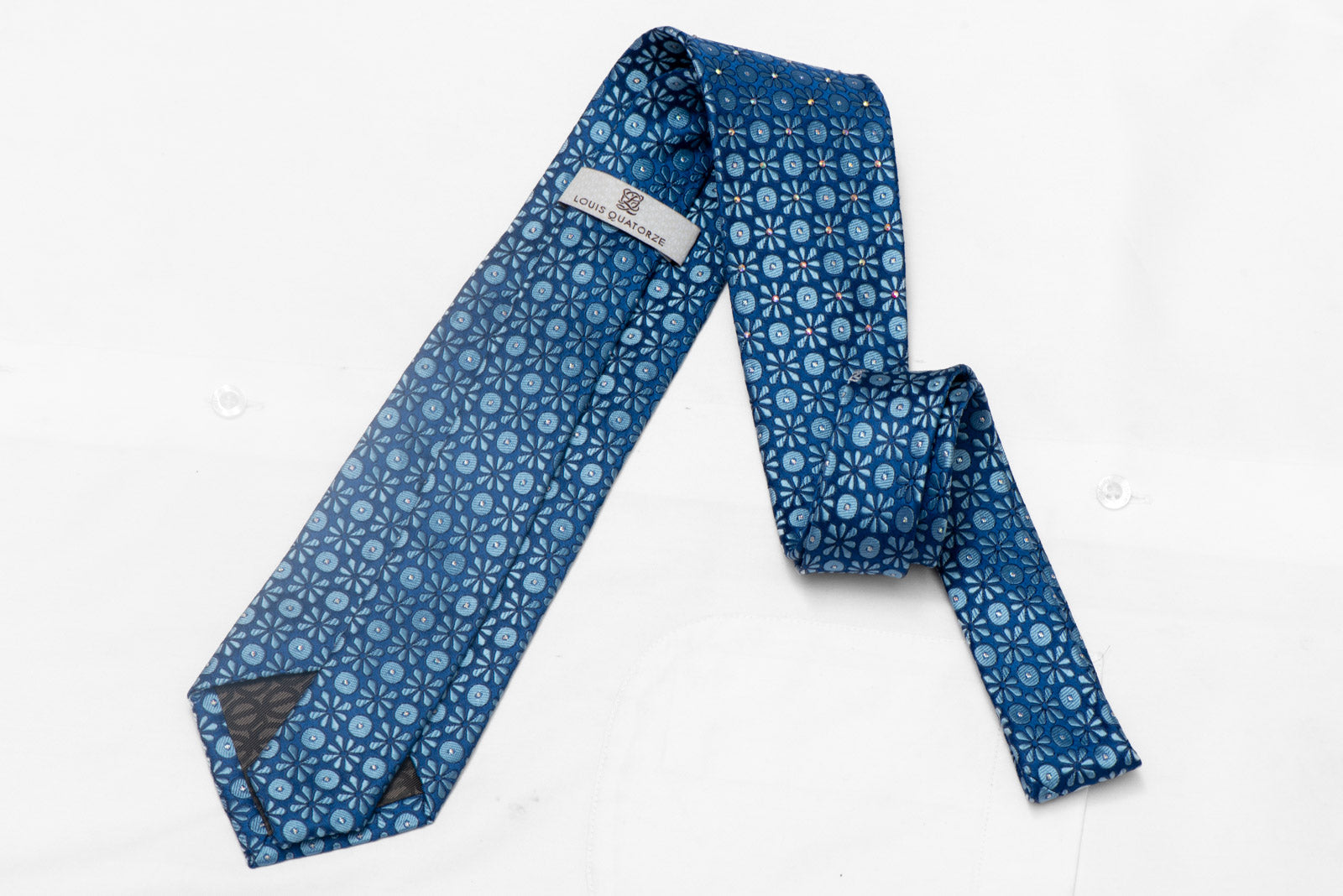 Geometric Floral On Blue Rhinestone Silk Tie With Silver