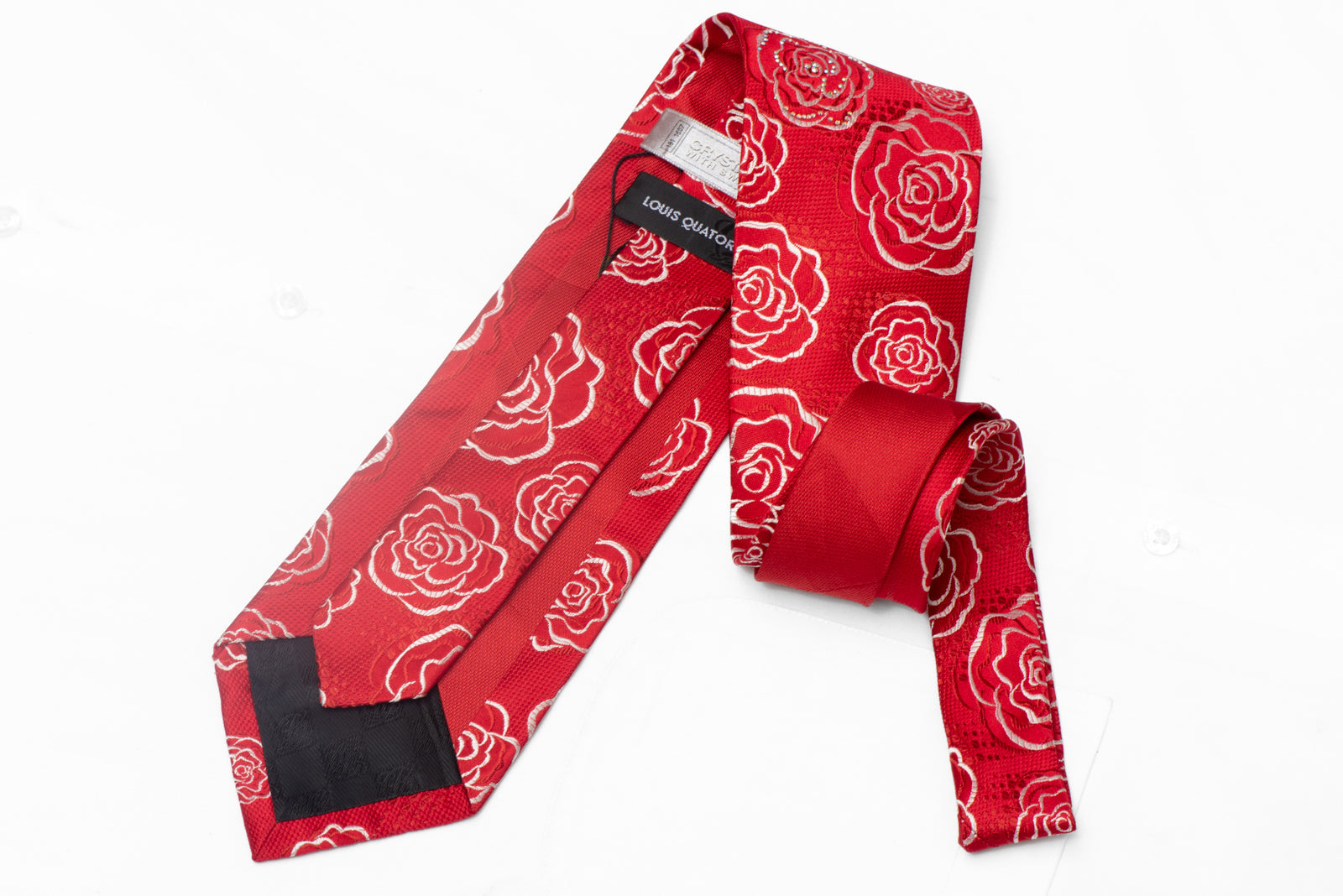 Silver Floral On Red Rhinestone Silk Tie With Silver