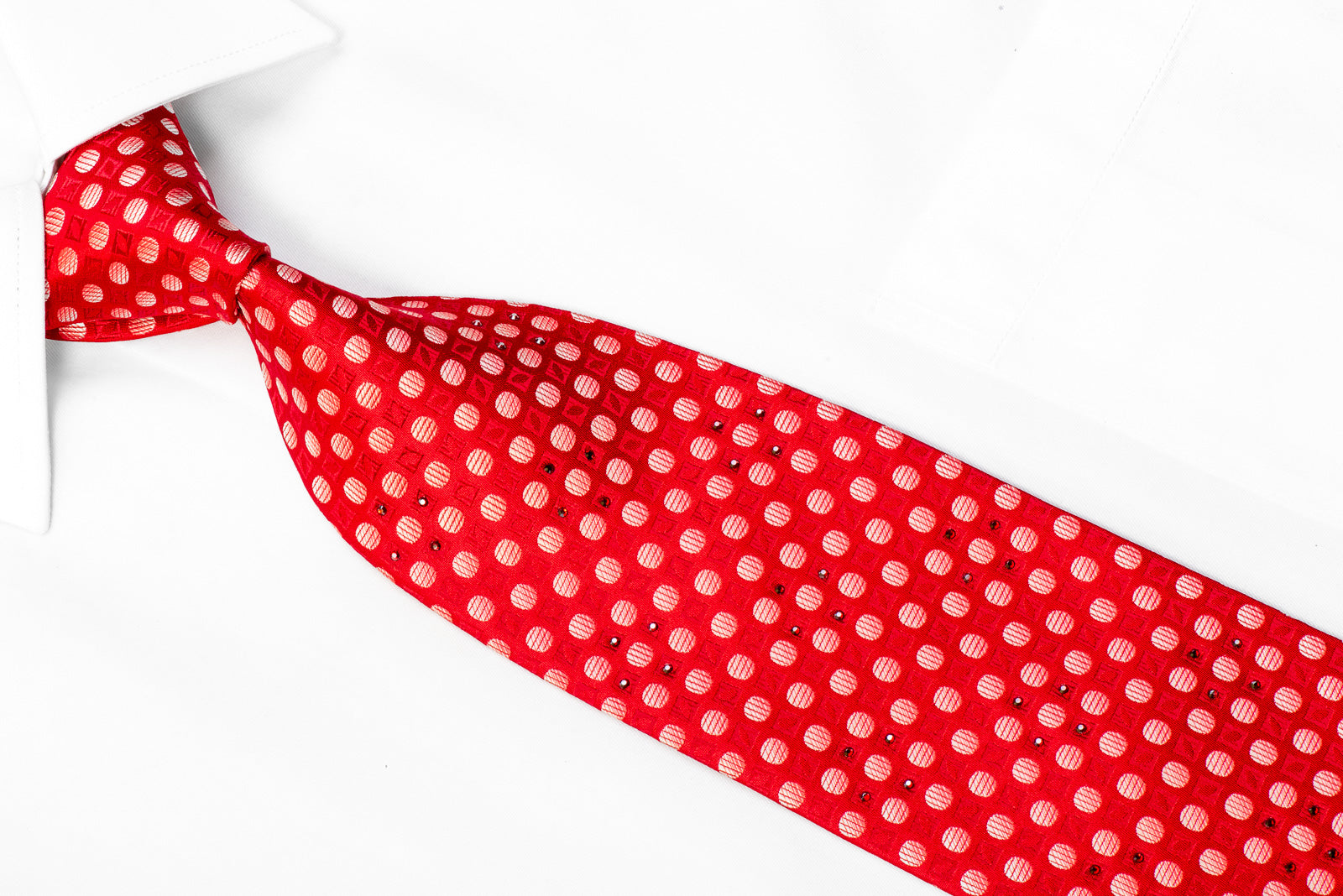 Stylish men's crystal Rhinestone necktie perfect for every occasion handmade from the finest quality silk. Presenting an elegant woven Geometric Circles design on red and sparkling with clear red crystal Rhinestones.