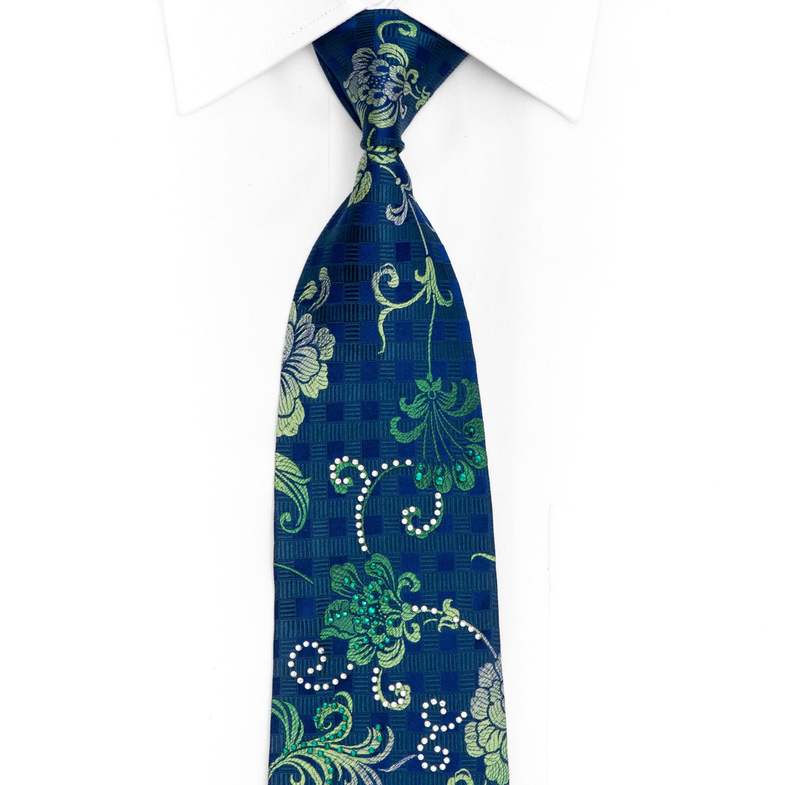 Make a bold statement with this captivating tie that brings together a striking blue canvas with lush green and silver floral designs. Adorned with sparkling rhinestones and shimmering silver details, this piece gives you the confidence to shine at any occasion. Whether you're attending a celebration or want to express your personal style, this tie empowers you to look your absolute best while feeling genuinely proud of your choice.