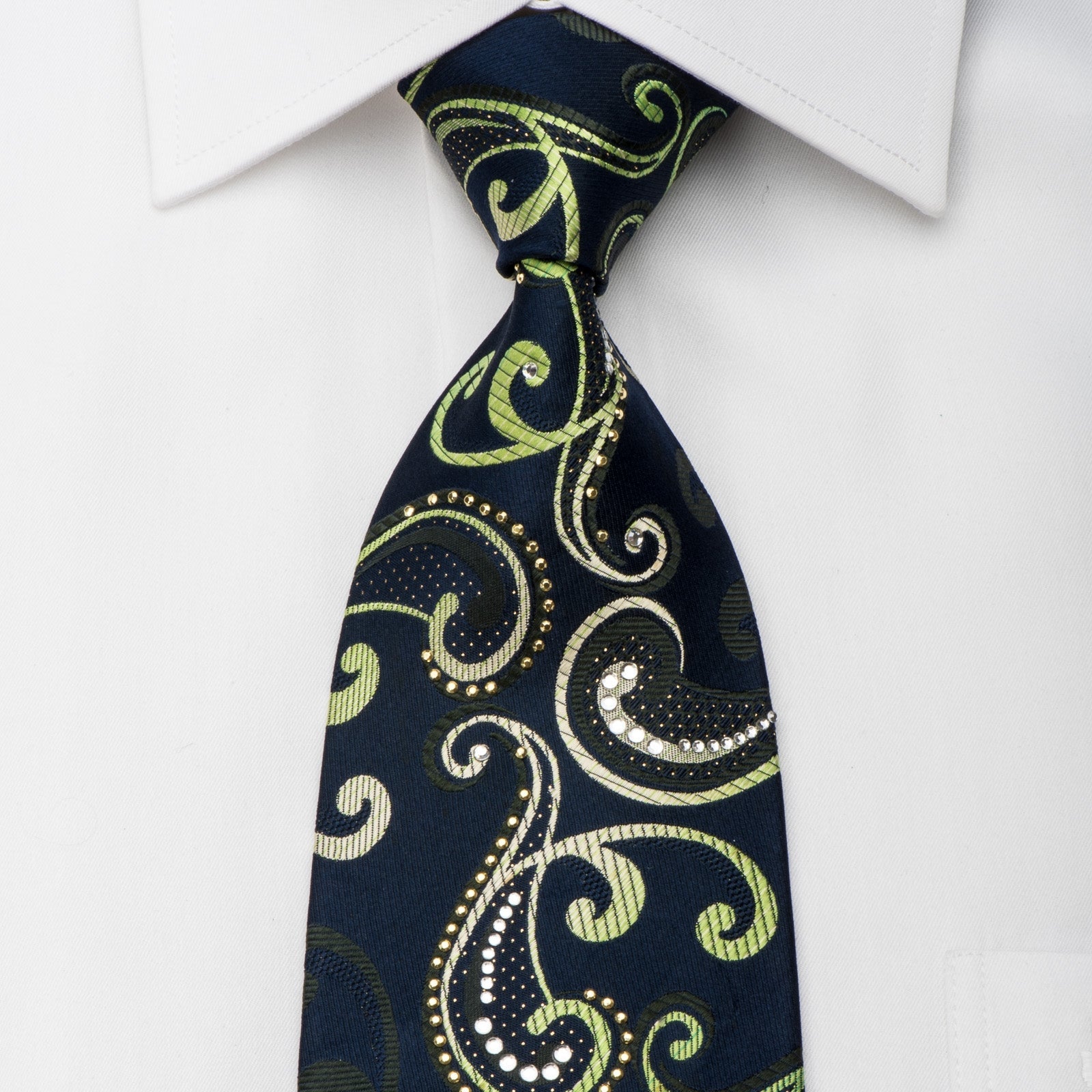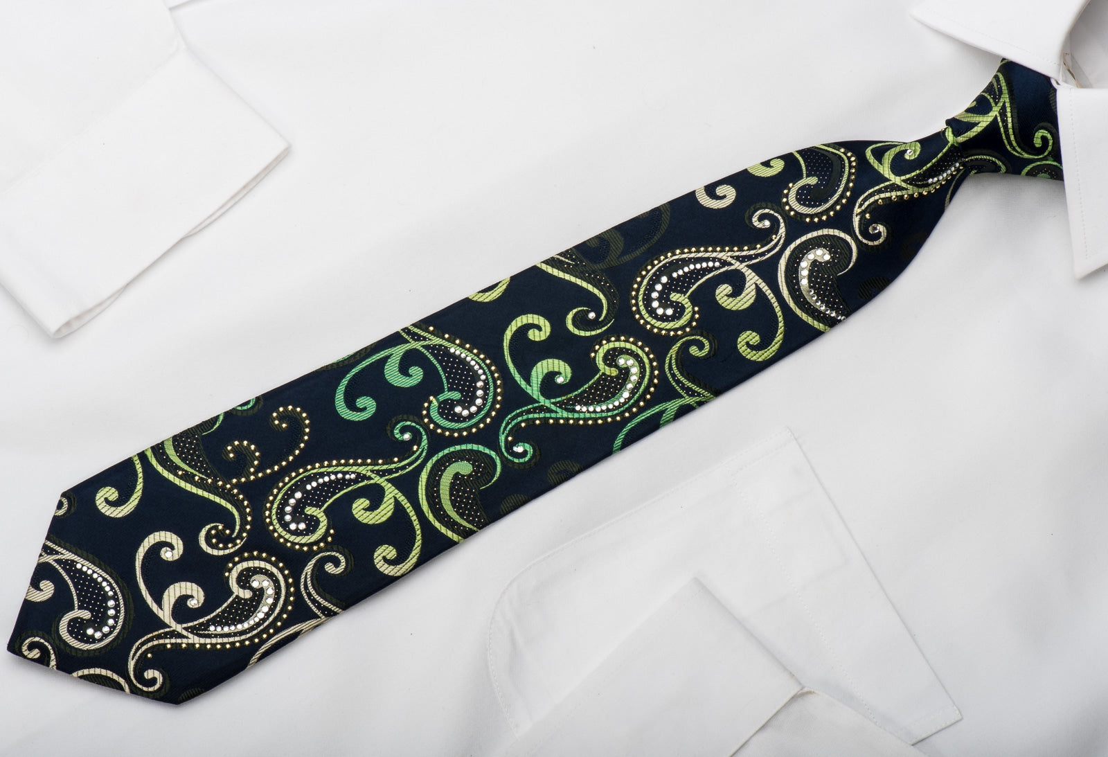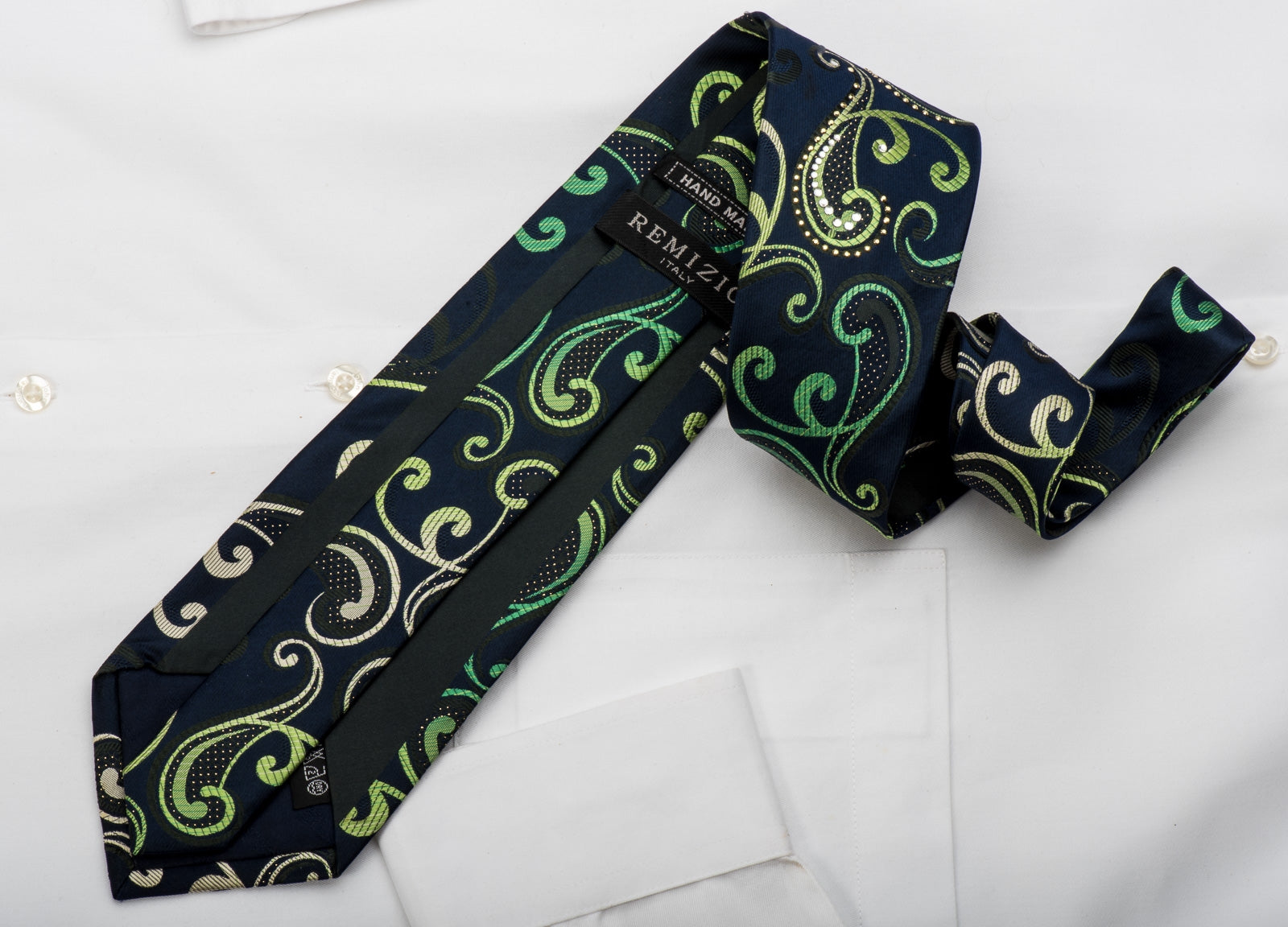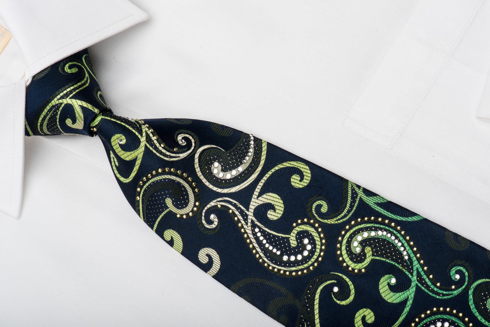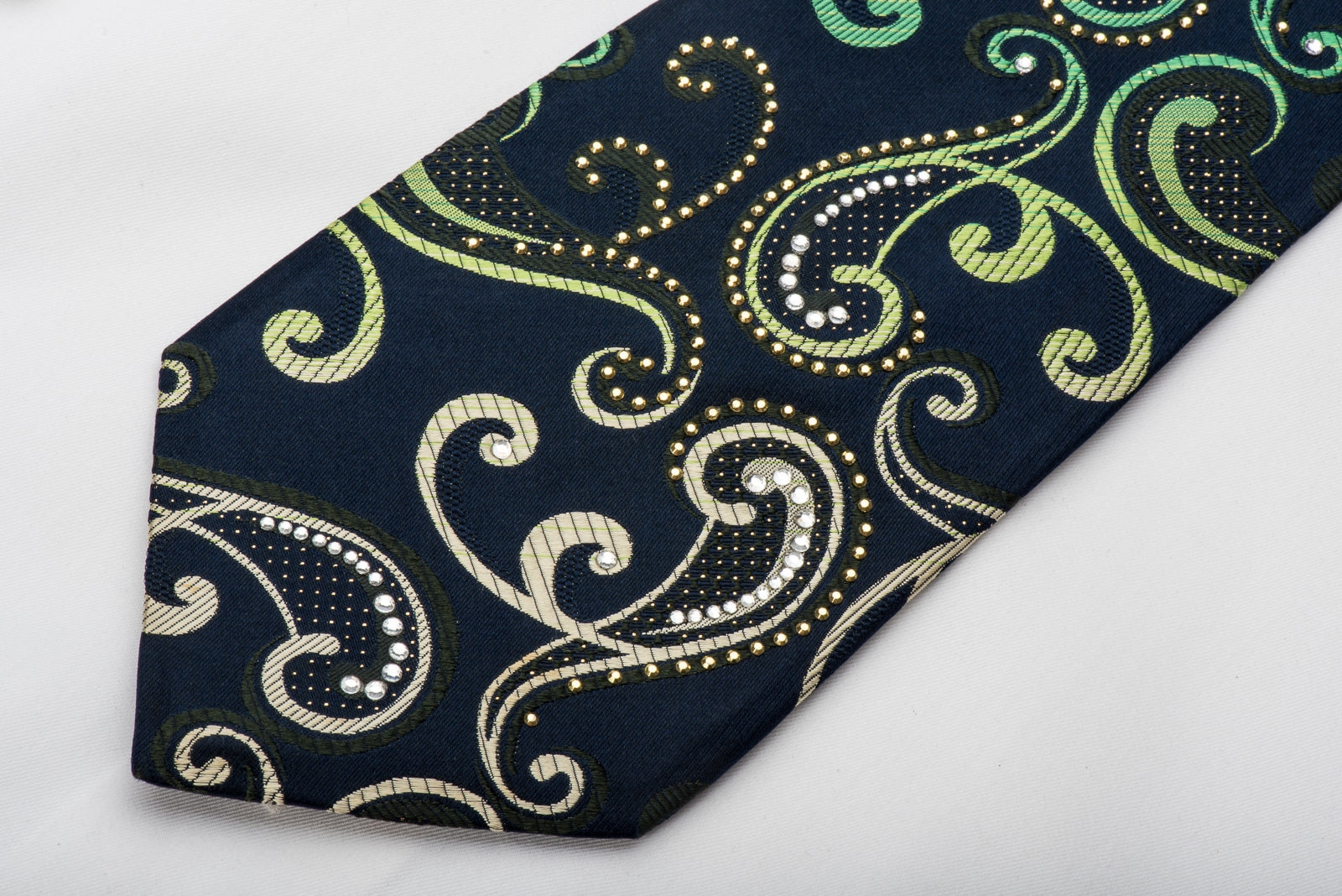 Beautiful men's Rhinestone necktie handmade from the finest quality silk and designed by top brand name Remizio. Presenting a wonderful design with Scrolls on green, sparkling with white, silver rhinestones and silver sparkles.