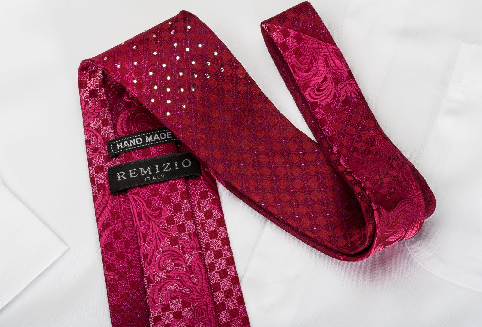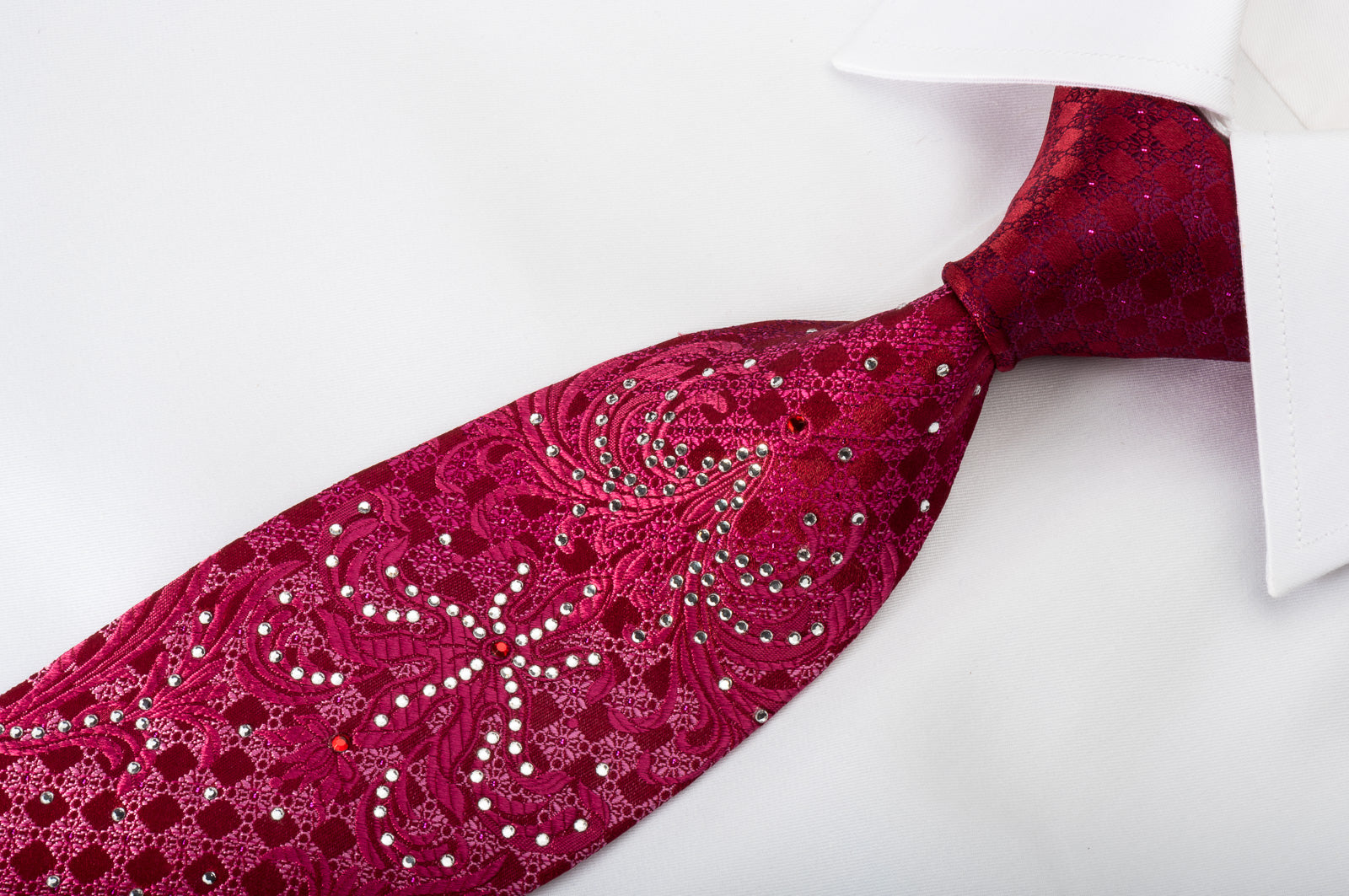 Gorgeous mens woven silk necktie handmade from the finest quality silk and designed by top brand name Remizio. Presenting a stylish Damask design on red woven silk and sparkling with red, white crystal Rhinestones.