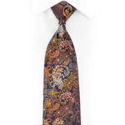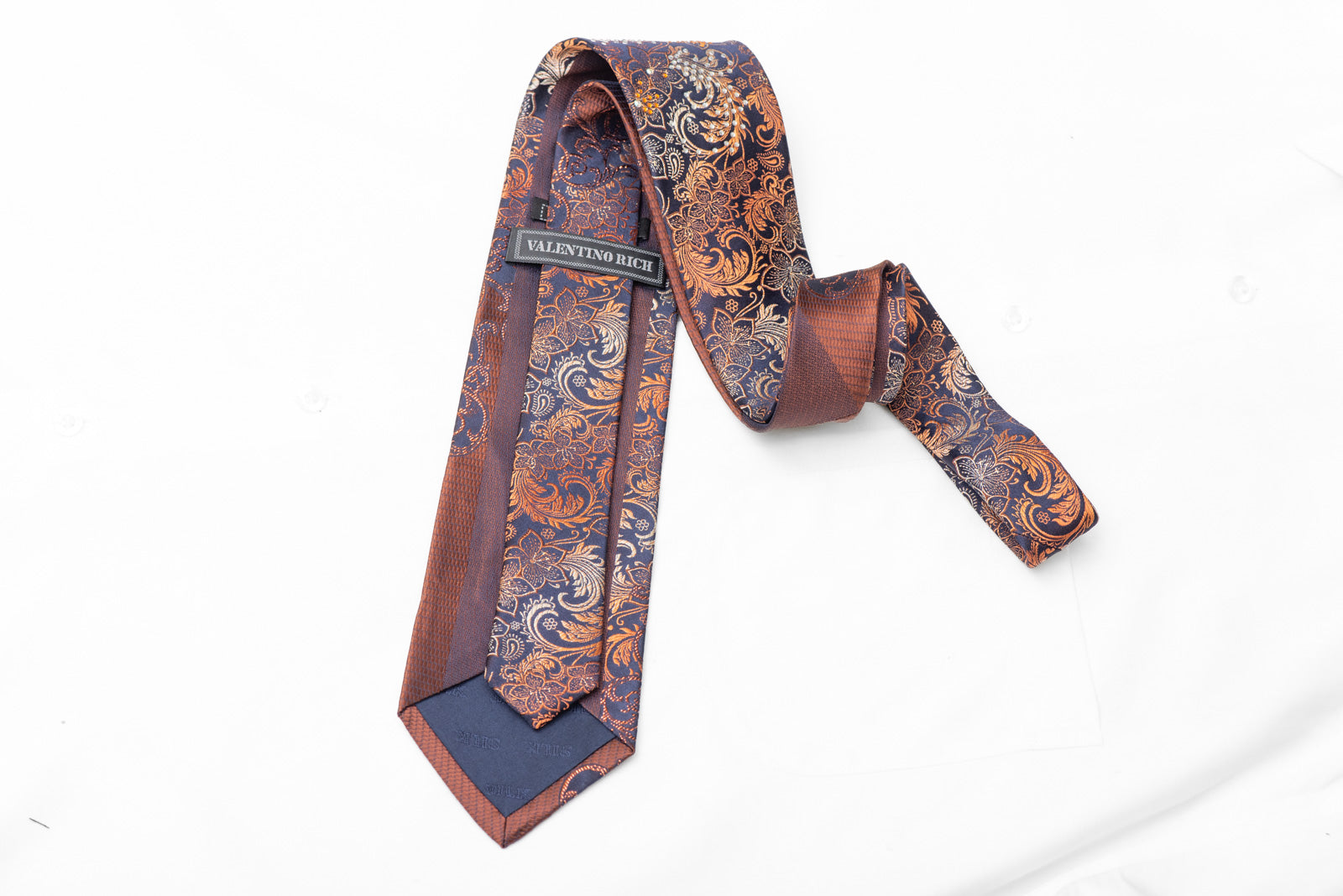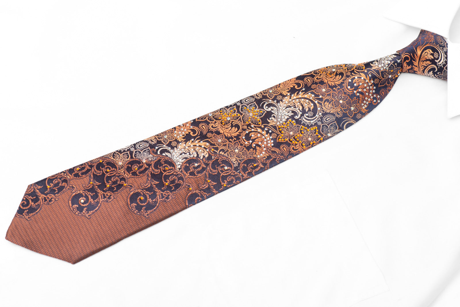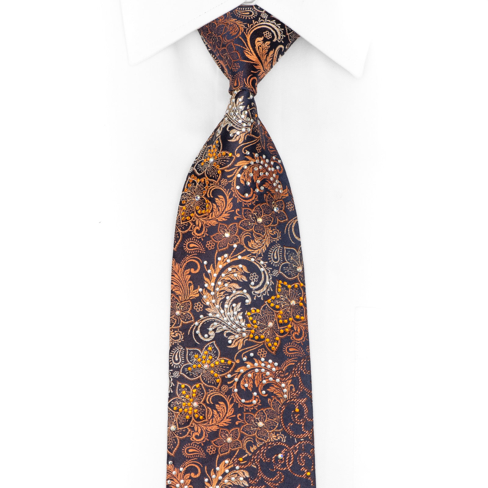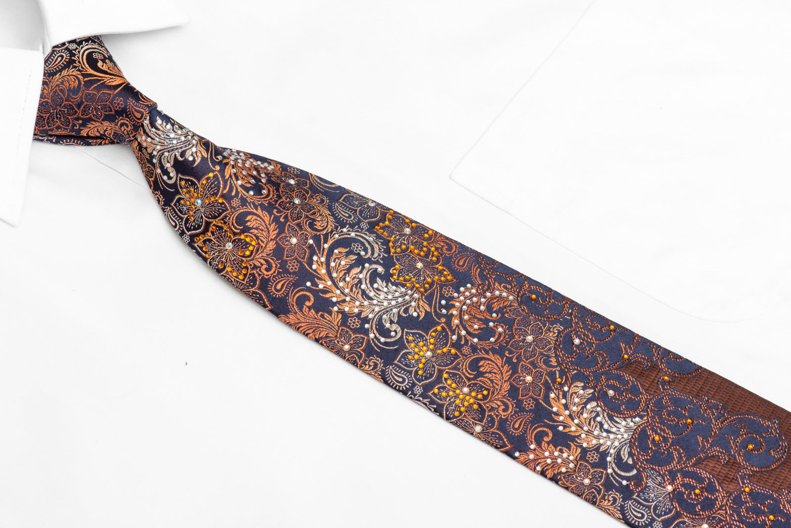 Beautiful men's handmade Rhinestone silk necktie. Presenting a woven orange Acanthus design on navy blue. Sparkling with clear orange and blue crystal Rhinestones with metallic copper sparkles.