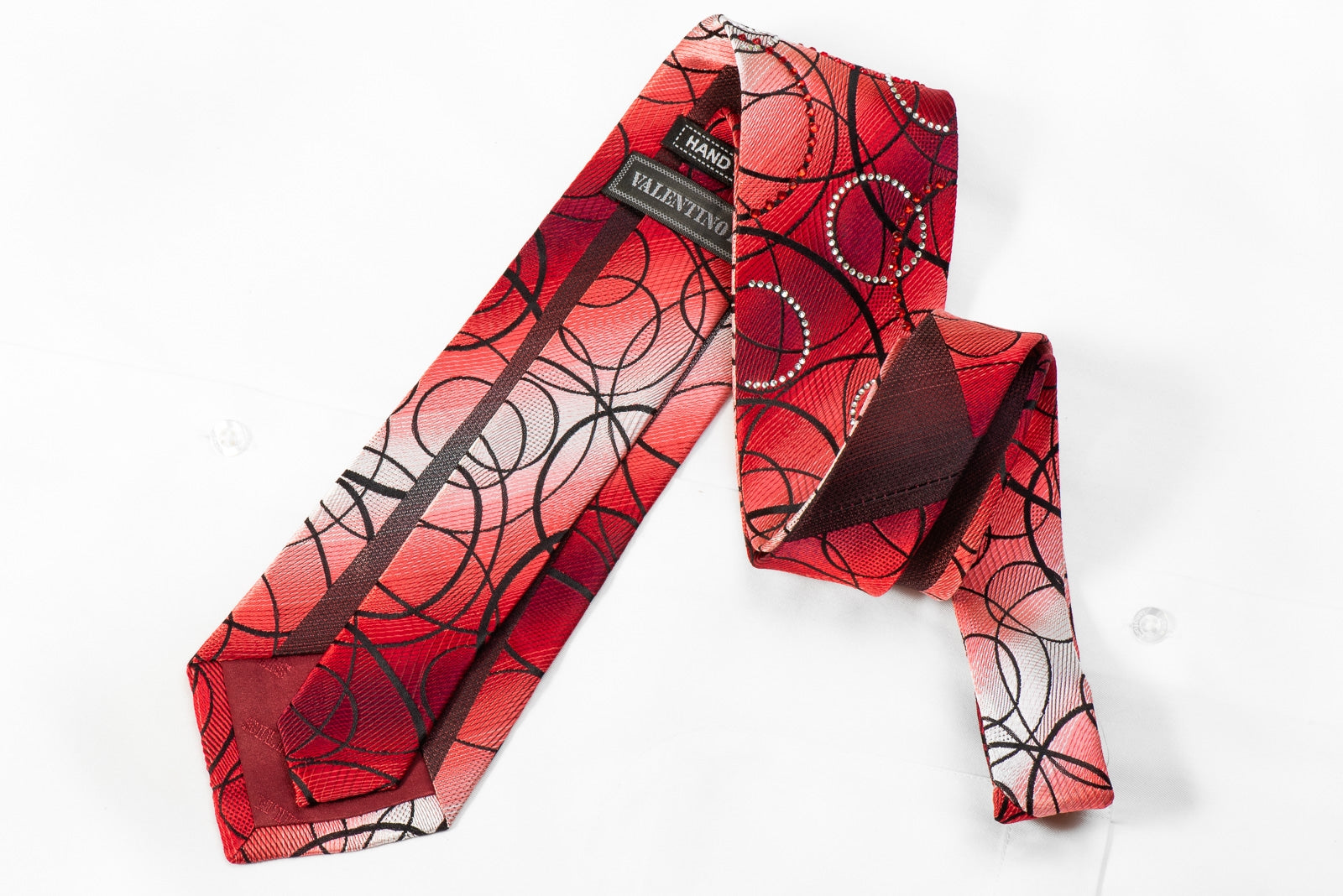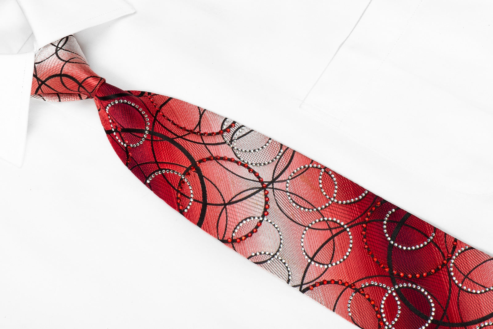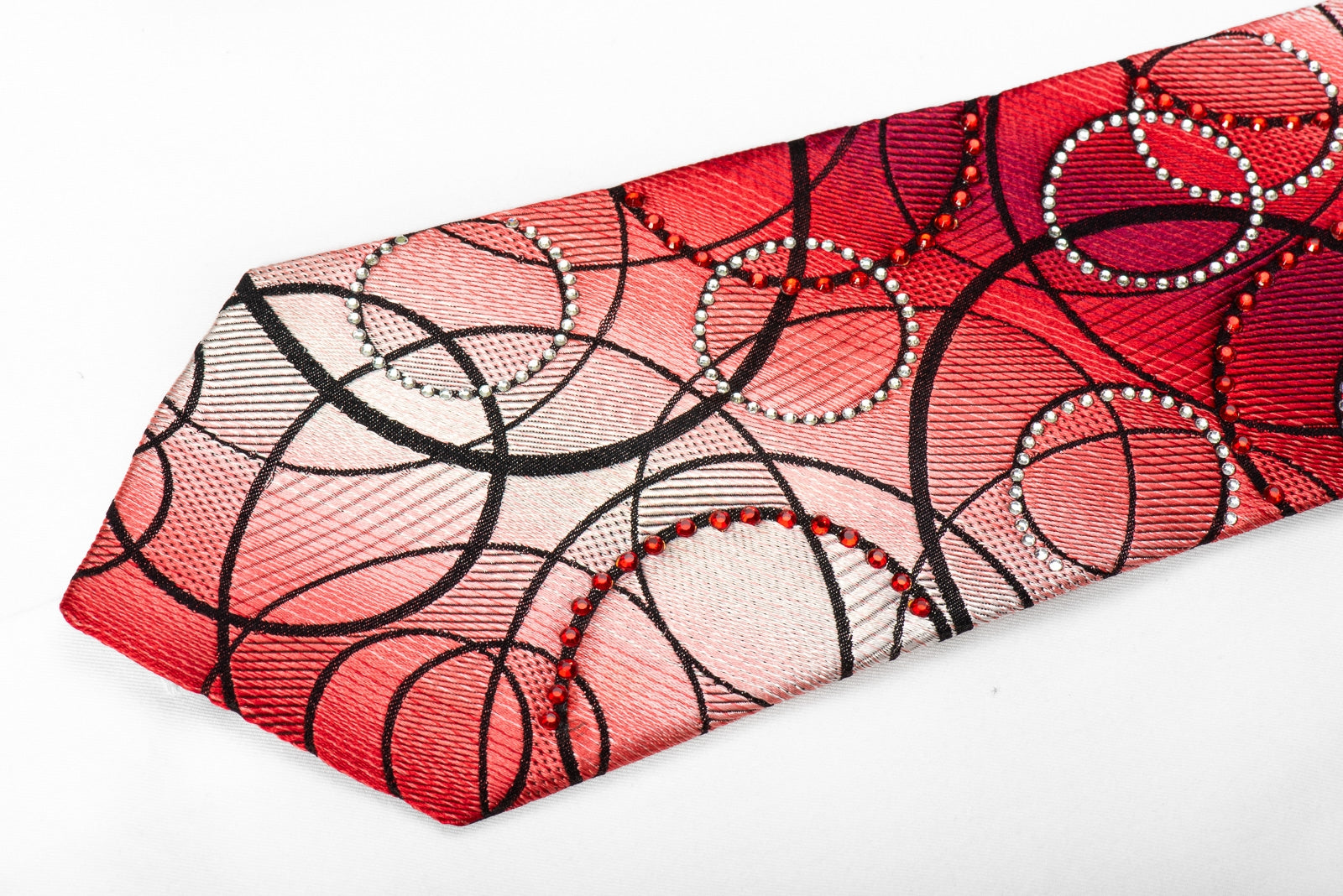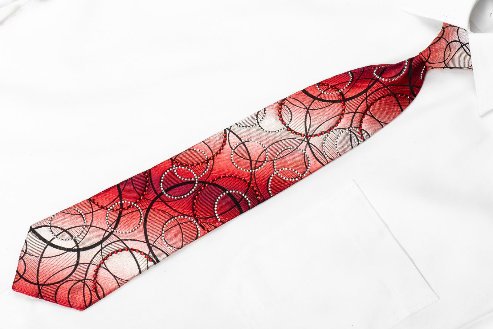 Stylish men's crystal Rhinestone necktie perfect for every occasion handmade from the finest quality silk and designed by top brand name Valentino Rich. Presenting an elegant woven black Geometric Circles design on red, sparkling with clear white, red crystal Rhinestones.