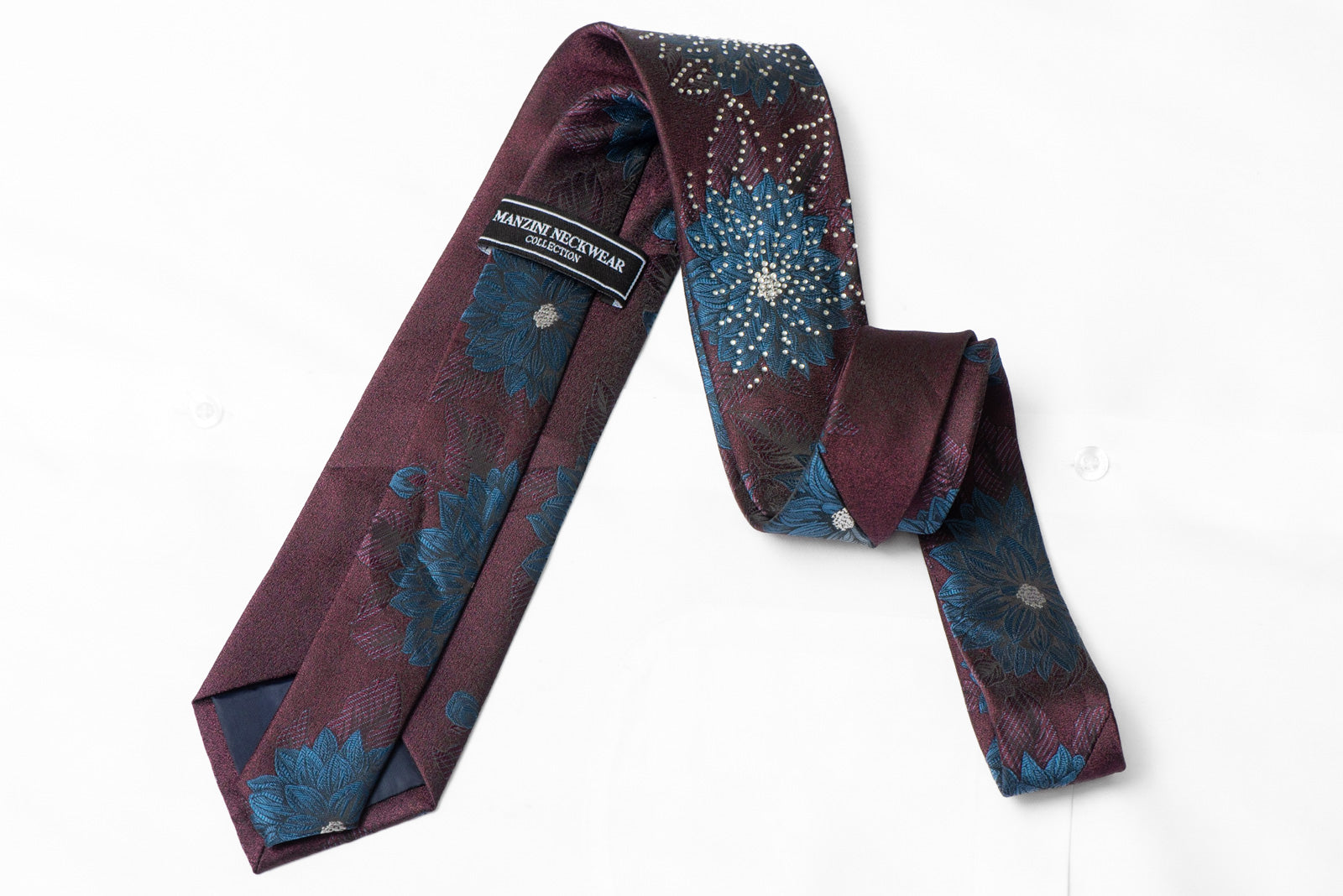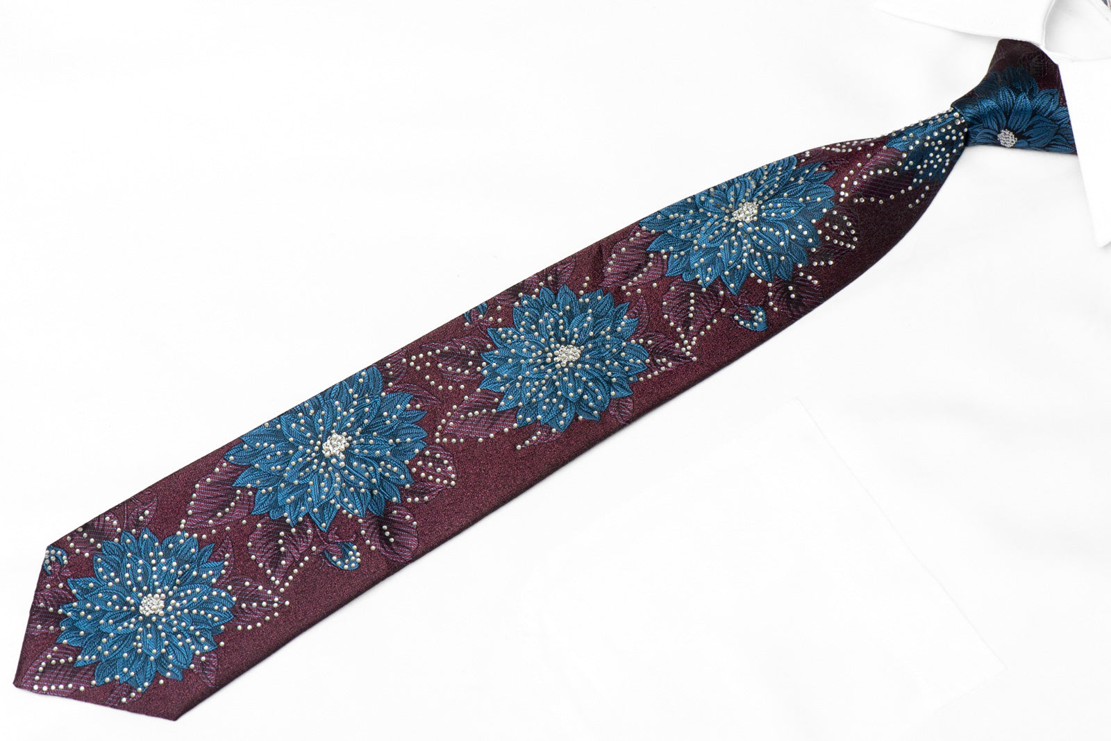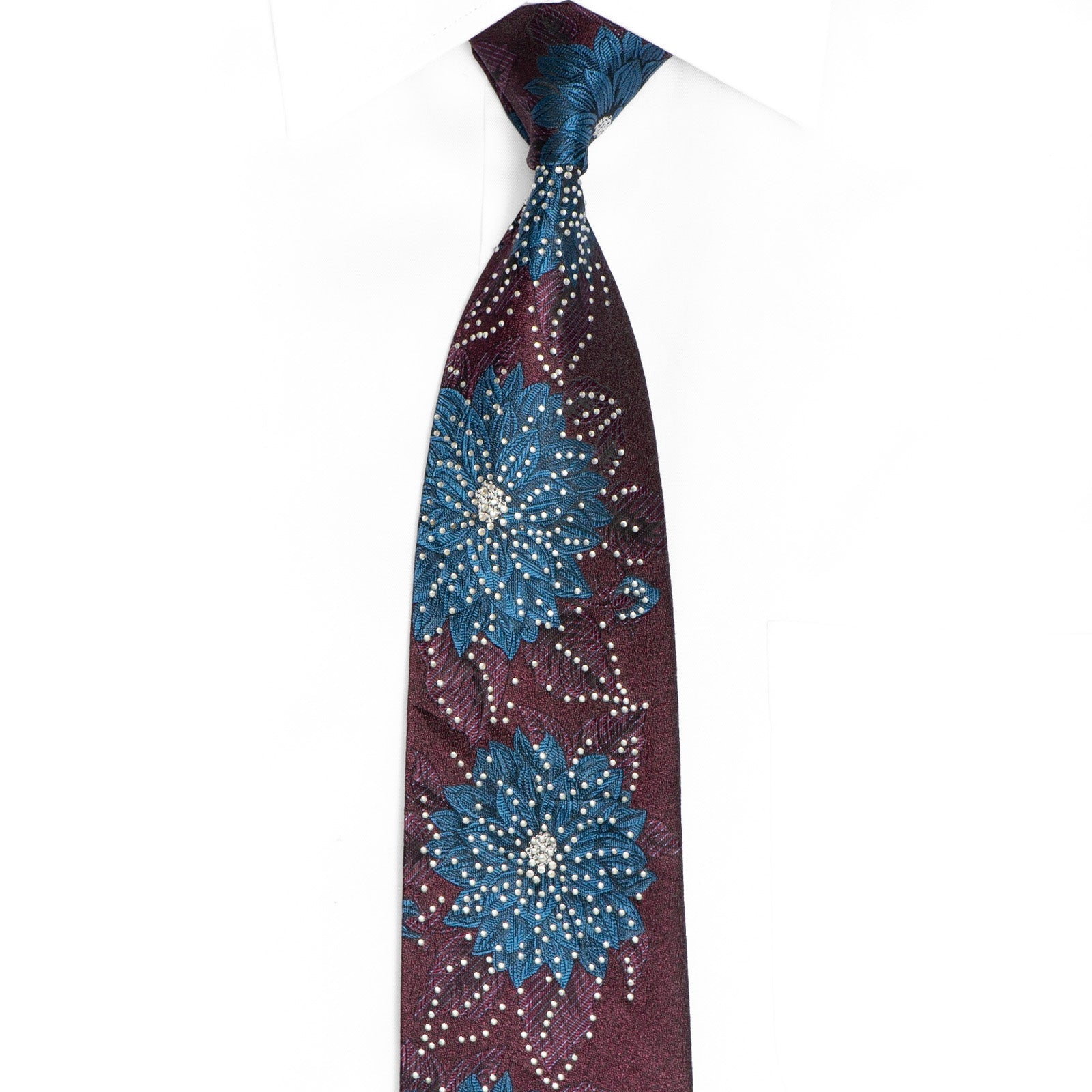 This beautiful necktie features a blue floral pattern on a burgundy background, adorned with sparkling rhinestones. Made with luxurious silk, it's the perfect accessory for any formal event.