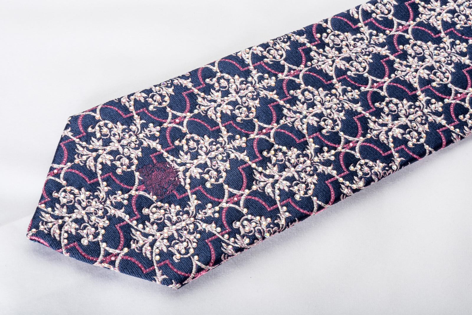 Stand out in a crowd wearing this gorgeous men's woven silk Rhinestone necktie, designed by top brand name Cabrini . Presenting a gorgeous silver Damask design on woven blue silk, sparkling with Rhinestones and silver sparkles.