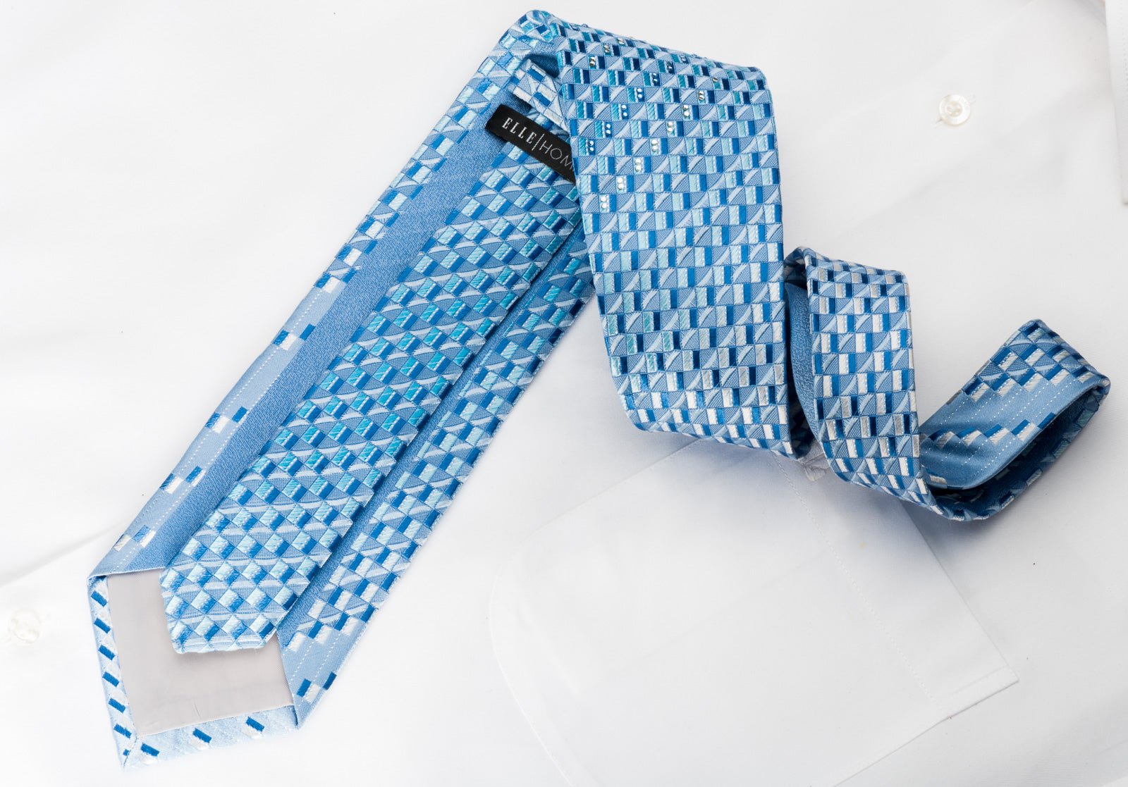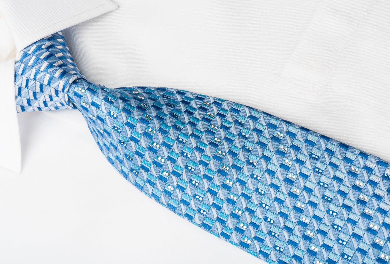 This is a stylish Rhinestone silk necktie perfect on every occasion handmade and designed by top brand name Elle Homme. Presenting an elegant Geometric design on blue woven silk and sparkling with blue, white Rhinestones and silver sparkles.
