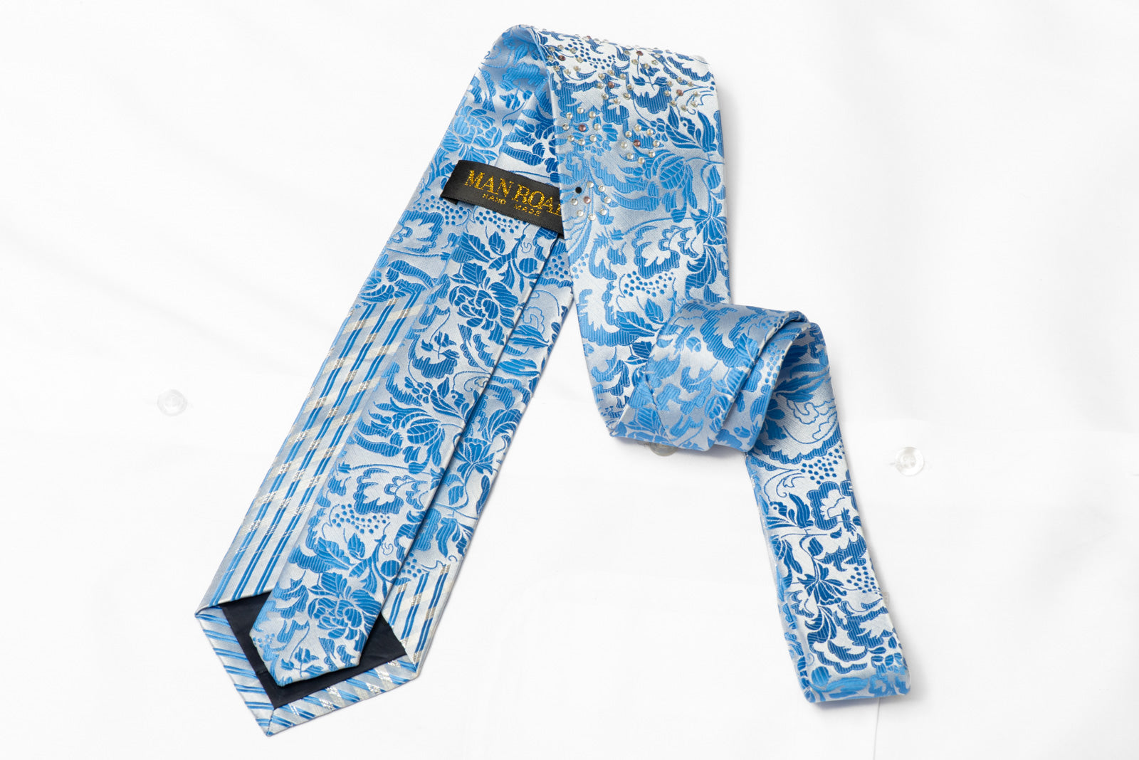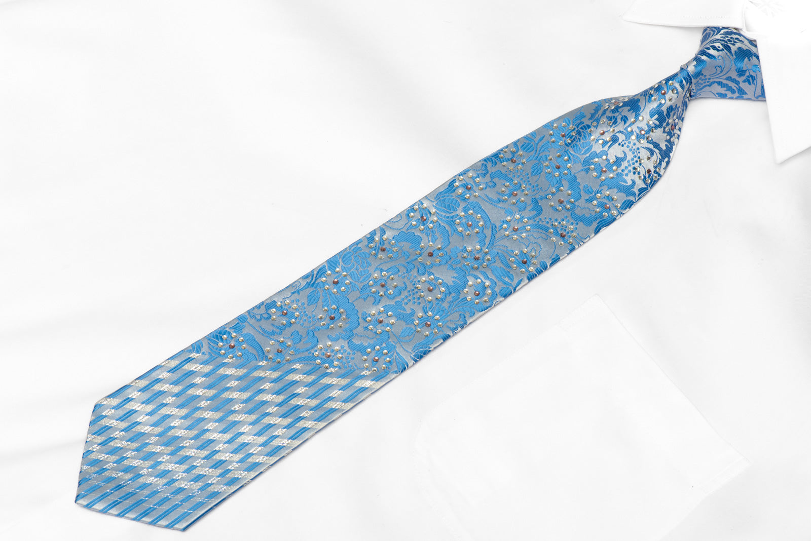 Add a touch of elegance and glamour to your wardrobe with our Floral On Blue Rhinestone Microfiber Necktie, adorned with shimmering silver sparkles. Perfect for any occasion, this tie is sure to make a statement and elevate your style.