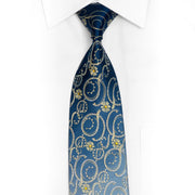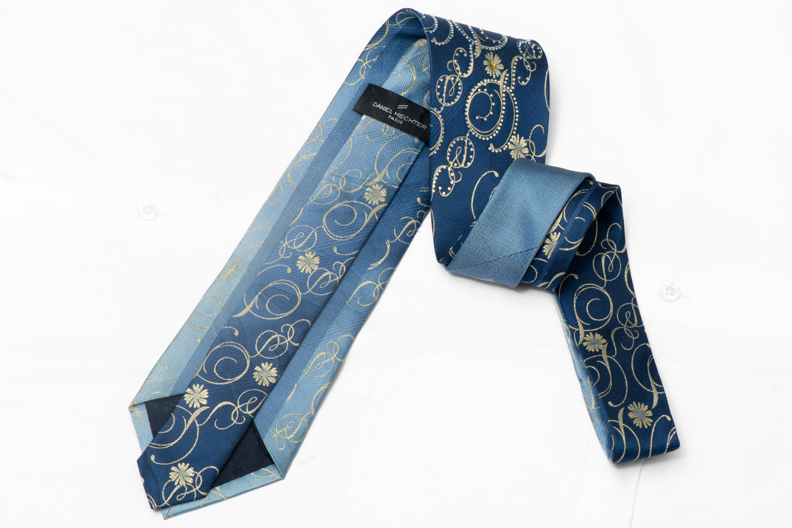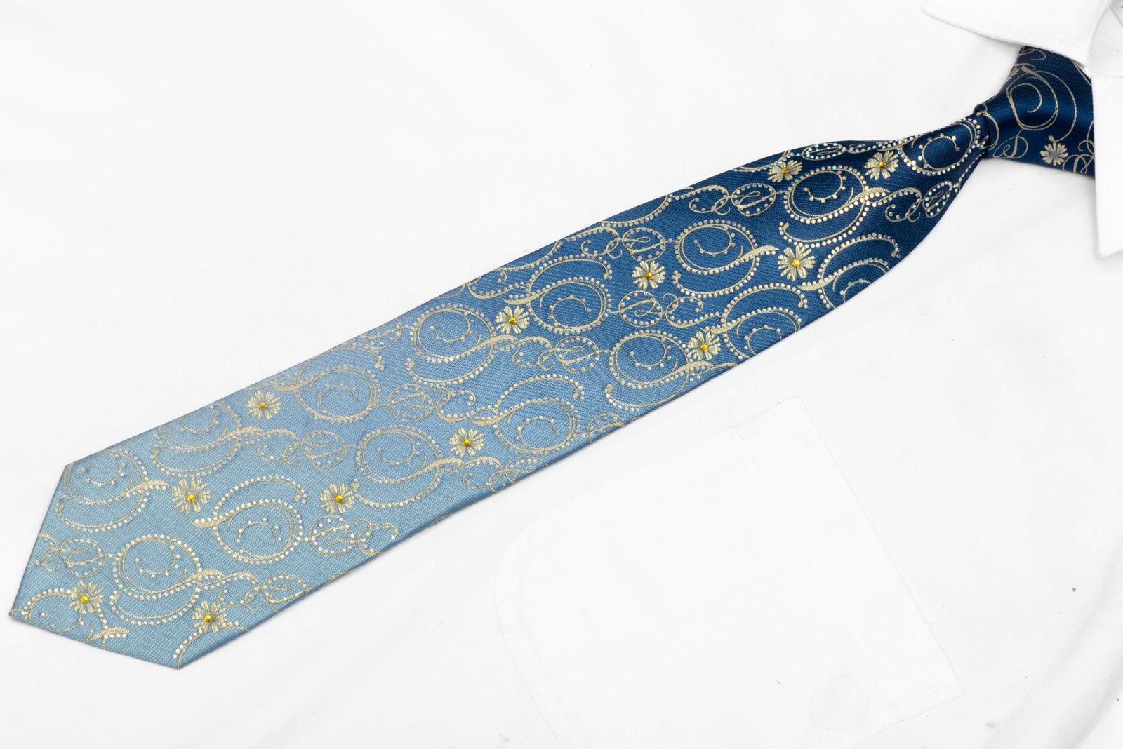 Upgrade your wardrobe with the elegant Gold Floral Scrolls On Blue Rhinestone Silk Necktie. Sparkle and shine with the added touch of gold to complete your stylish look.