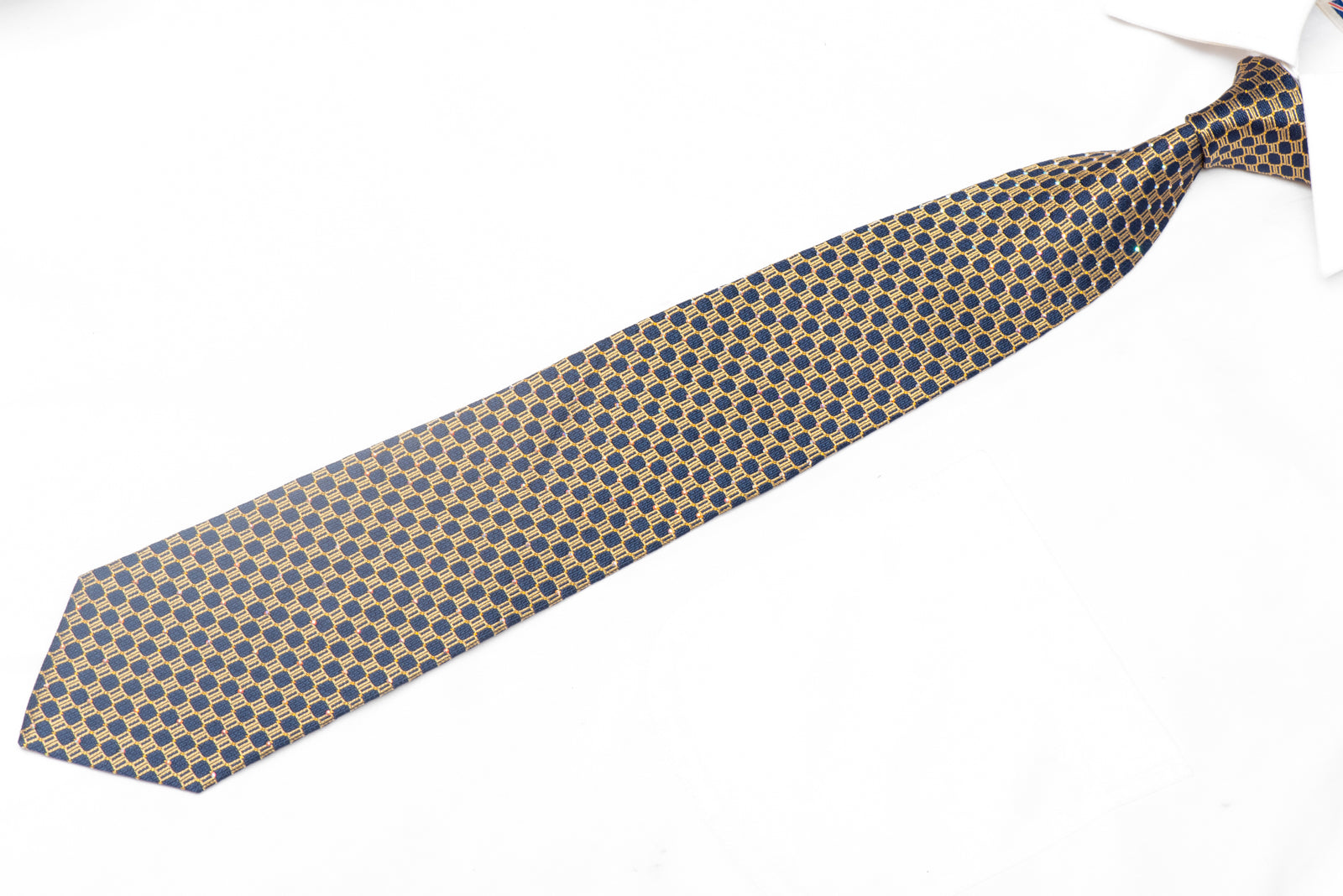 This necktie showcases an elegant gold geometric pattern set against a rich navy blue base, enhanced with rhinestones and shimmering sparkles. It’s an ideal accessory to bring a refined and luxurious feel to your ensemble.