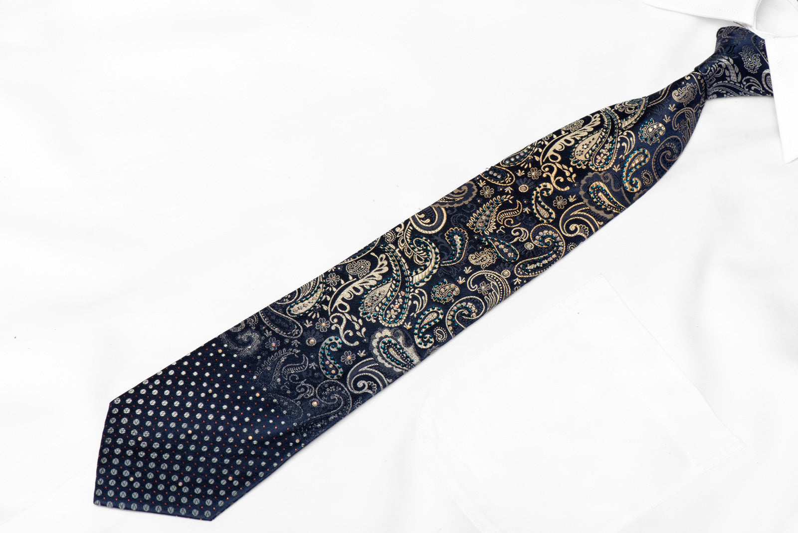 Transform your look with our Gold Paisley On Blue Silk Tie, featuring exquisite rhinestones and gold sparkles. Add a touch of elegance and shine to any outfit.