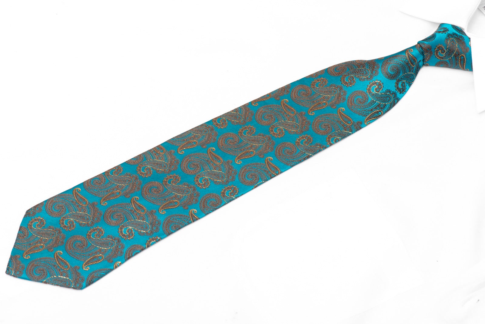 Material - SilkDesign - PaisleyColor - Turquoise, Brown, GoldLength - Classic (48 in.-60 in.)(145cm-153 cm)Width - Classic (3 1/4 in.-3 3/4 in.)(8 cm-9.5 cm)Special Features - Gold Sparkles