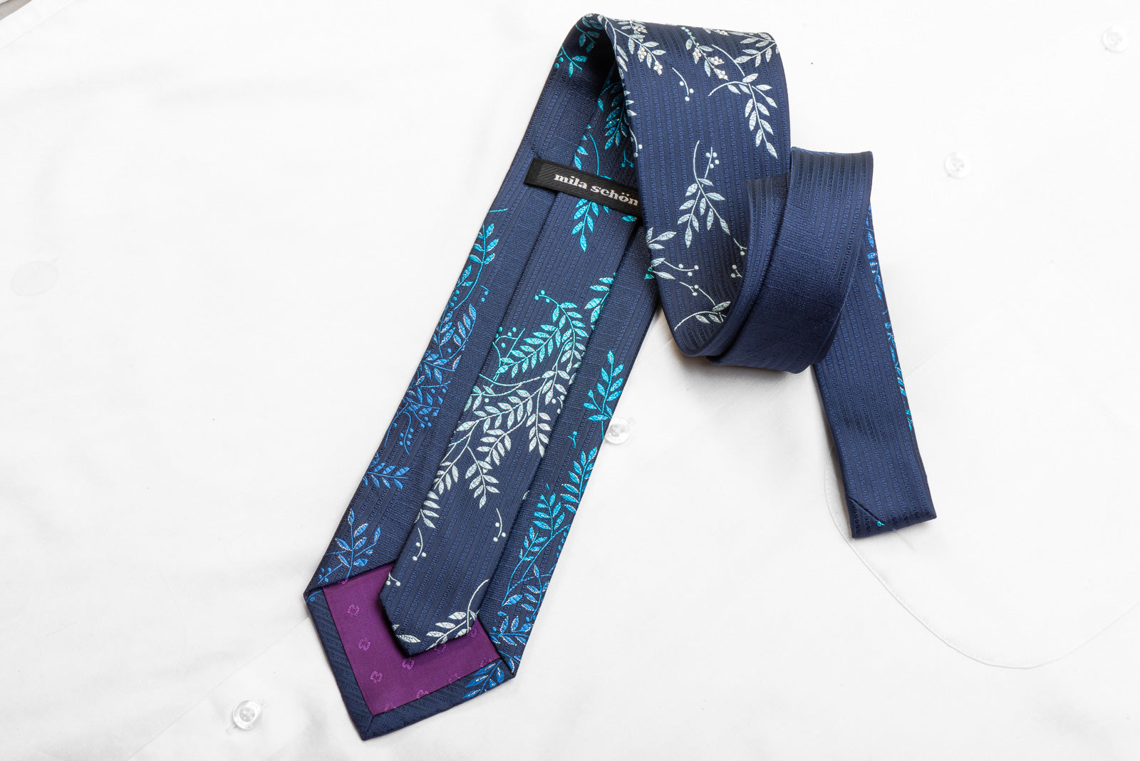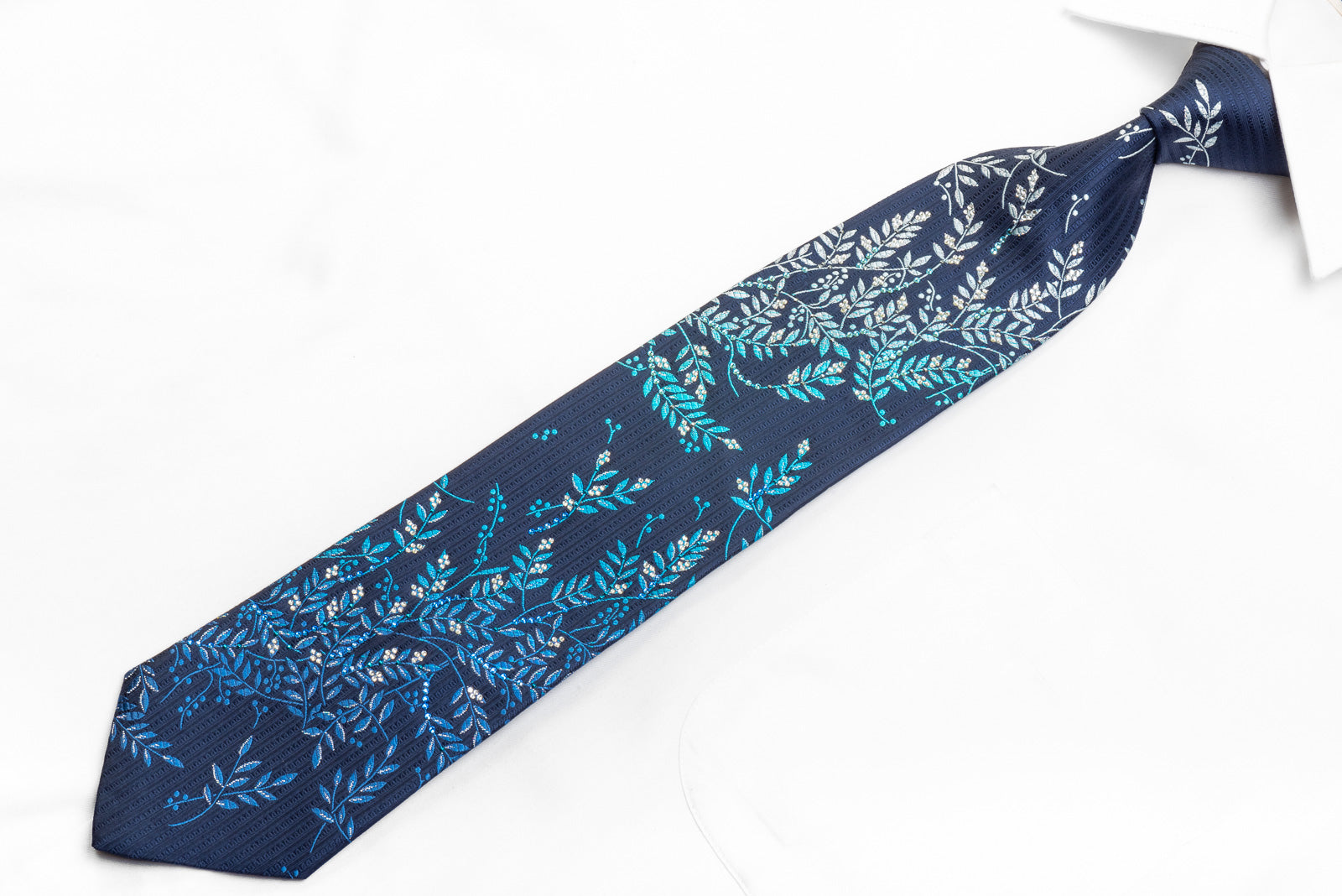 This is a beautiful men's crystal Rhinestone necktie perfect for every occasion handmade from the finest quality silk and designed by top brand name Mila Schon. Presenting an elegant woven Floral design on blue, sparkling with clear blue, white crystal Rhinestones, blue Studs and metallic silver sparkles.