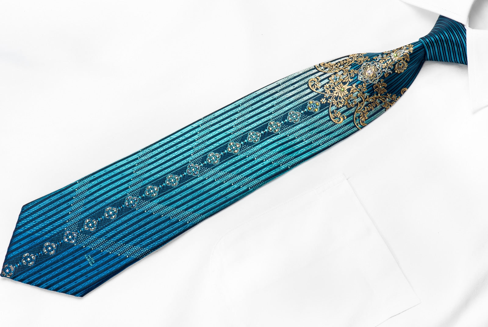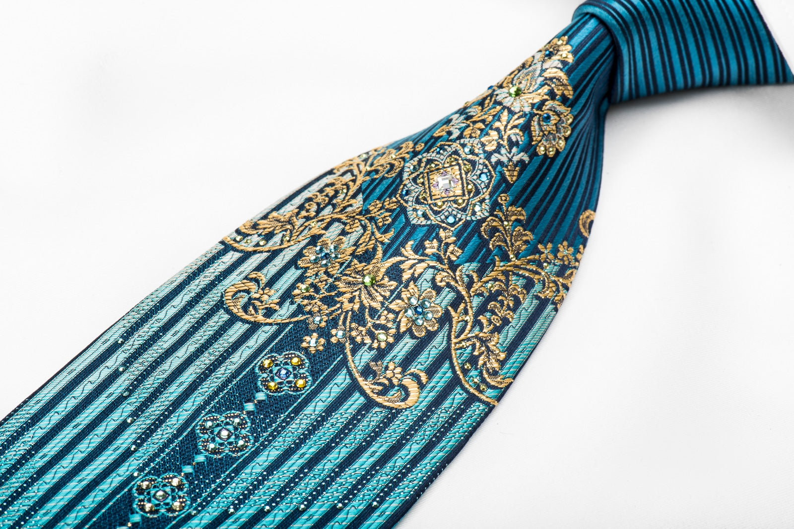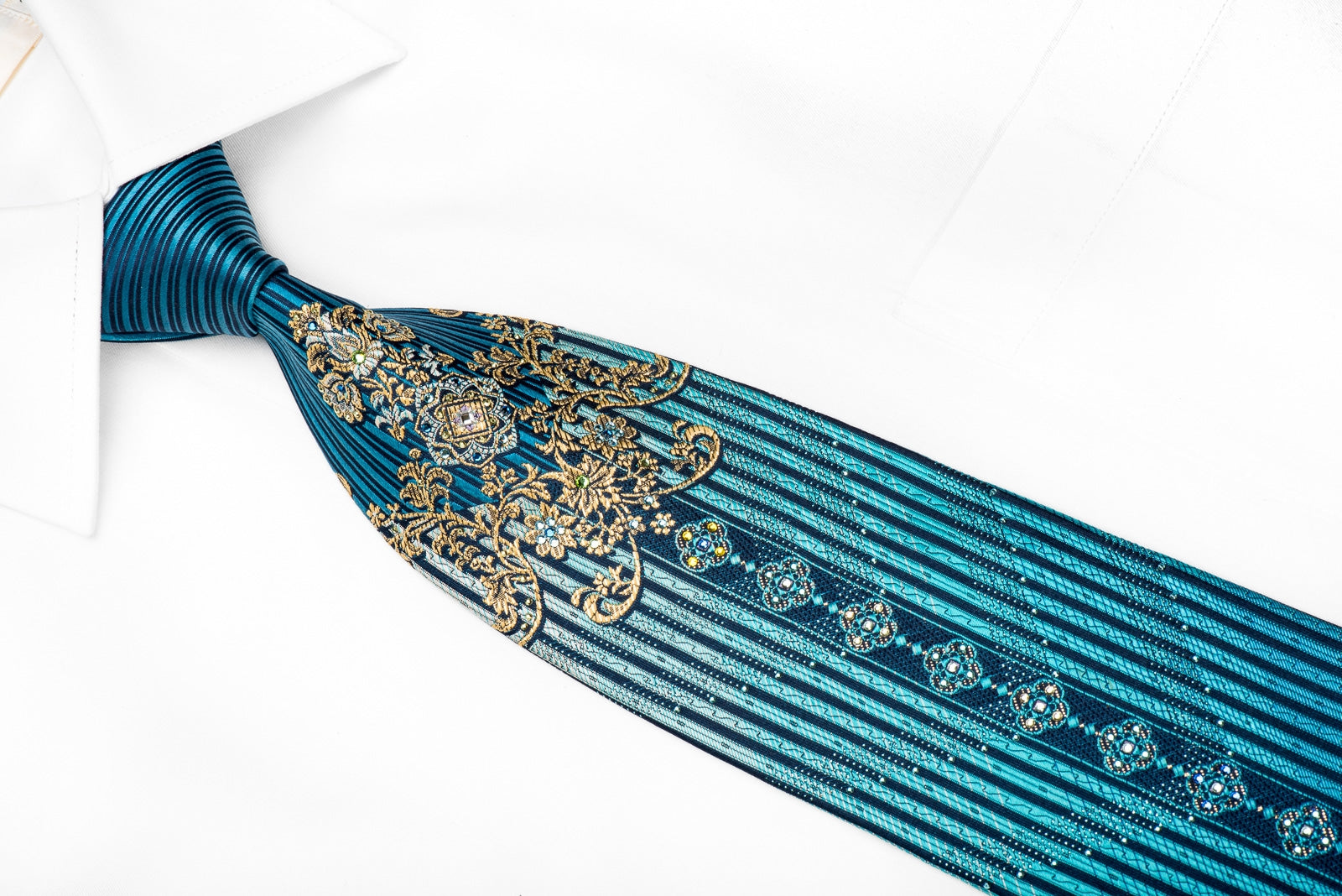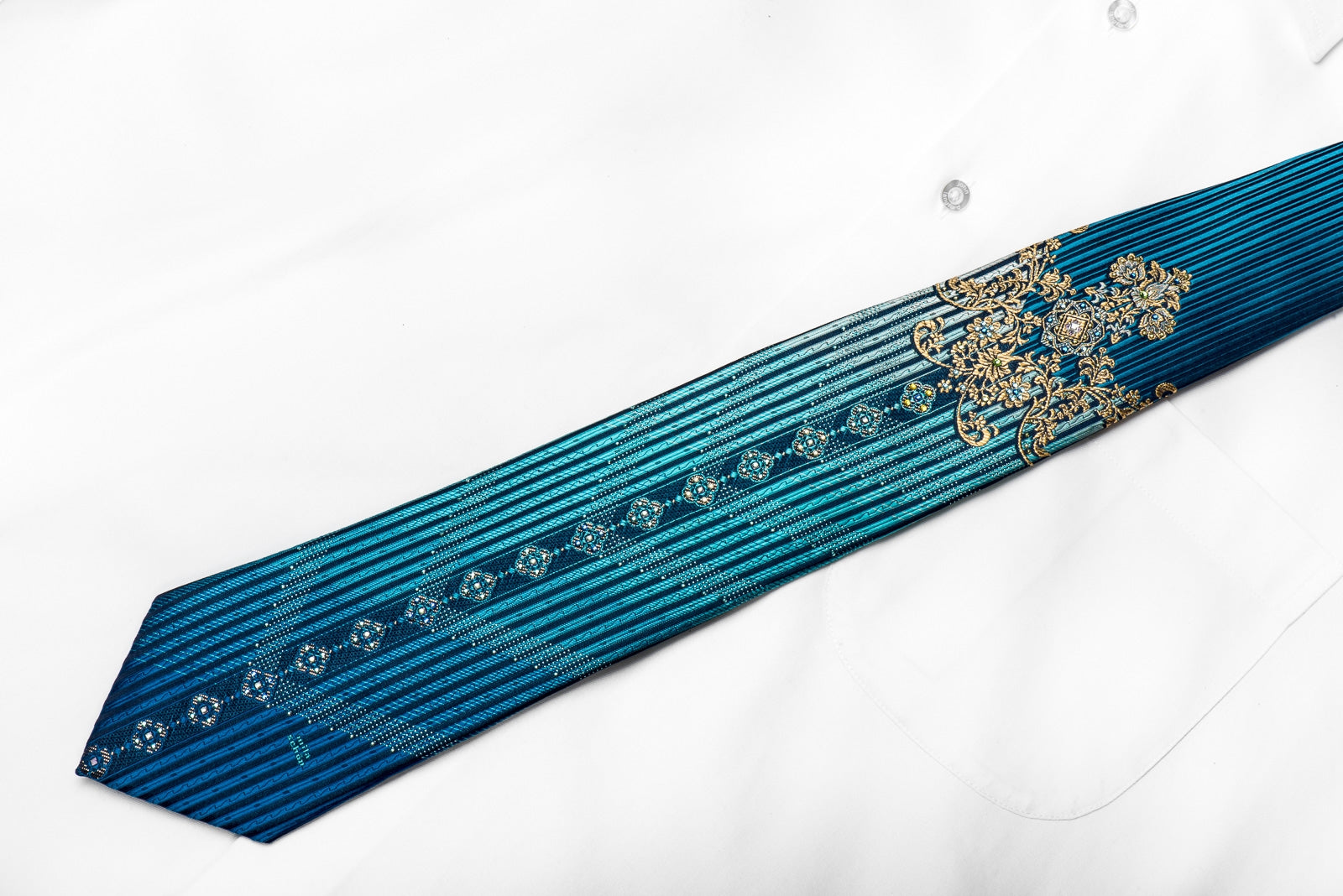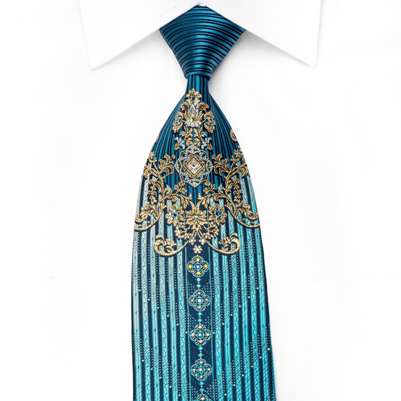 Gorgeous men's crystal silk necktie handmade and designed by top brand name Mila Schon. Presenting a beautiful Gold Cartouche and Vertical Striped design on blue, sparkling with blue, white, green crystal Rhinestones, blue Rhinestuds and metallic blue sparkles.