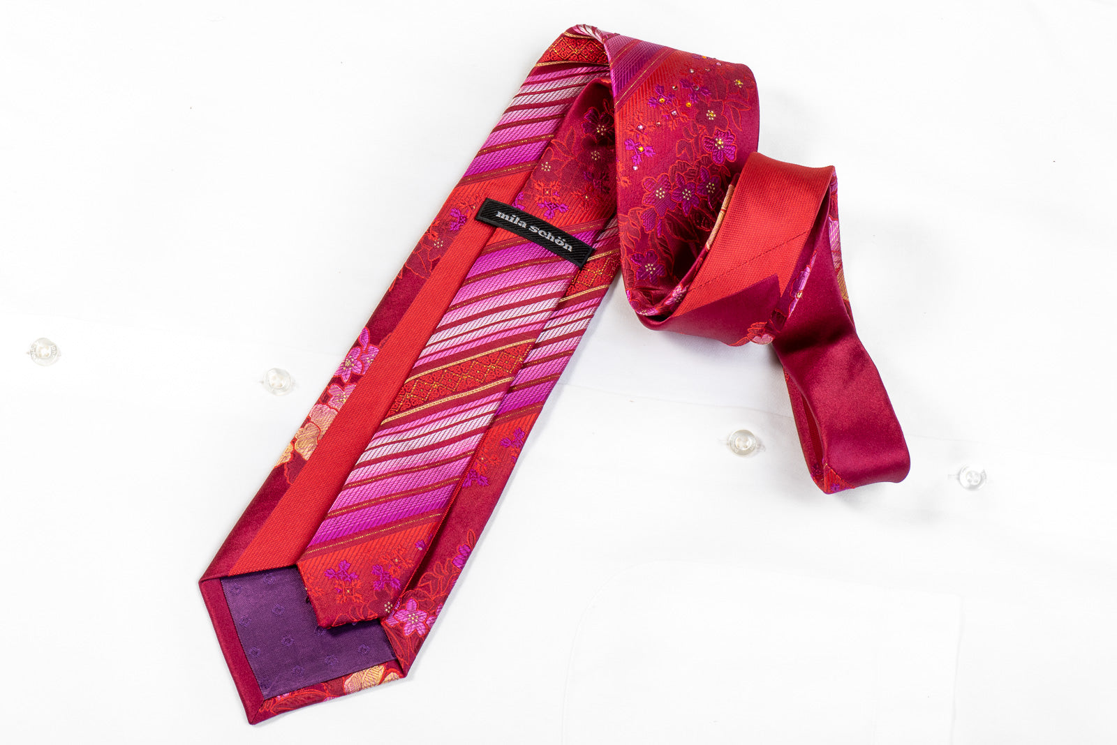Beautiful Rhinestone necktie perfect for every occasion handmade from the finest quality silk and designed by top brand name Mila Schon. Presenting an elegant woven purple Floral and Striped design on burgundy, sparkling with crystal rhinestones, gold studs and embellished with metallic silver sparkles.