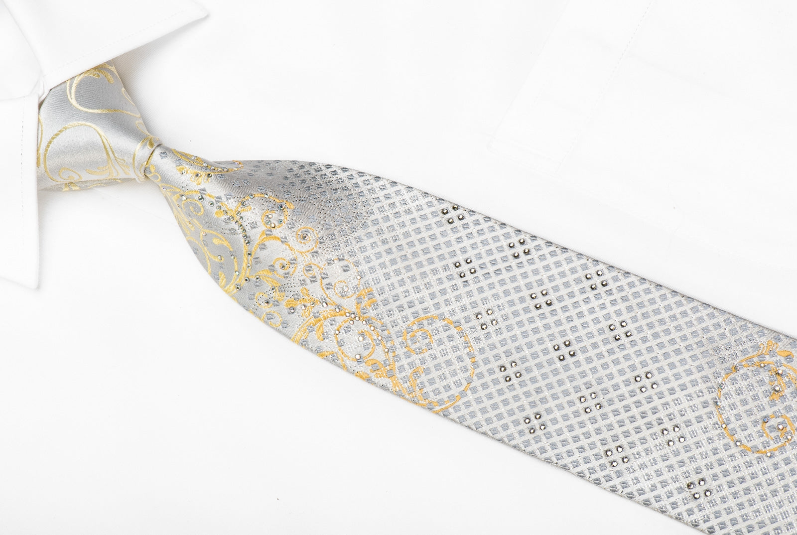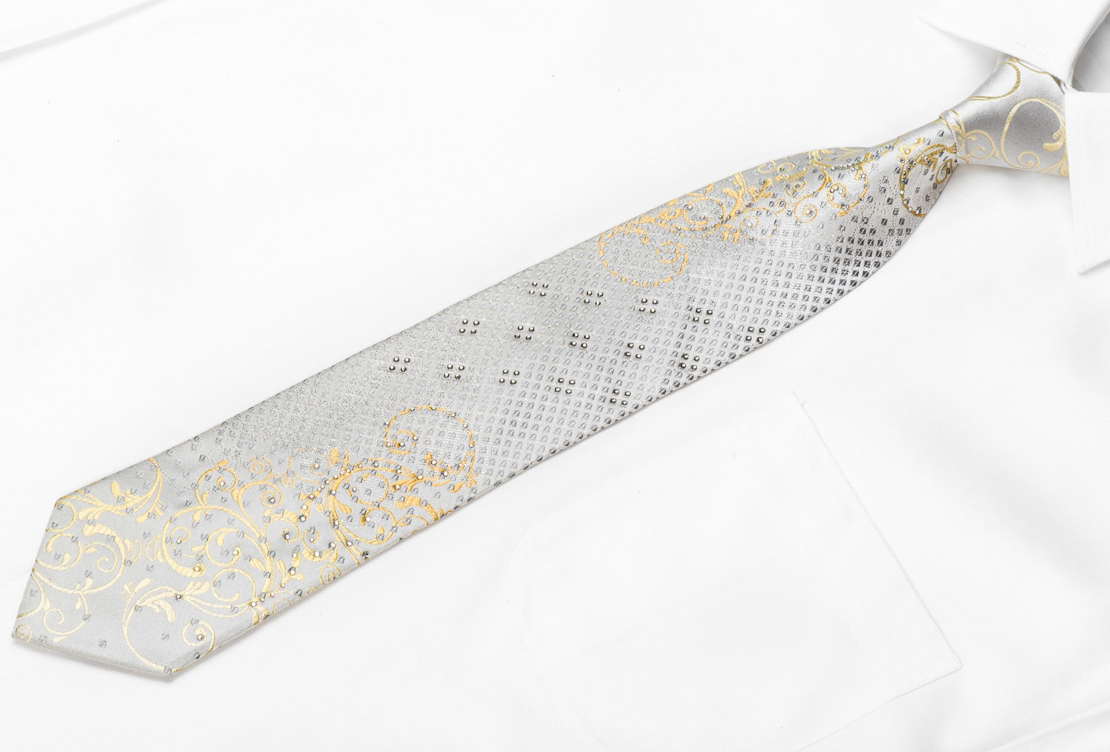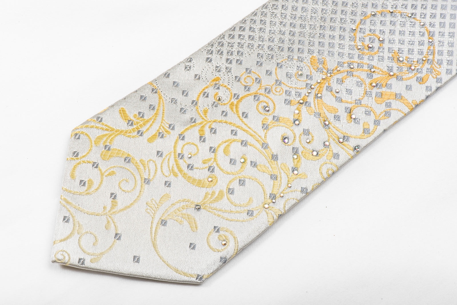 Nicole St Giles Men's Crystal Silk Tie Golden Scrolls On Silver White With Sparkles